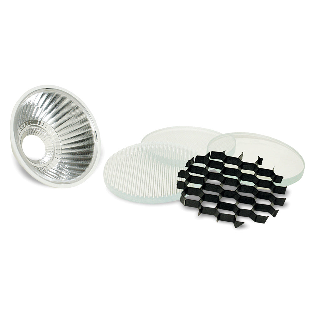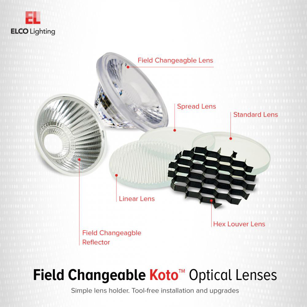 Improve performance and flexibility with this set of Koto™ Accessories from Elco Lighting, customizing your lighting installation. A lighting project comes together with a kit including a louver, linear lens, spread lens, diffuser lens, and a color shifter lens. Also included is a field changeable lens and reflector, a snoot for glare control, and two color lenses.