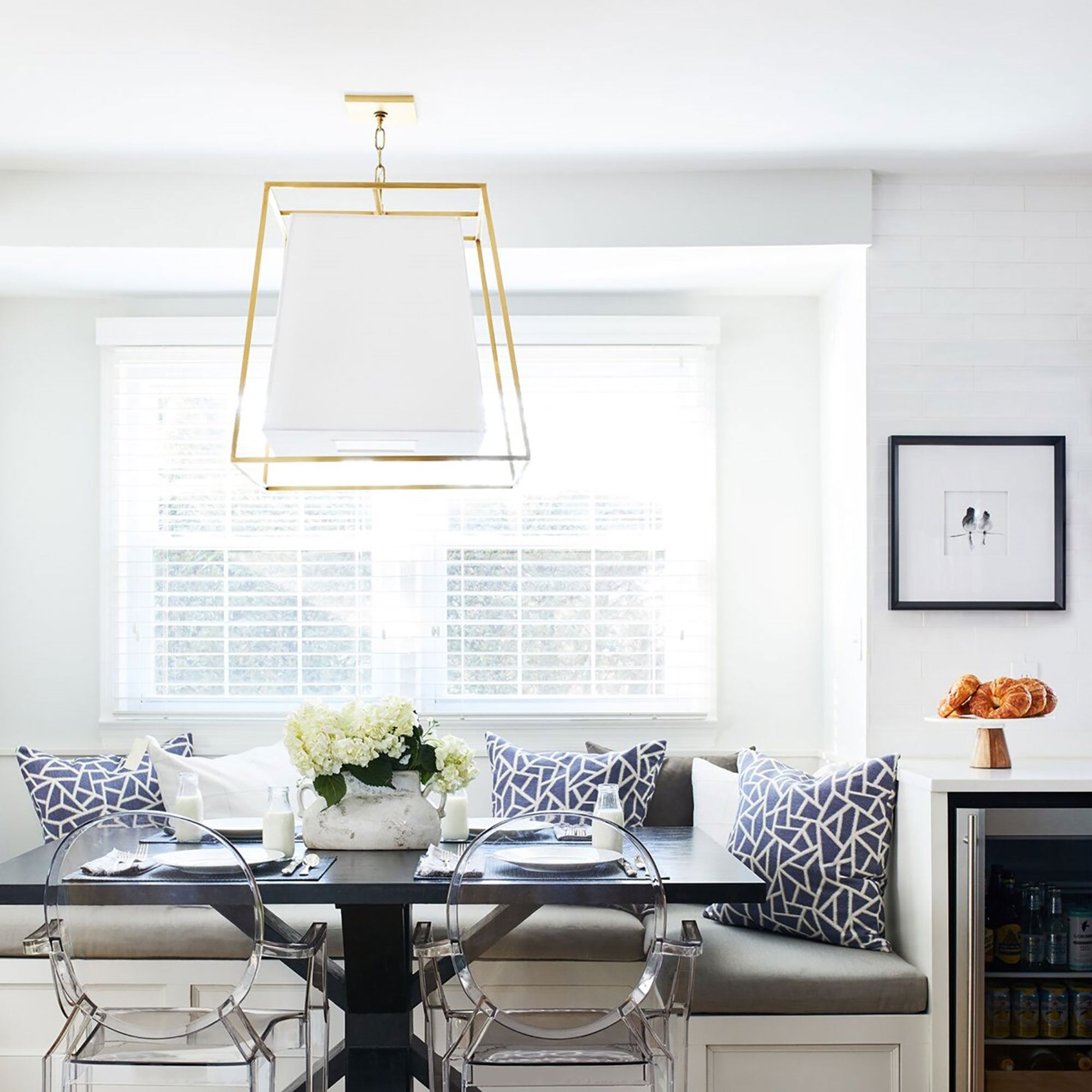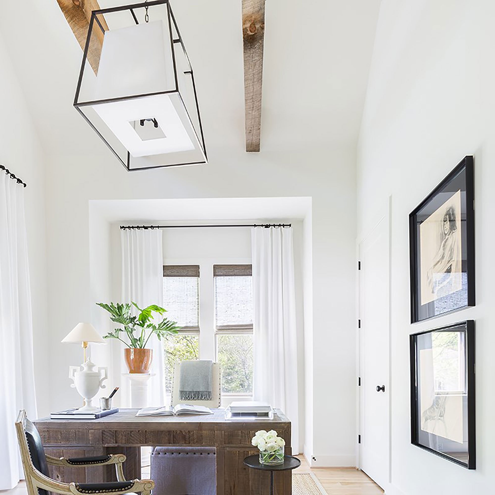 Appealing contrasts add dimension to Kyle’s geometric minimalism. We suspend the smooth expanse of the shade within an airy frame of cast metalwork. The open space between the matching shapes emphasizes the inherent beauty of Kyle’s geometric form.