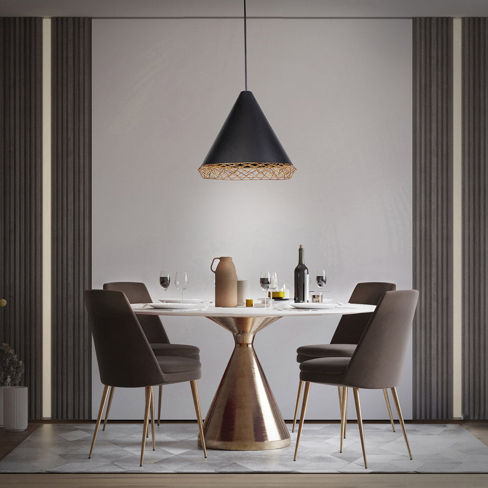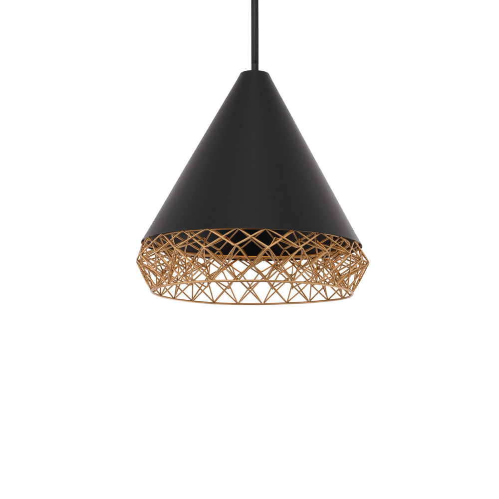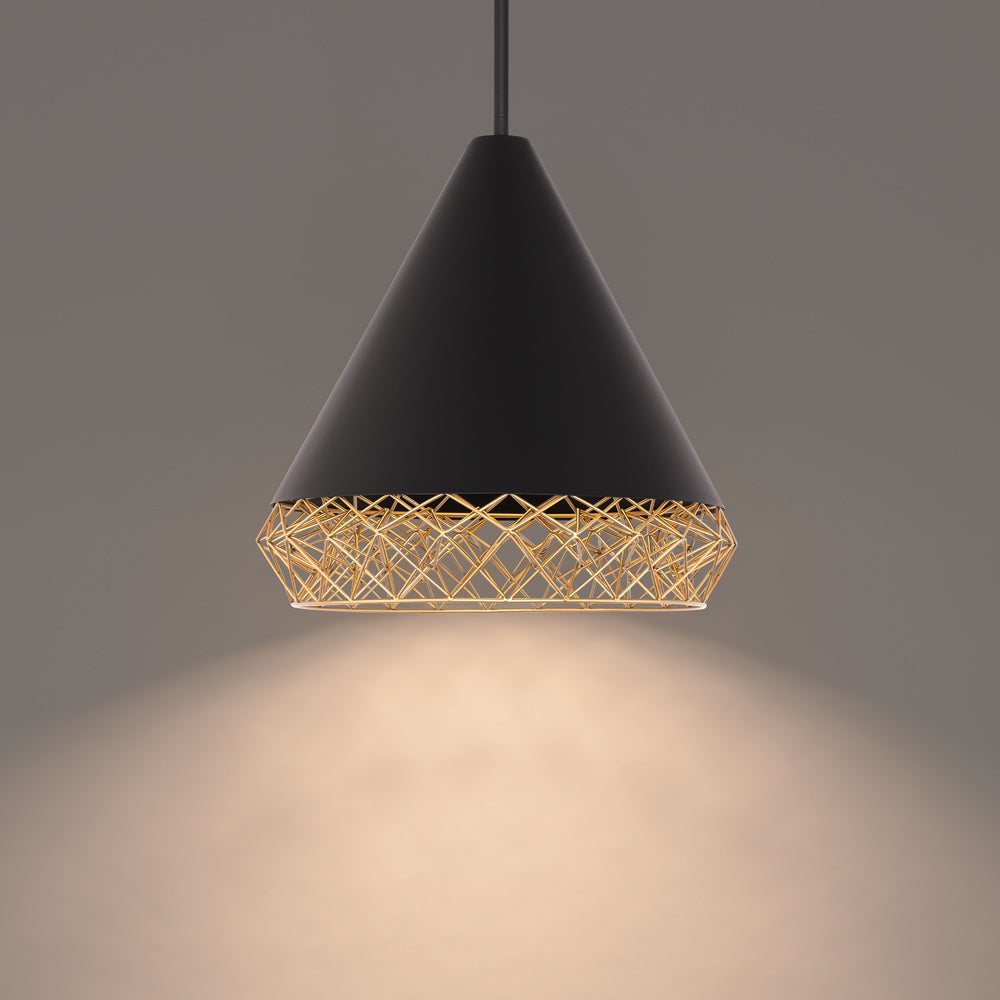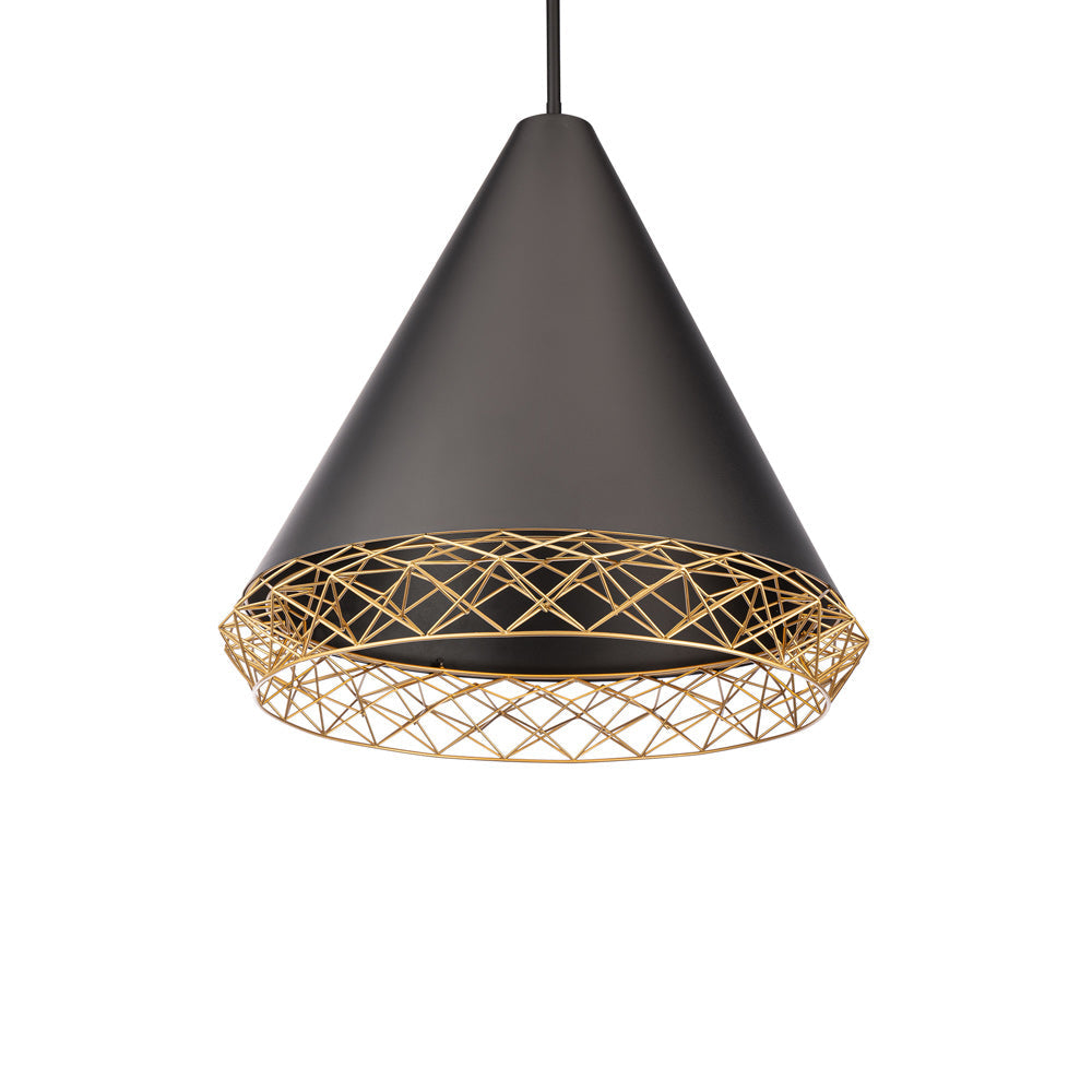 Artisan glam takes a page from crisp geometric ambiance to fashion a decadent light fixture worth of placement in a custom setting. The Lacey LED Pendant Light from dweLED offers a sleek conical shade made of bold black finish metal, as gleaming gold mesh wire-like banding infuses a touch of industrial farmhouse style. Choose this energy-efficient fixture to embellish a tastefully crafted interior design scheme with accent lighting.