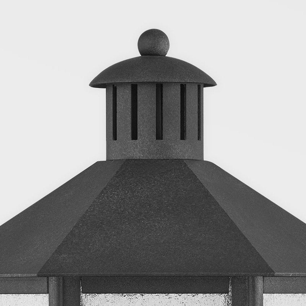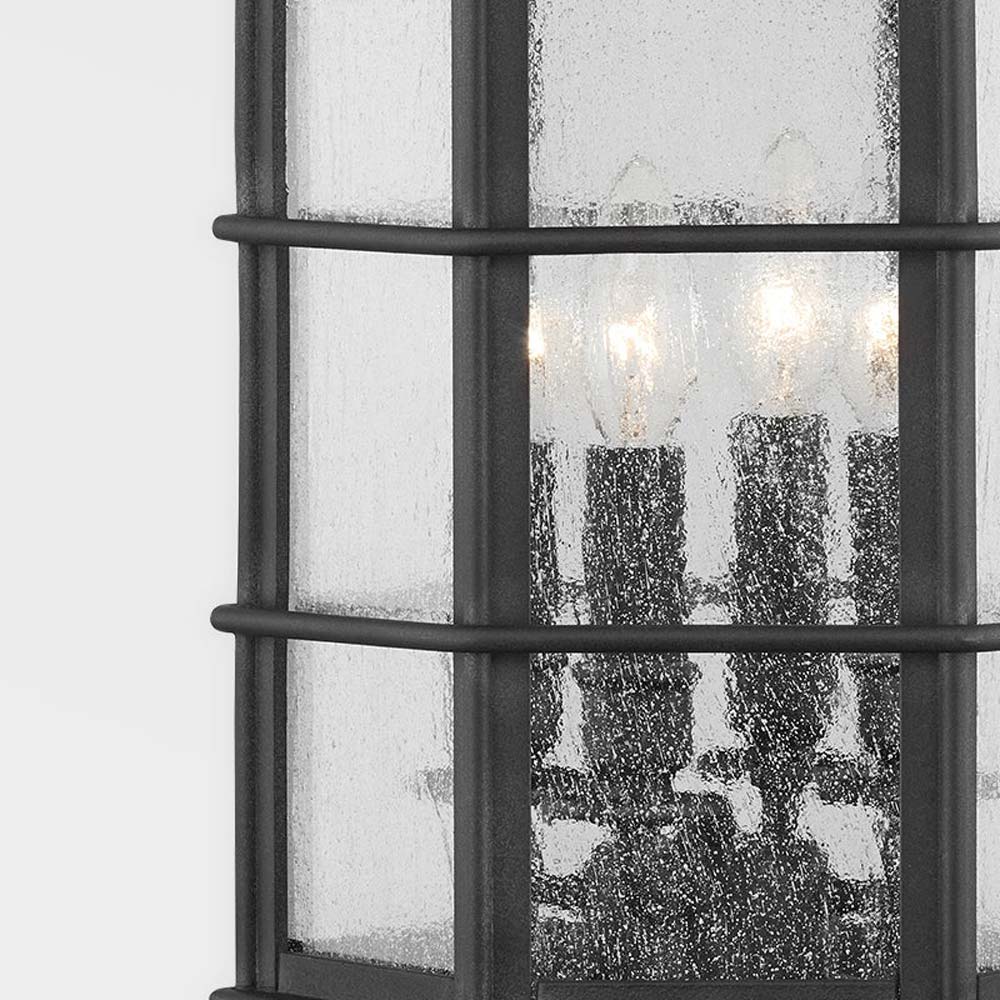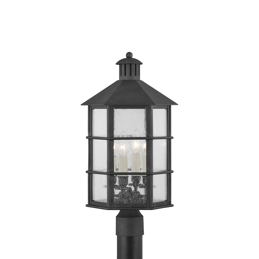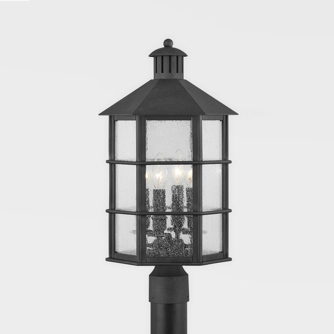 Sophisticated repurposing of a lantern motif makes a significant splash as the Lake County Outdoor Post Light from Troy Lighting creates a stately motif. Lush gardens and walkways become visible in dark conditions when this post light presents sophisticated beauty. French iron finish metal with a cage-like structure is multi-faceted, offering a soft view of a candelabra mount sheltered by elegant glass.