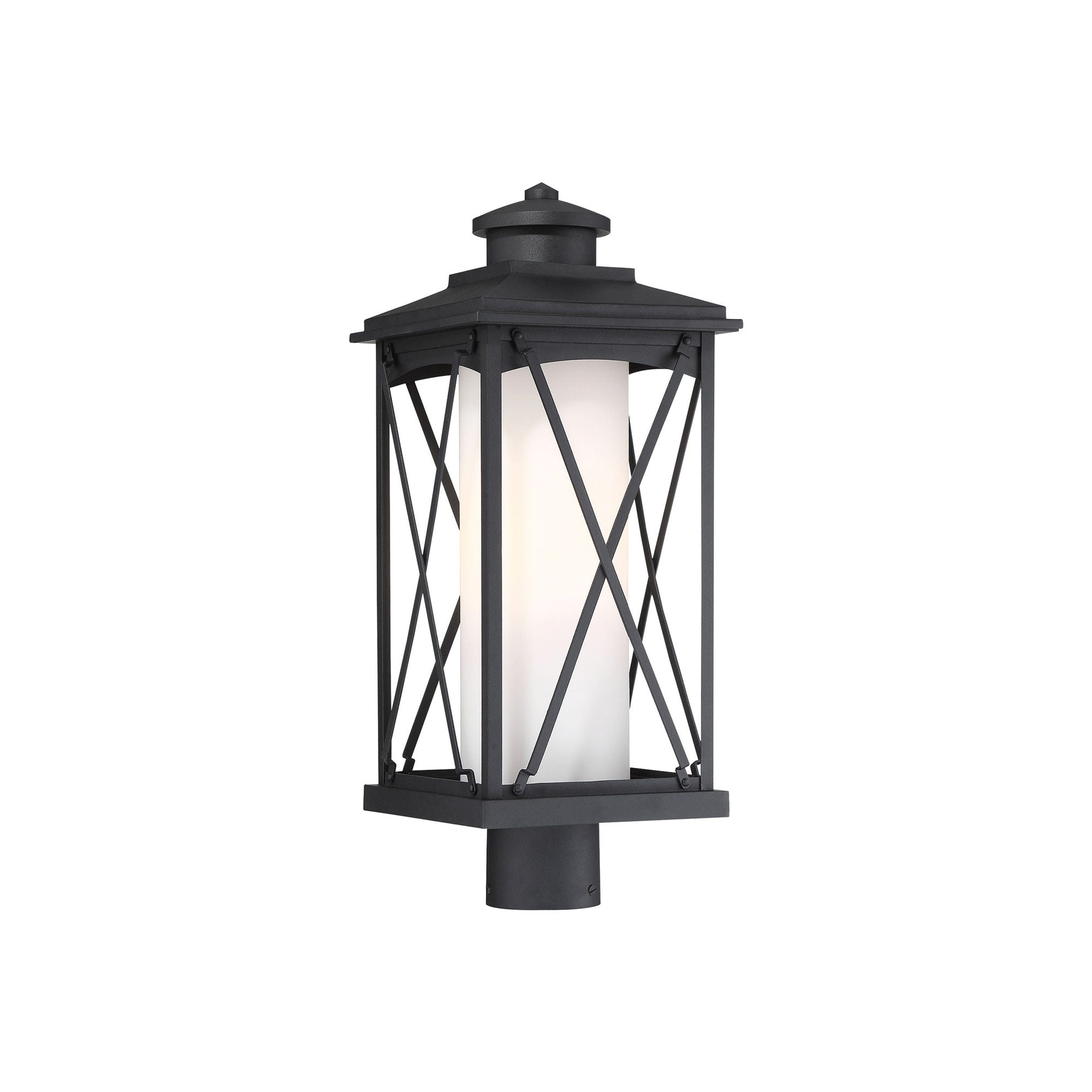 Crisp style elements take on geometric intrigue in an exterior post light that offers a design edge to a yard space, garden, or walkway. The Lansdale Outdoor Post Light from The Great Outdoors features openwork metal with a busy dynamic and construction of matte black finish metal. An etched opal glass cylinder shade repurposes this village-inspired light with a glowing dose of artistry.