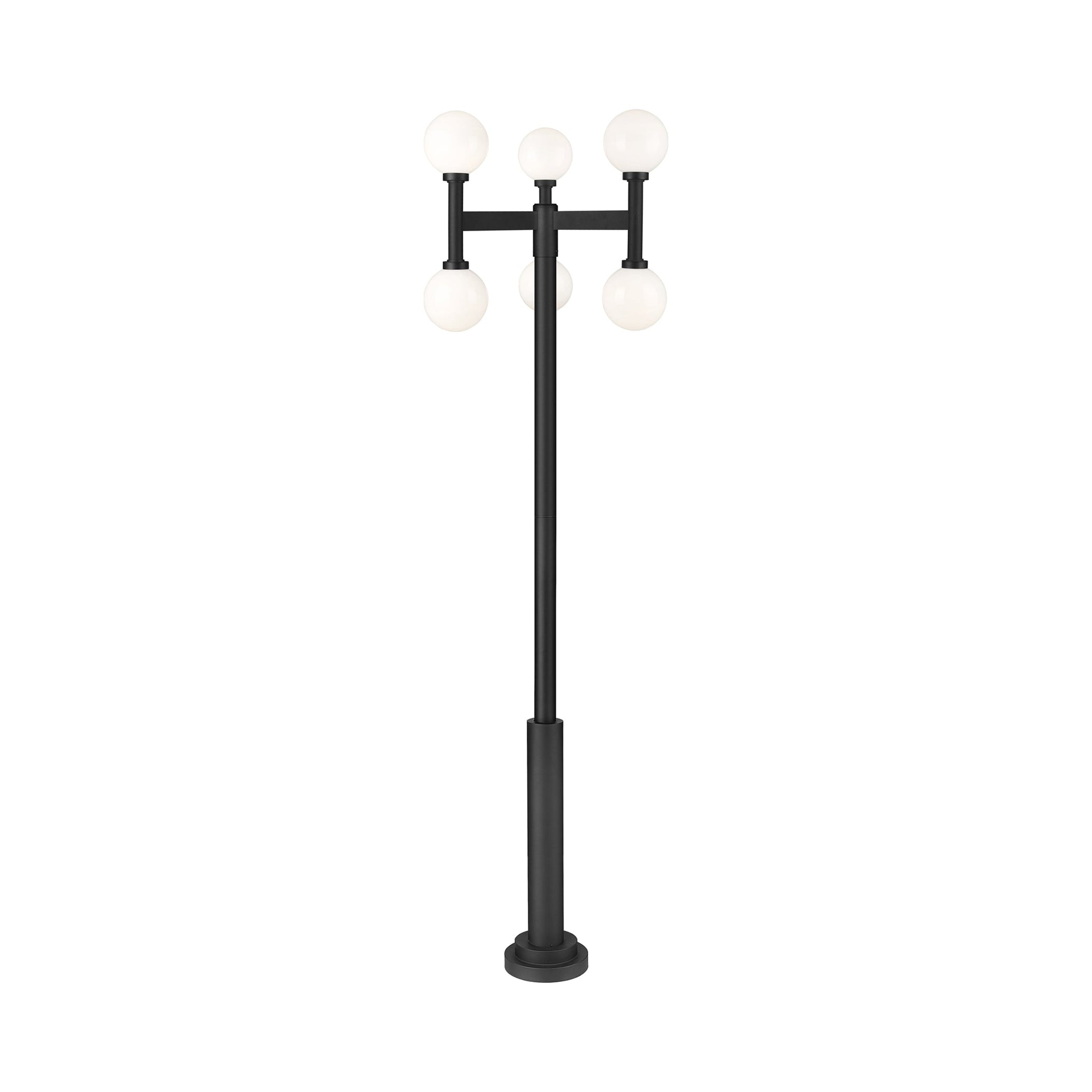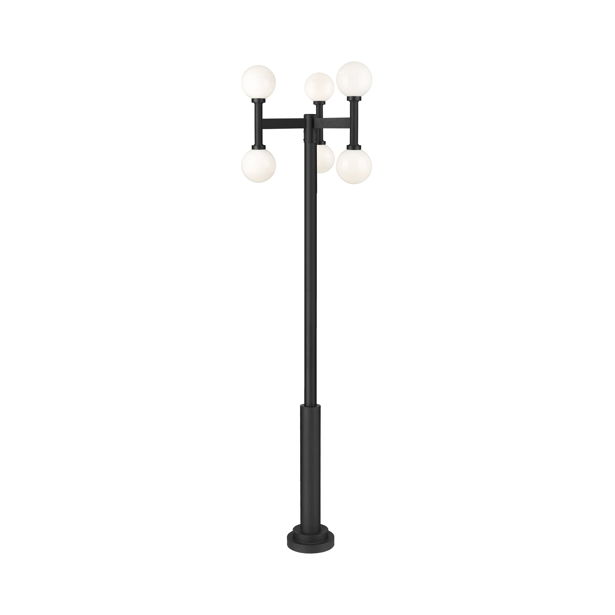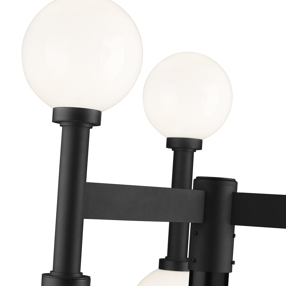 Three vertical arms, each with a balanced pair of spherical shades, create a striking effect for the Laurent Outdoor Vertical Post Light from Z-Lite. Its black finish is rich and versatile, while globe shades in opal glass cast a soft, inviting glow across walkways, patios and garden beds. The six-light fixture is an impressive addition, complete with a round post with decorative details that enhance without overwhelming.