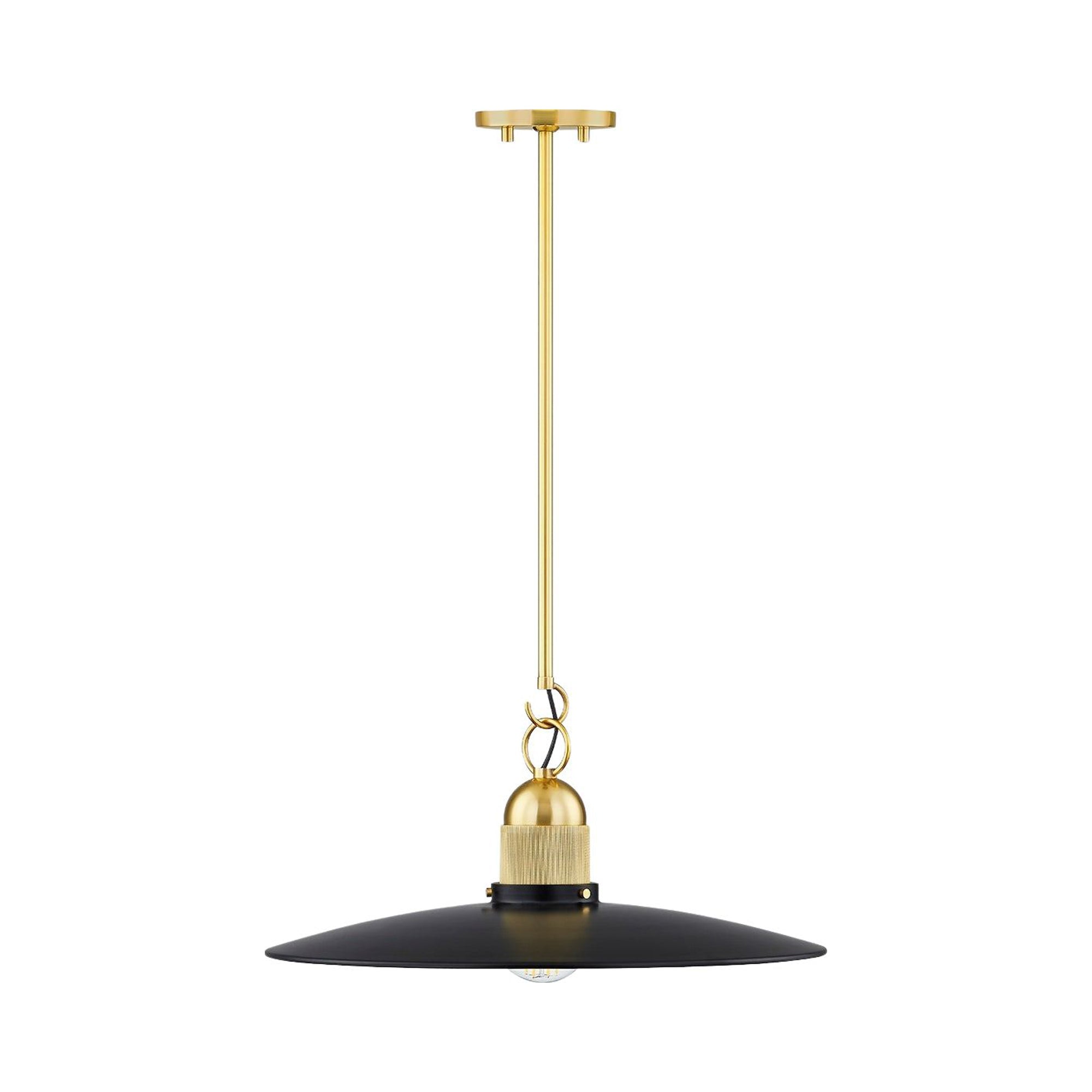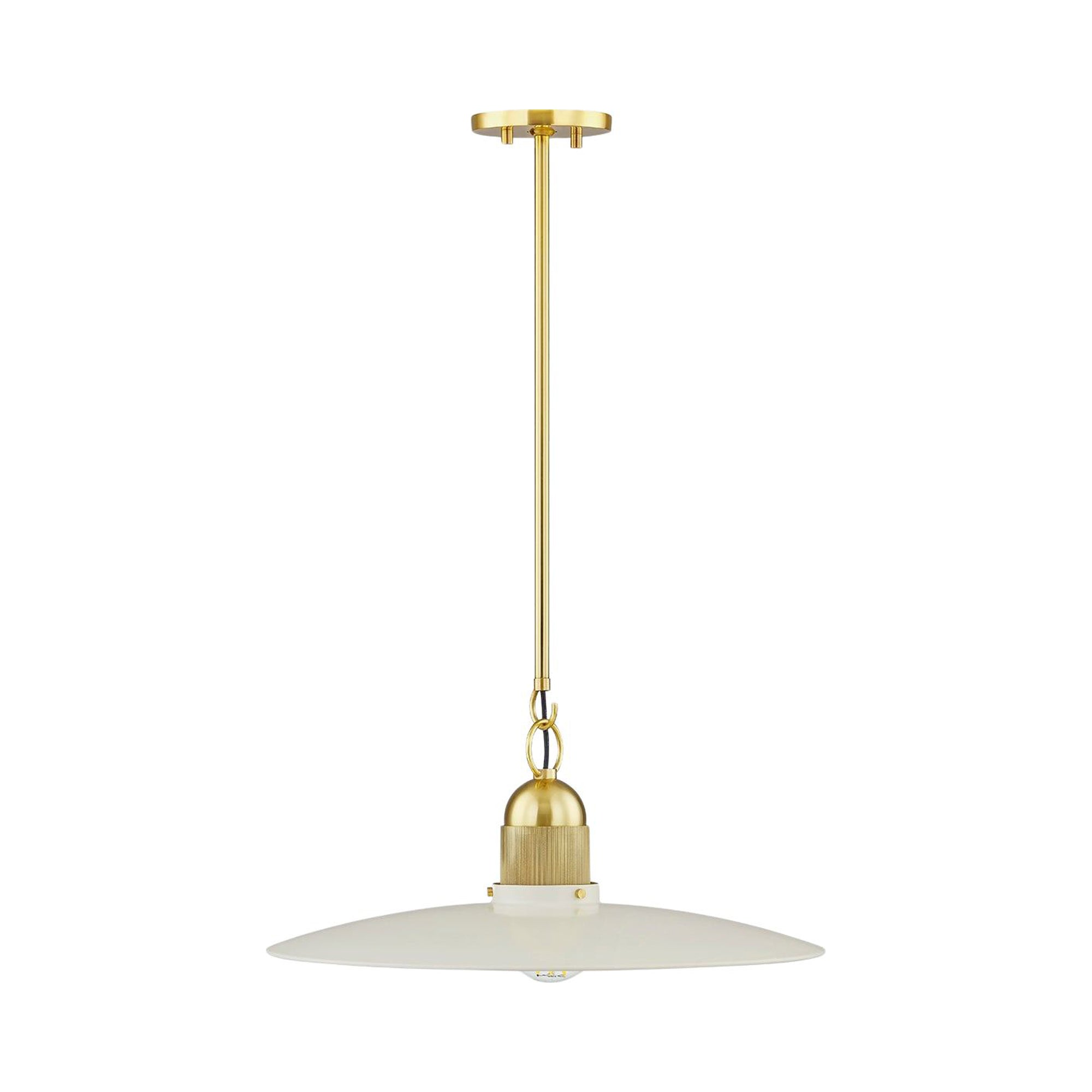 Light shines upon the knurled brass detail that enhances the Leanna Pendant Light from Mitzi. It's a fresh take on a classic farmhouse silhouette, complete with a slim reflector shade that casts downward illumination over a dining table or seating group. A dome detail and ring suspension apparatus accentuate a refined, modern take on a timeless design.