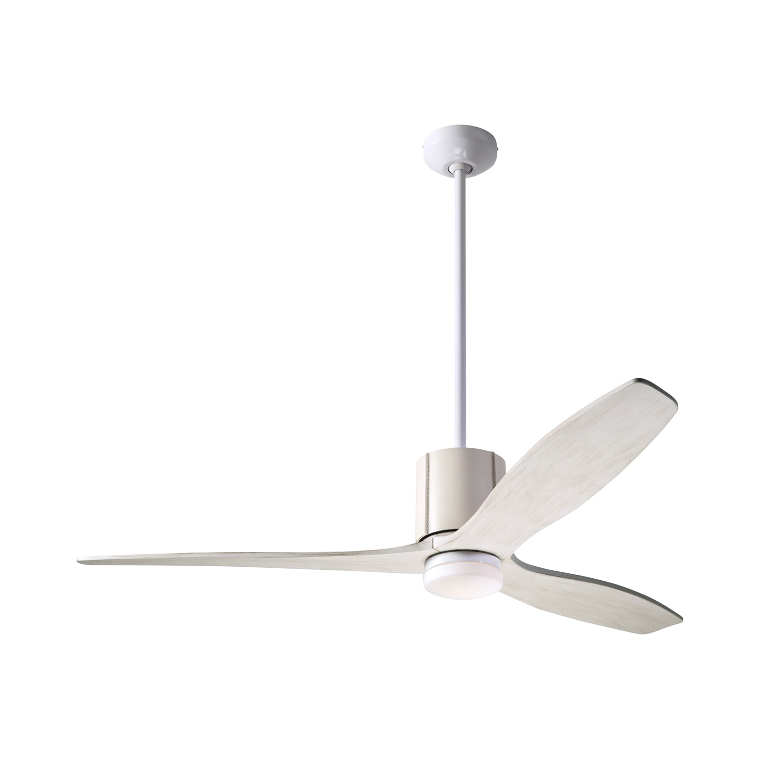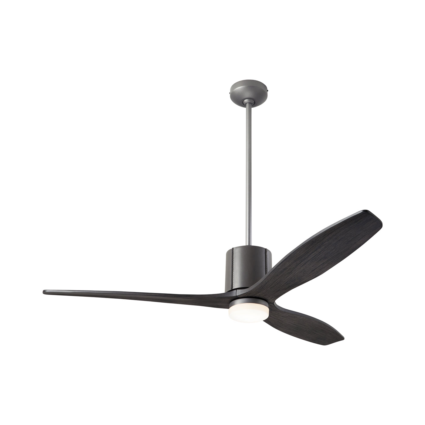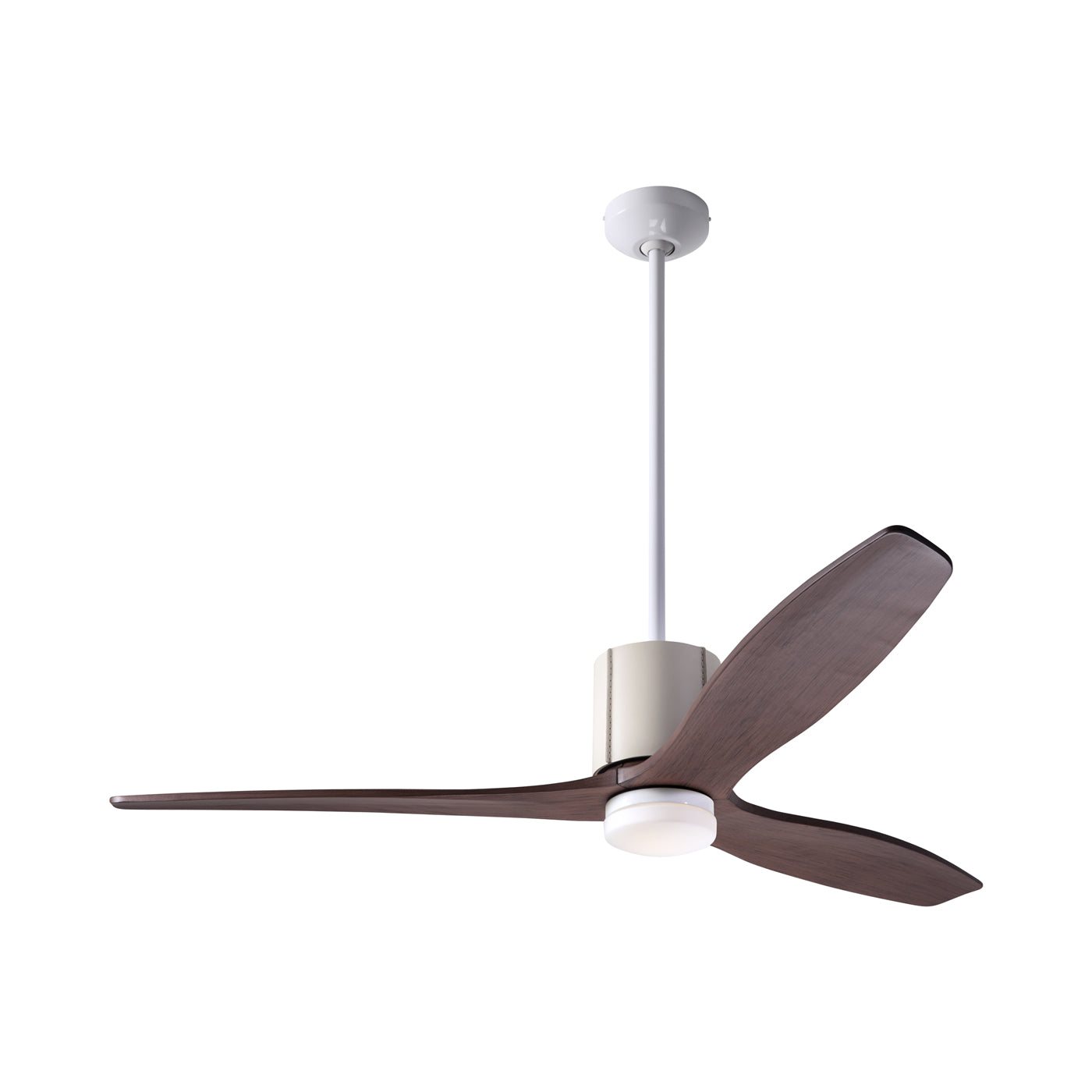 Leather wrapping tops die-cast aluminum construction of a chic three-blade ceiling fan with a bonus light kit. The LeatherLuxe DC LED Ceiling Fan from Modern Fan Company adds an extra boost of style with its leather cover, as a six-speed reversible DC motor spins two ways to both circulate cool air and push warm air in a downward direction. Its bonus light kit doubles functionality with energy-efficient lighting.