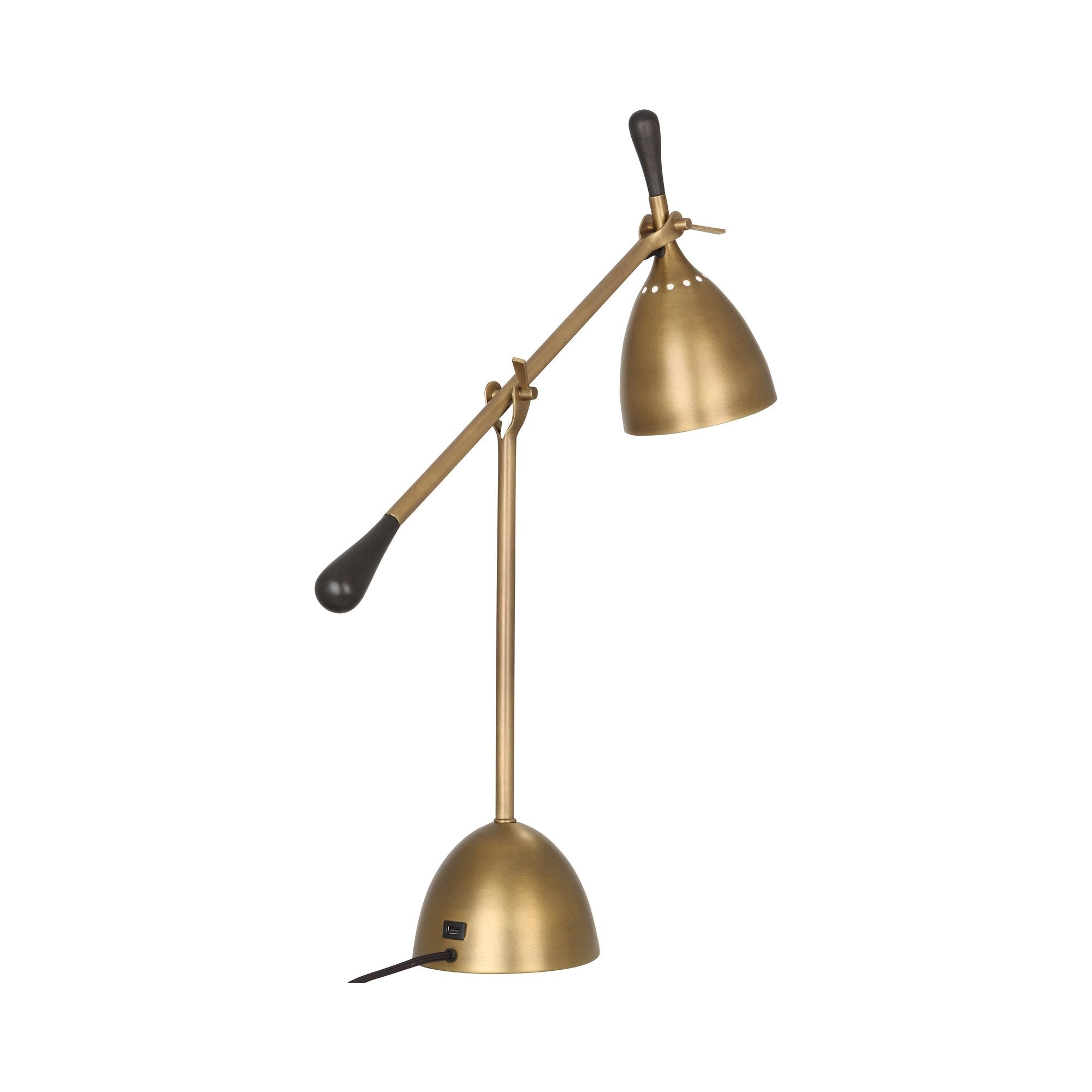 Romanticizing industrial attitude with sleek silhouetting, the Ledger Table Lamp from Robert Abbey plays with balance and form as it offers targeted lighting and an inspiring blend of brass finish metal with dark walnut accents.