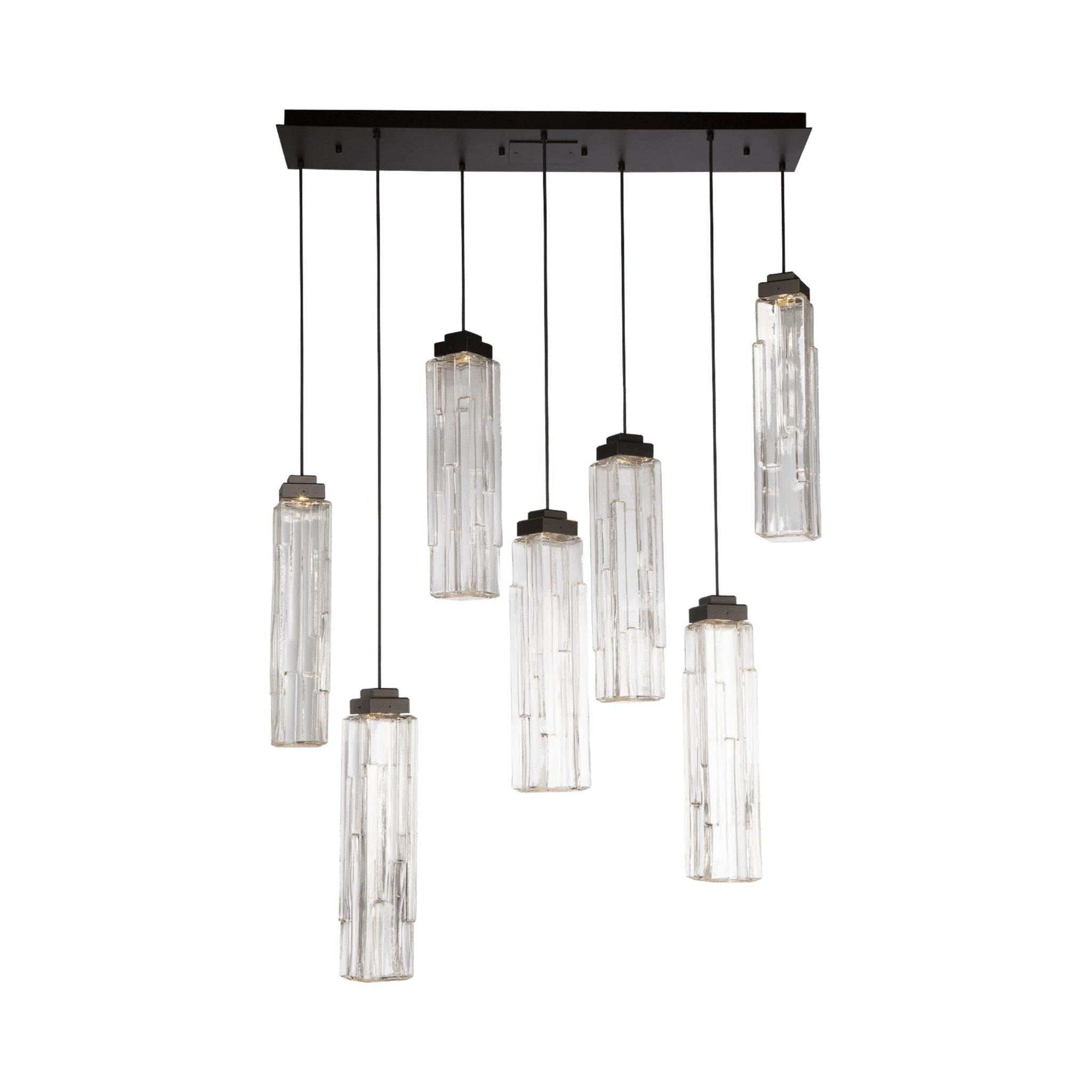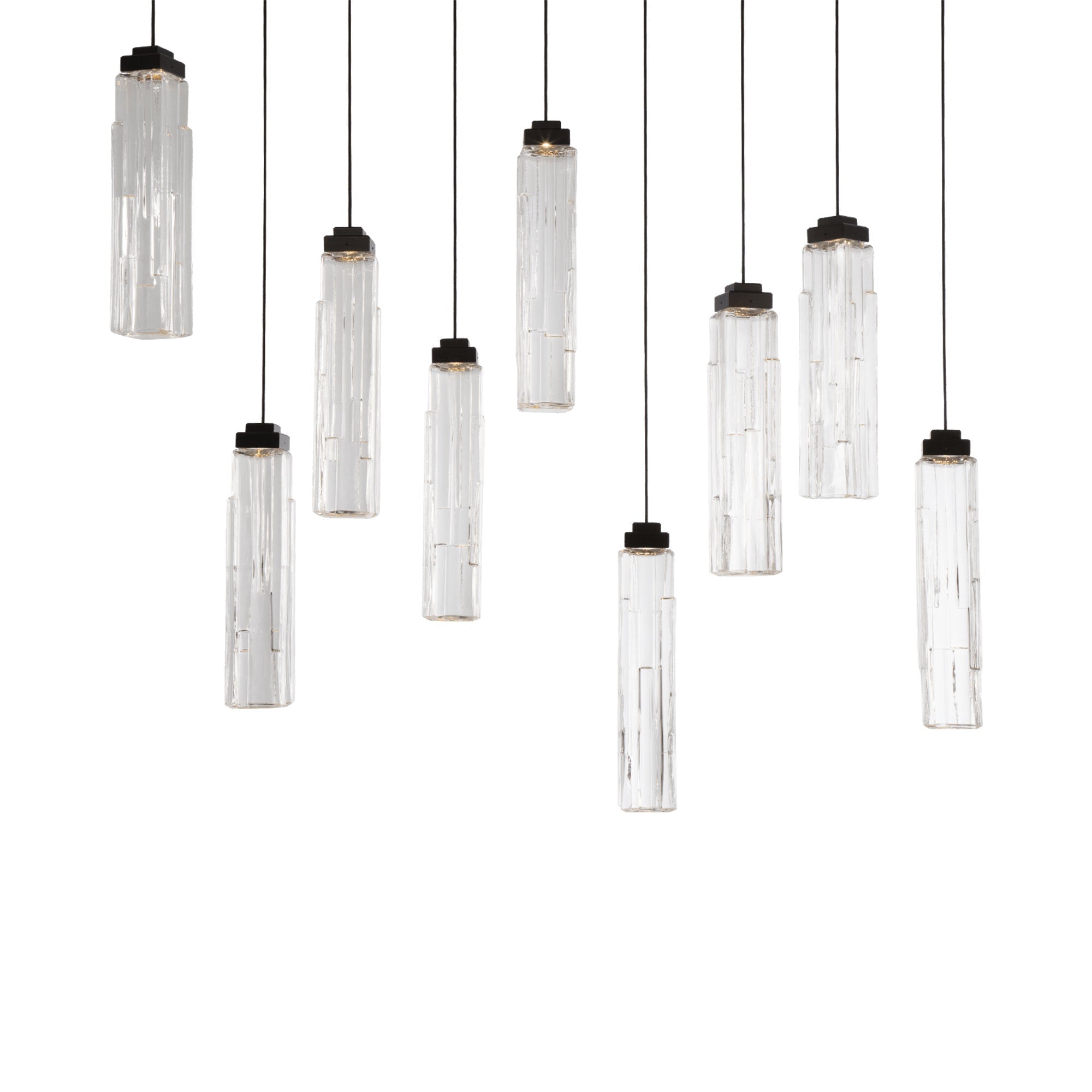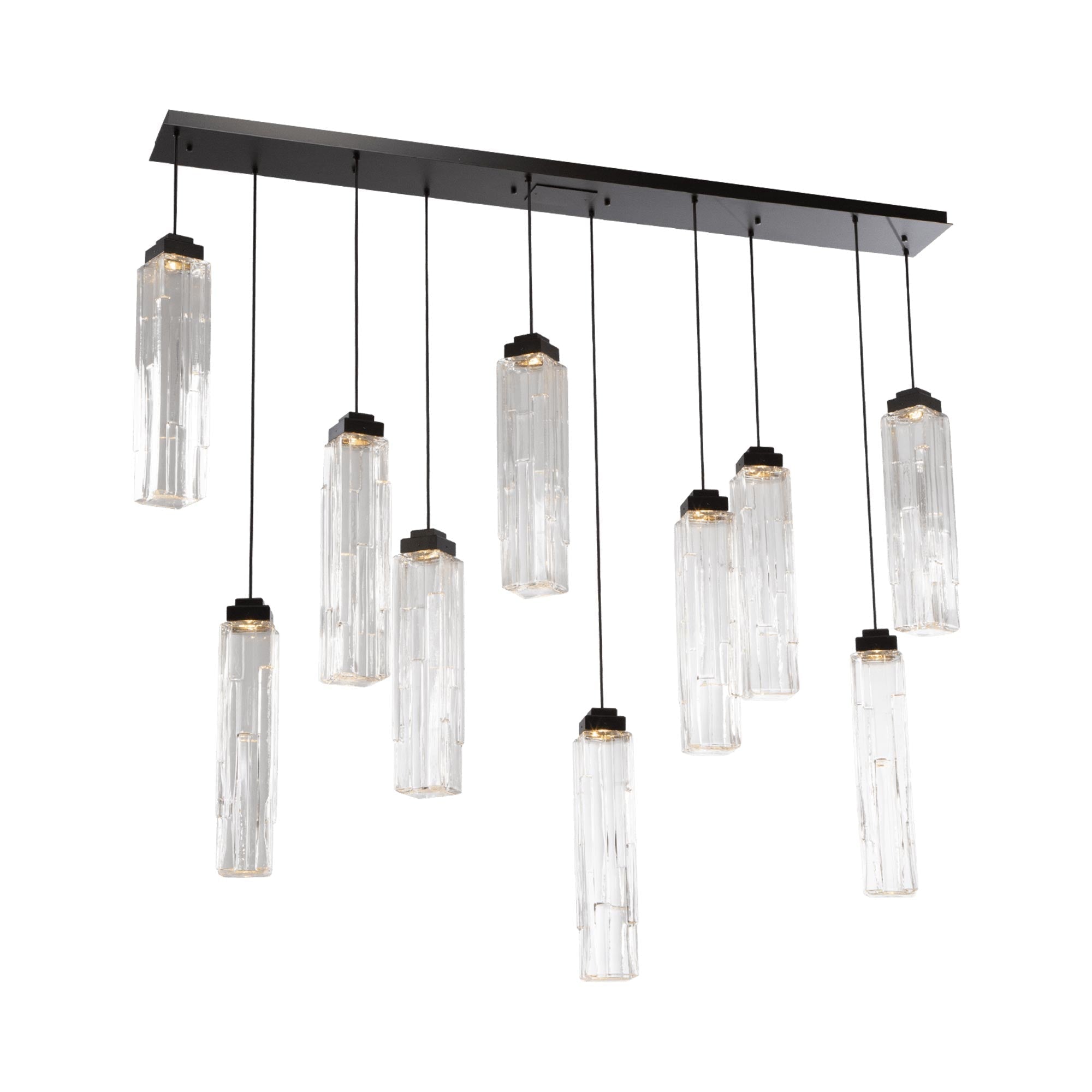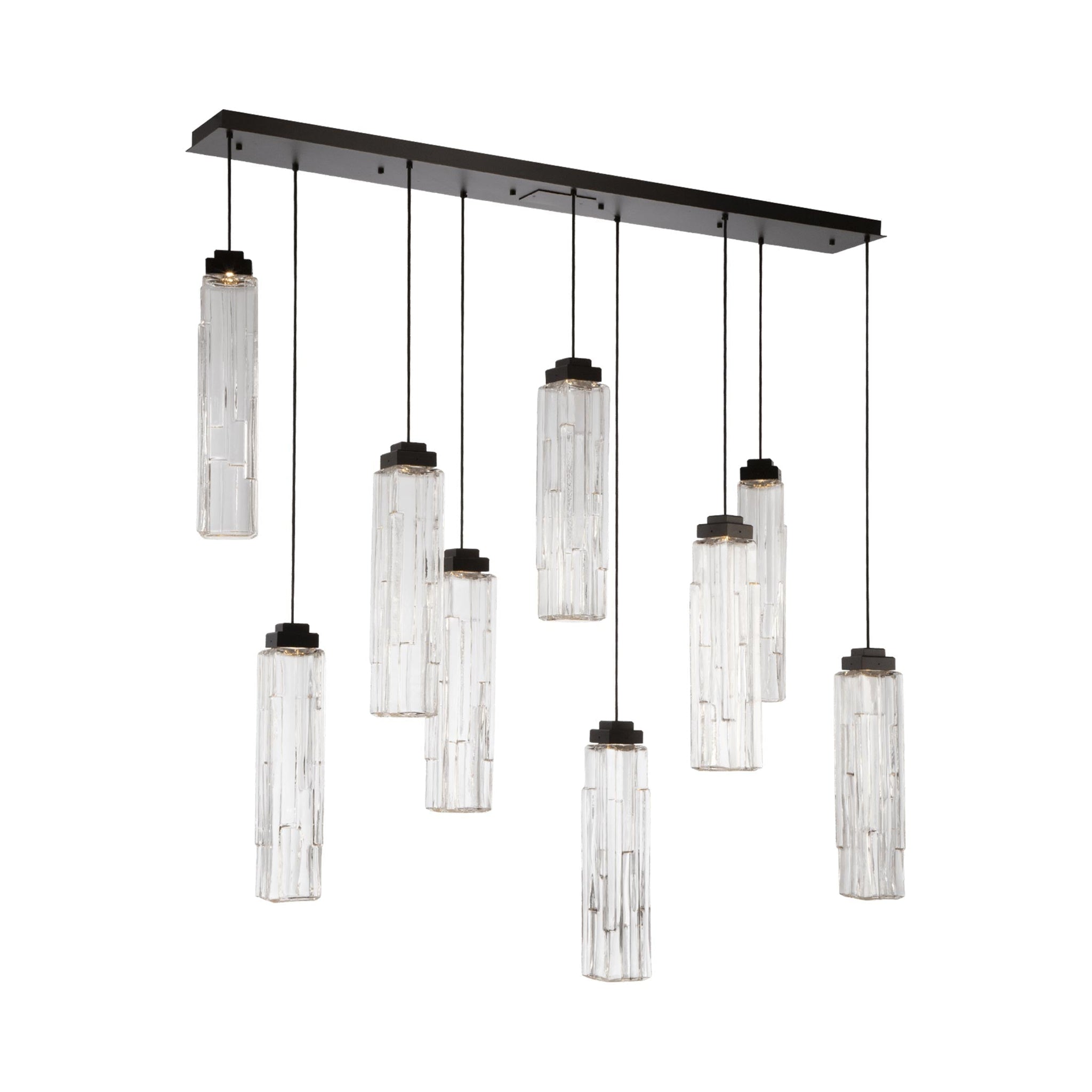 Icy, elongated shades refract sparkling lighting in the superb Ledgestone LED Linear Chandelier from Hammerton Studio. Integrated LEDs ensure energy efficiency over a kitchen island or elegant dining table.