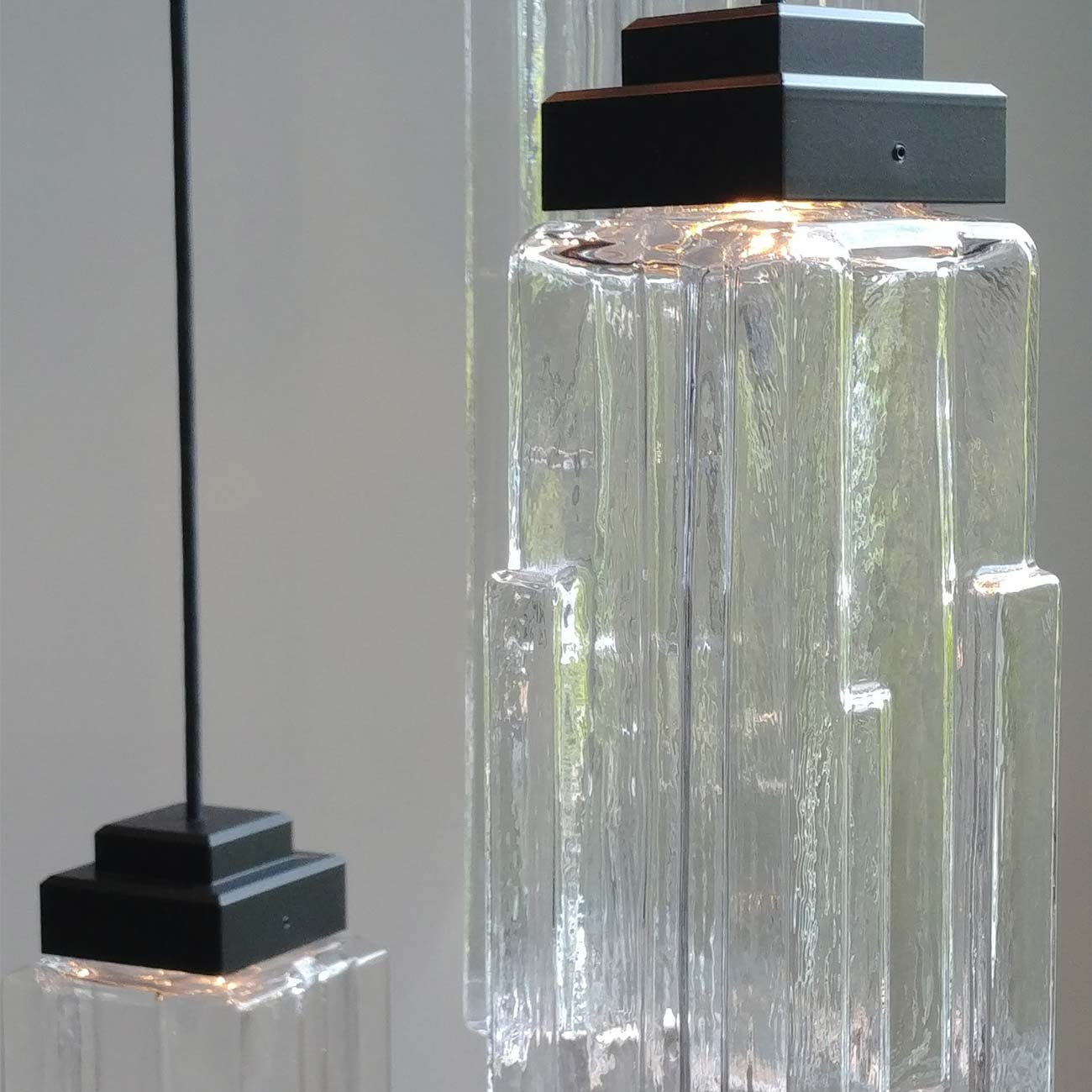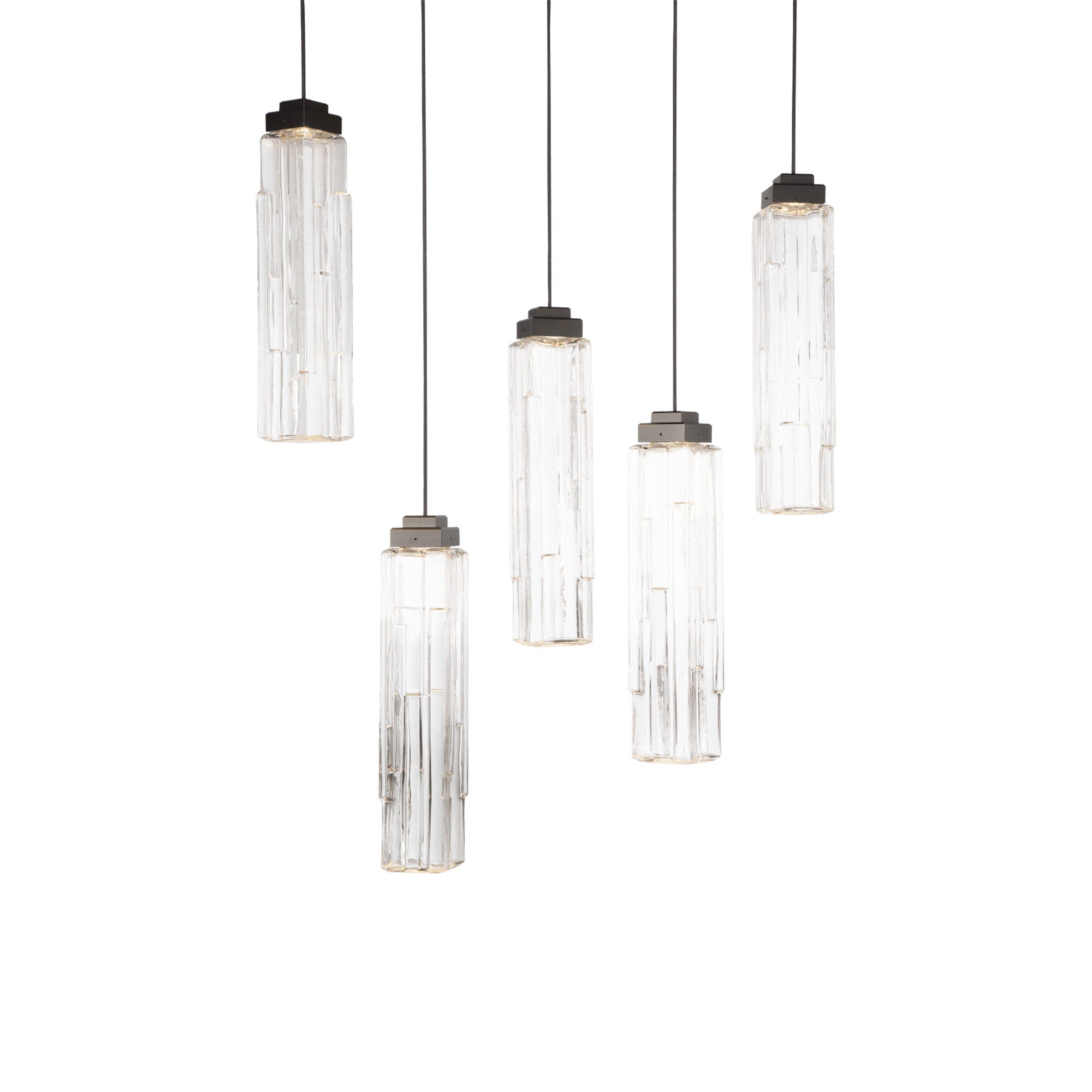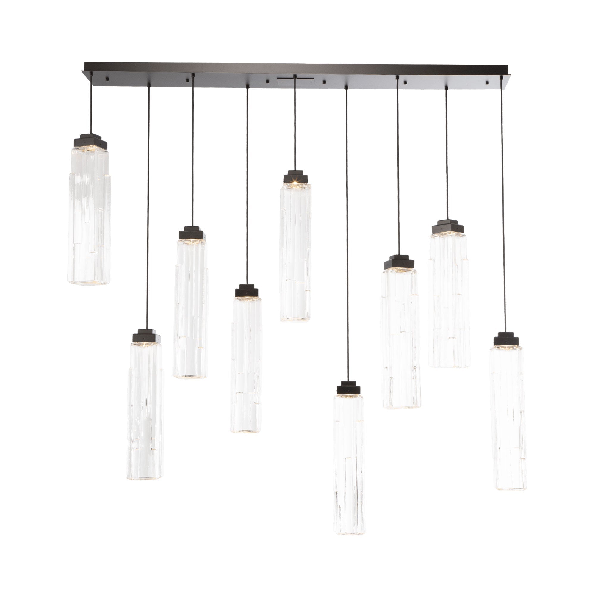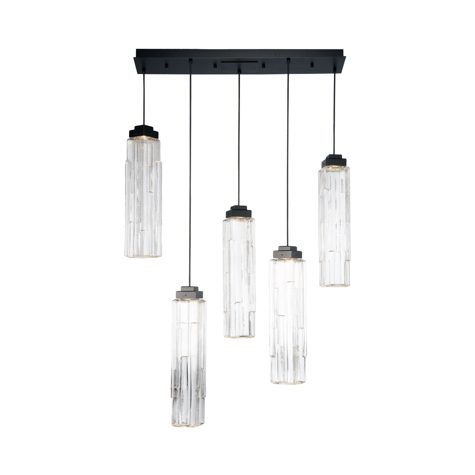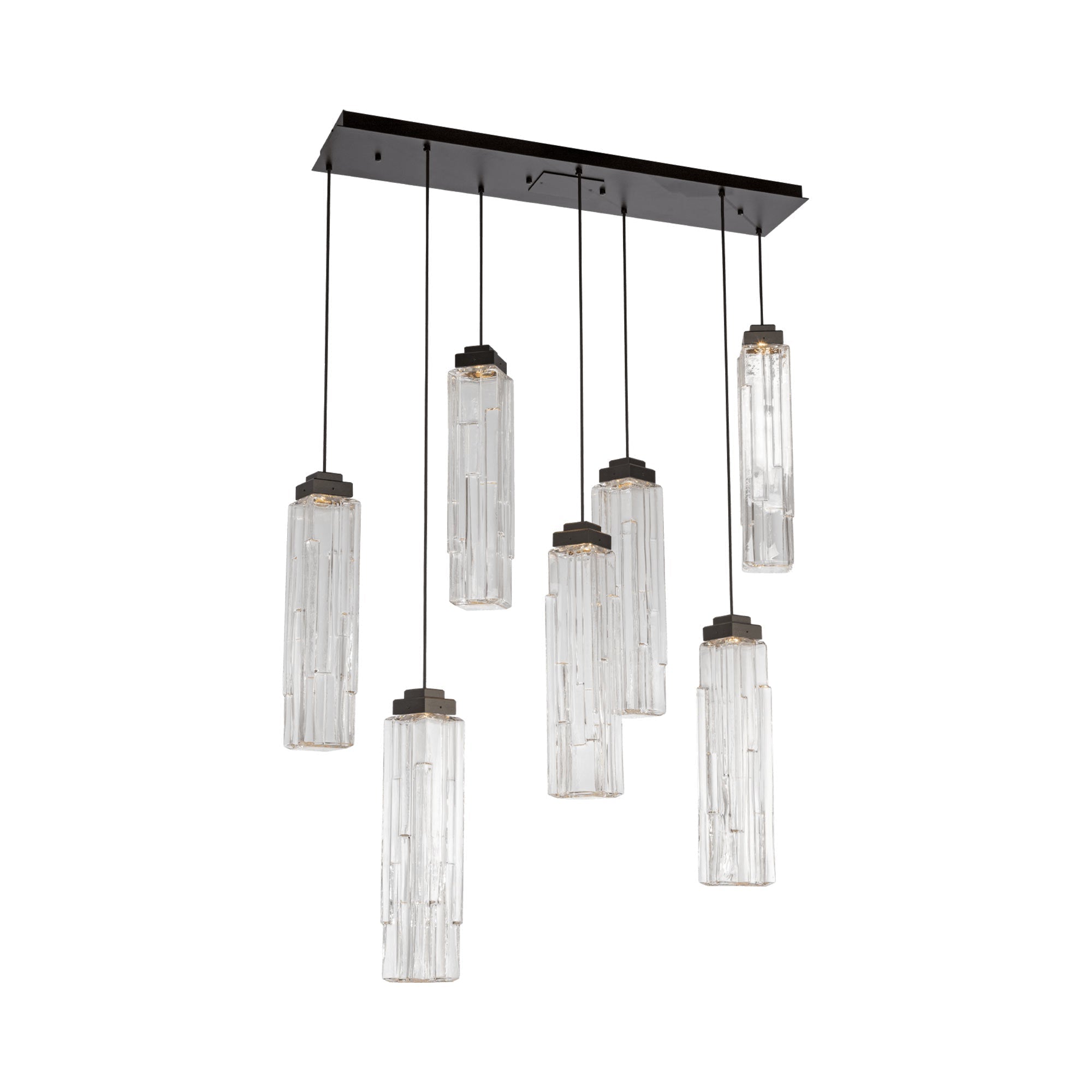 Icy, elongated shades refract sparkling lighting in the superb Ledgestone LED Linear Chandelier from Hammerton Studio. Integrated LEDs ensure energy efficiency over a kitchen island or elegant dining table.