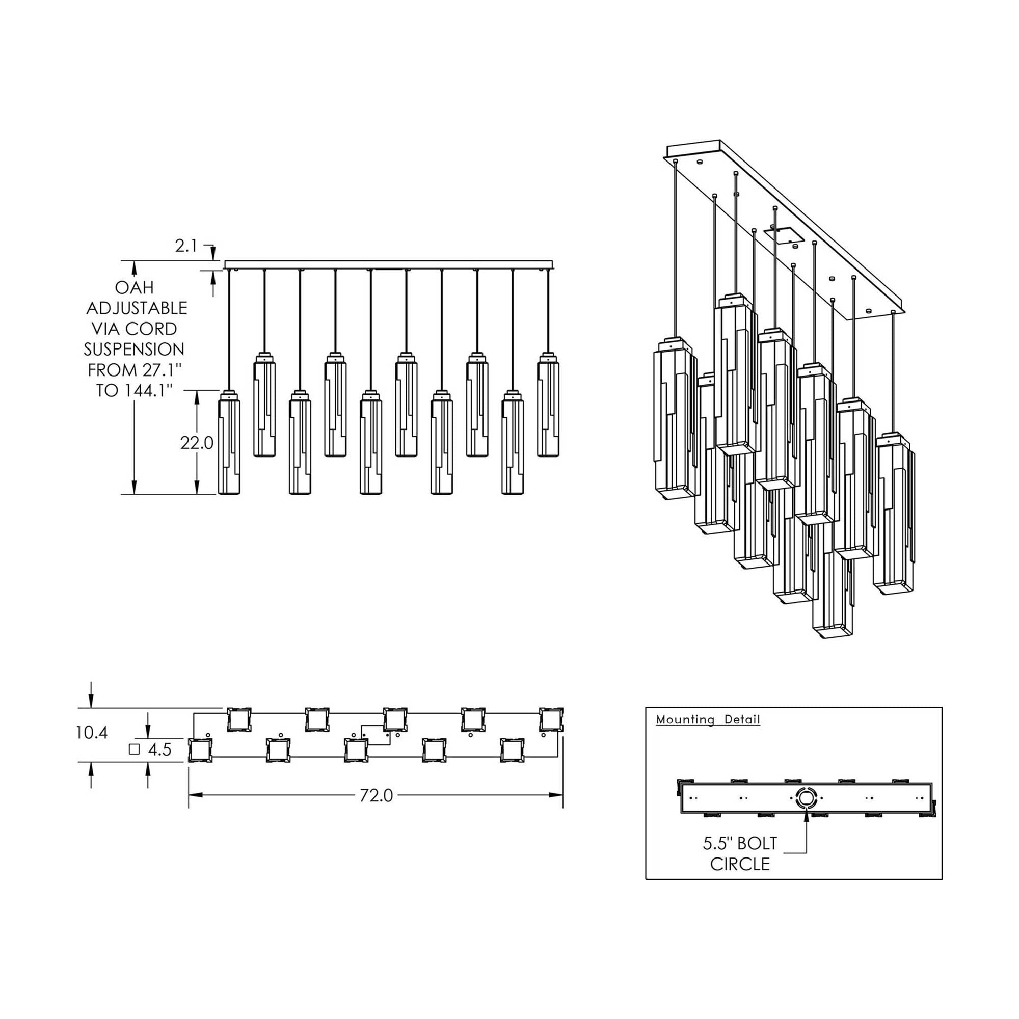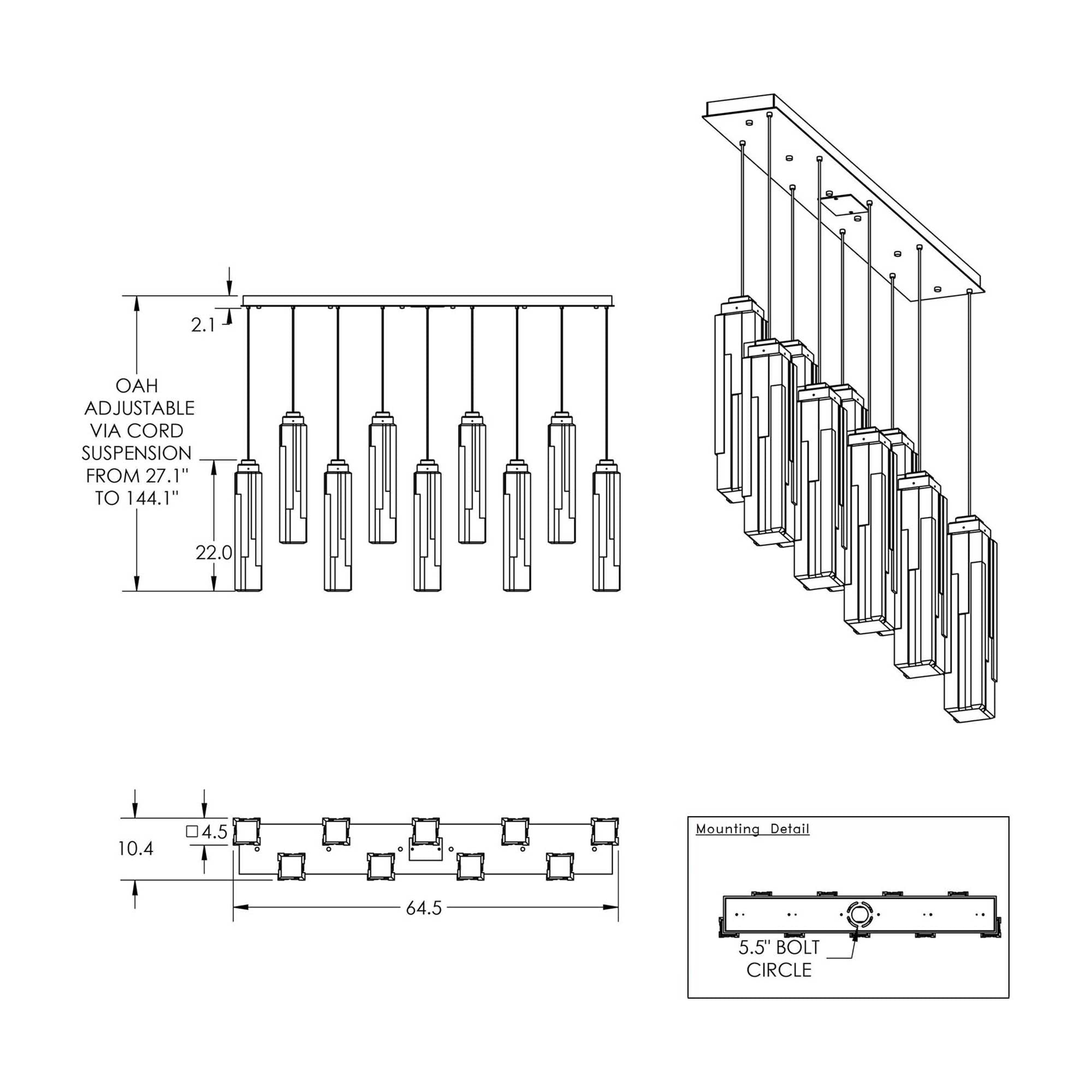 - 9-Light: 64.5"W X 27"H; 144.1" max height
