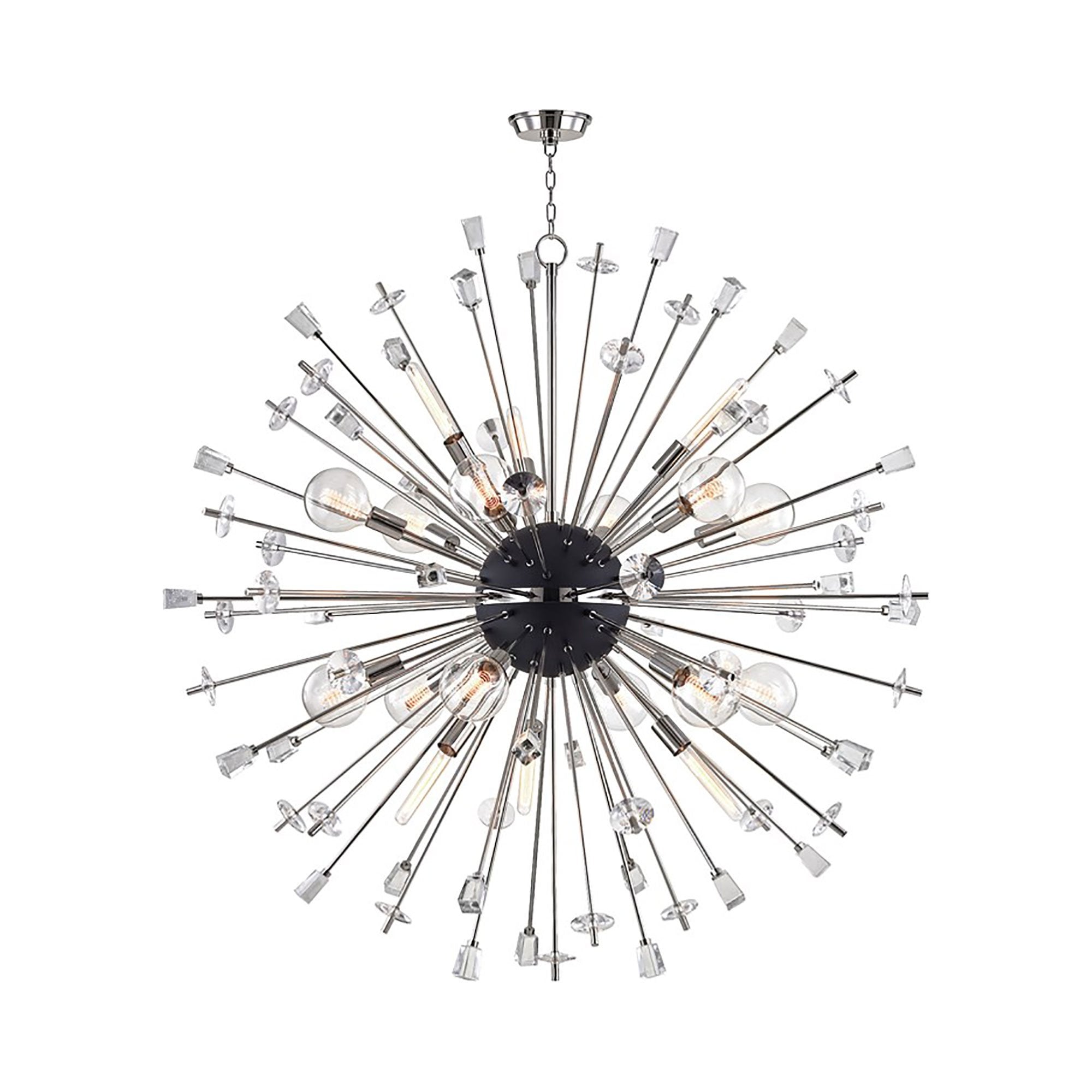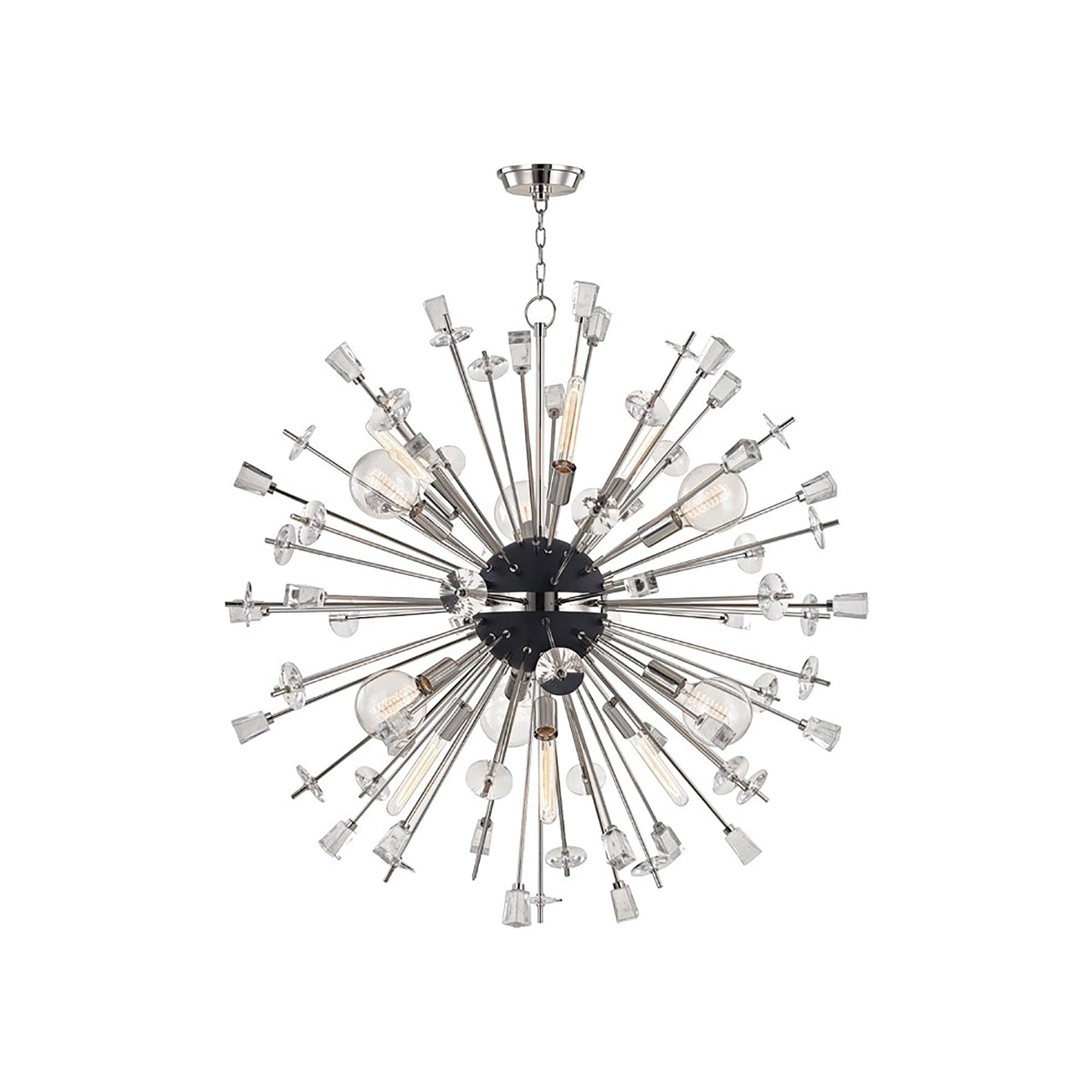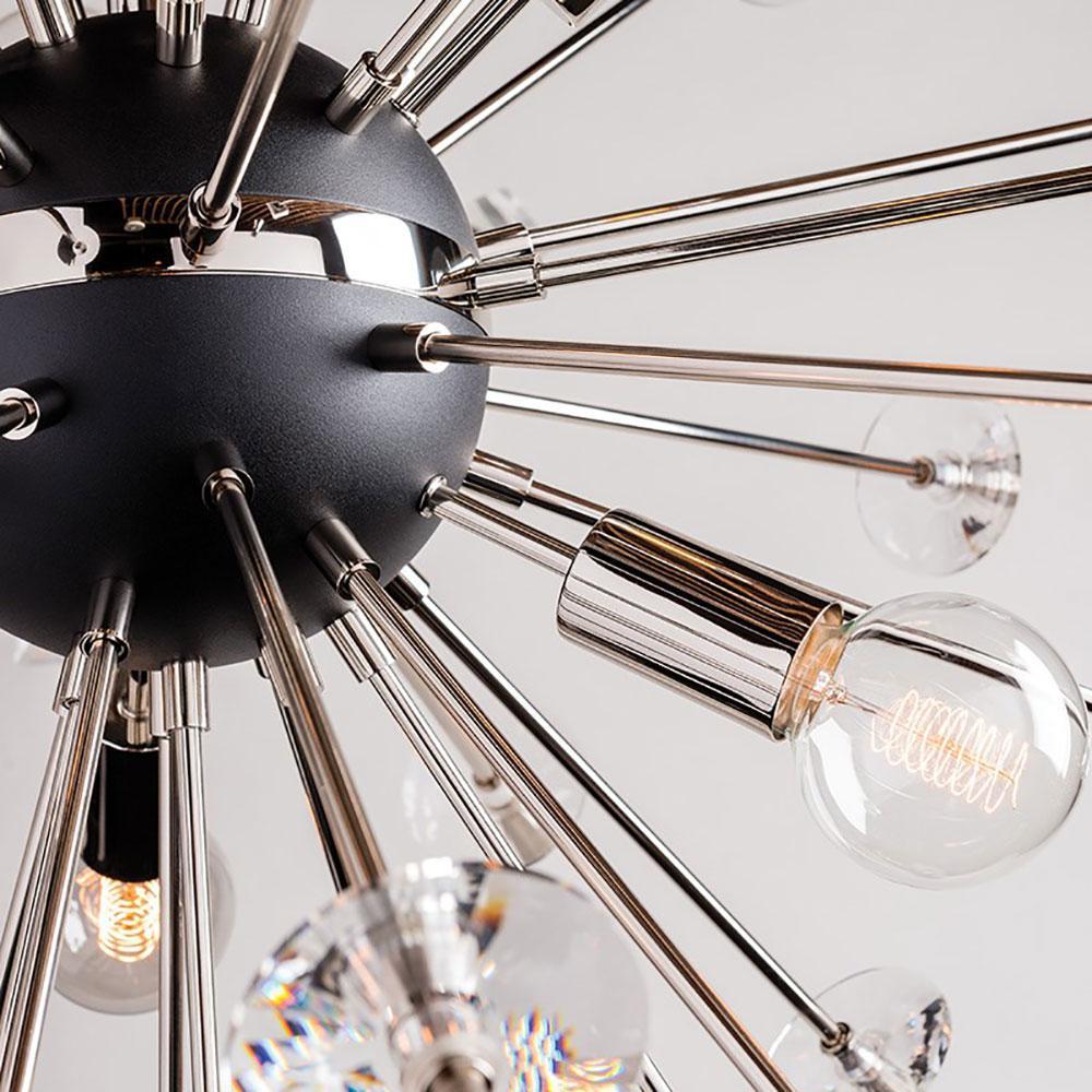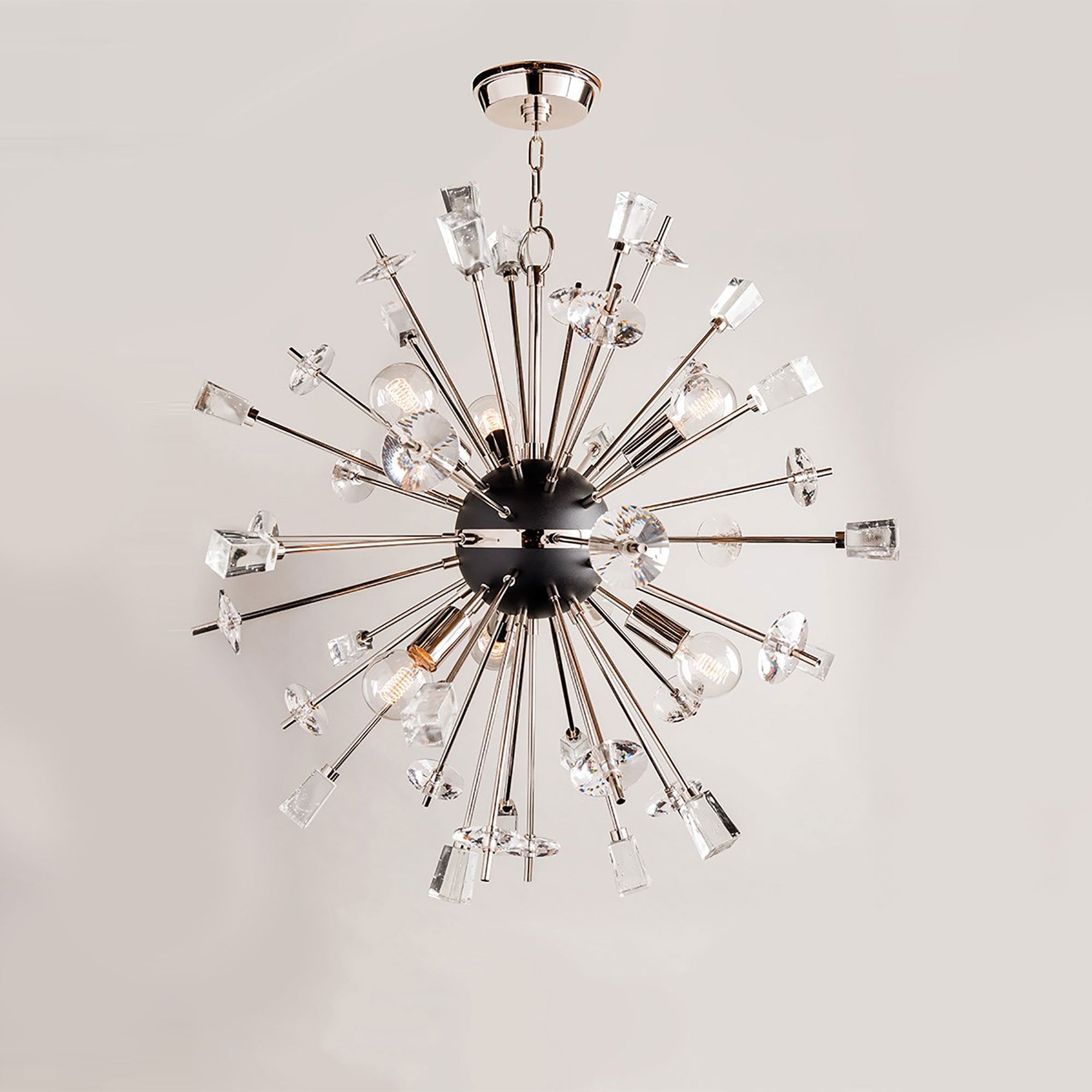 Liberty Chandelier starts with a core of matte-black metal, banded round its middle with a flashing contrast from the piece’s finish of choice—brass or nickel. Retro coil bulbs in ballooning clear glass create the primary light source; in larger models, tubular exposed-filament bulbs alternate. Cut-crystal discs and icy handcrafted glass adorn protruding rods, refracting the dazzling light in a thousand directions.
