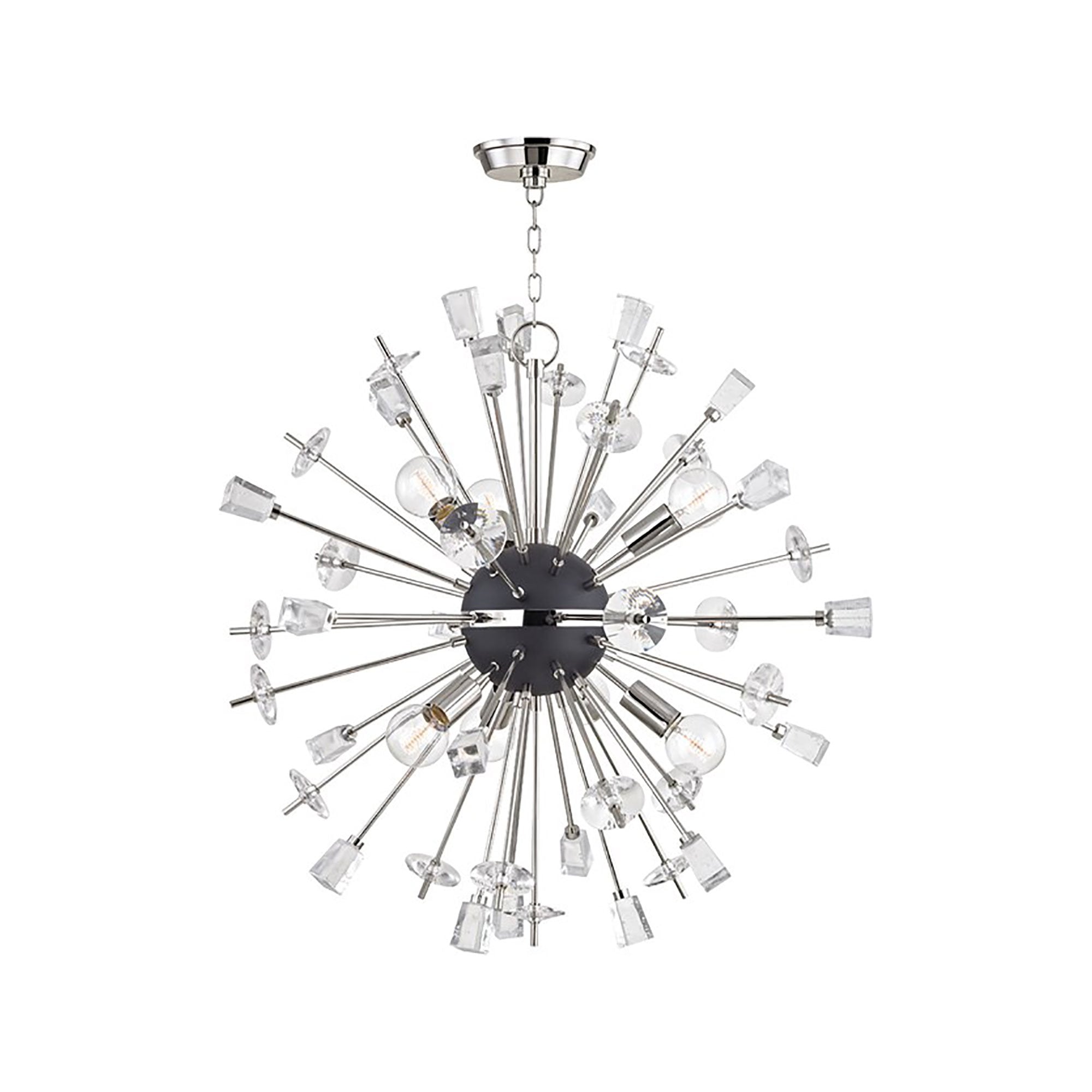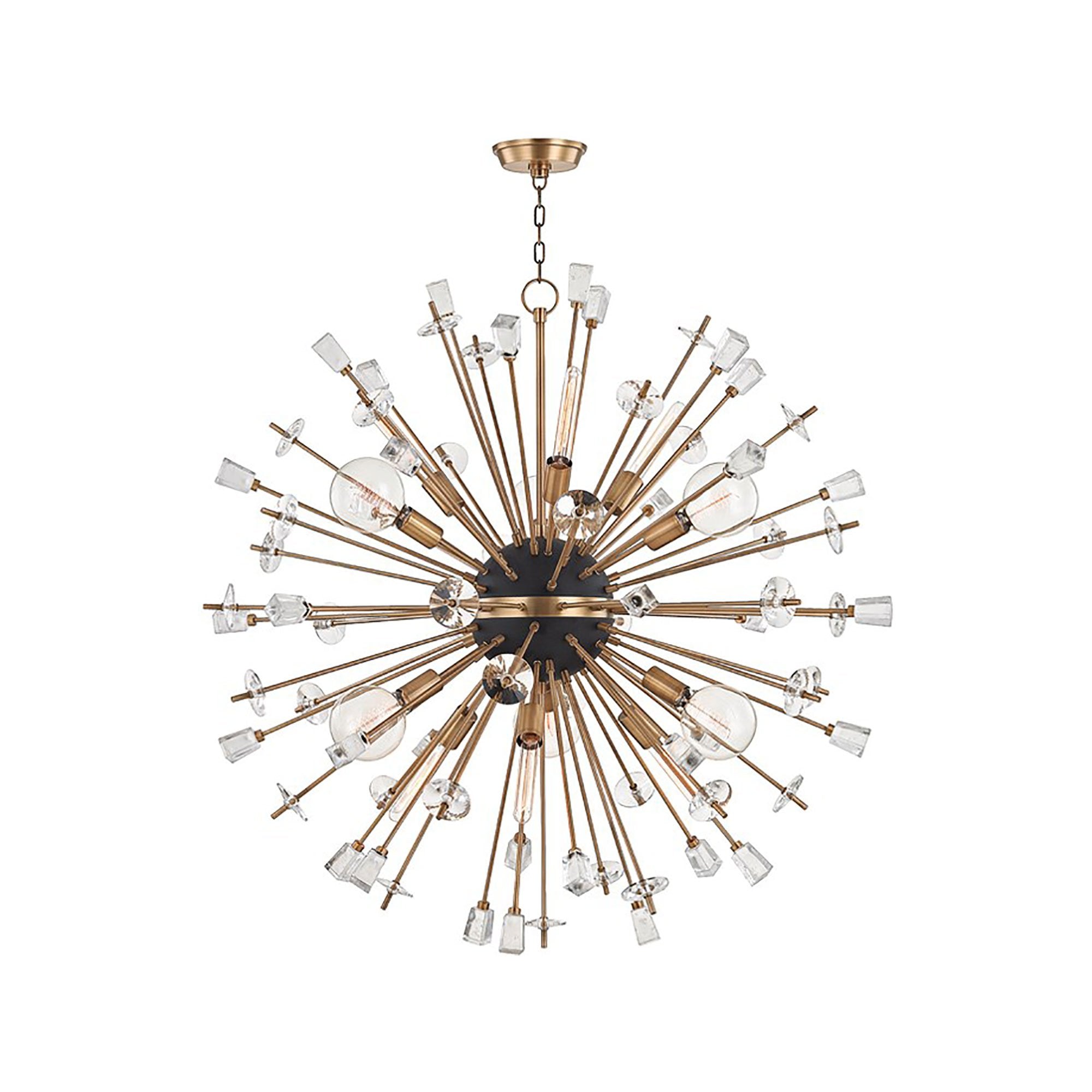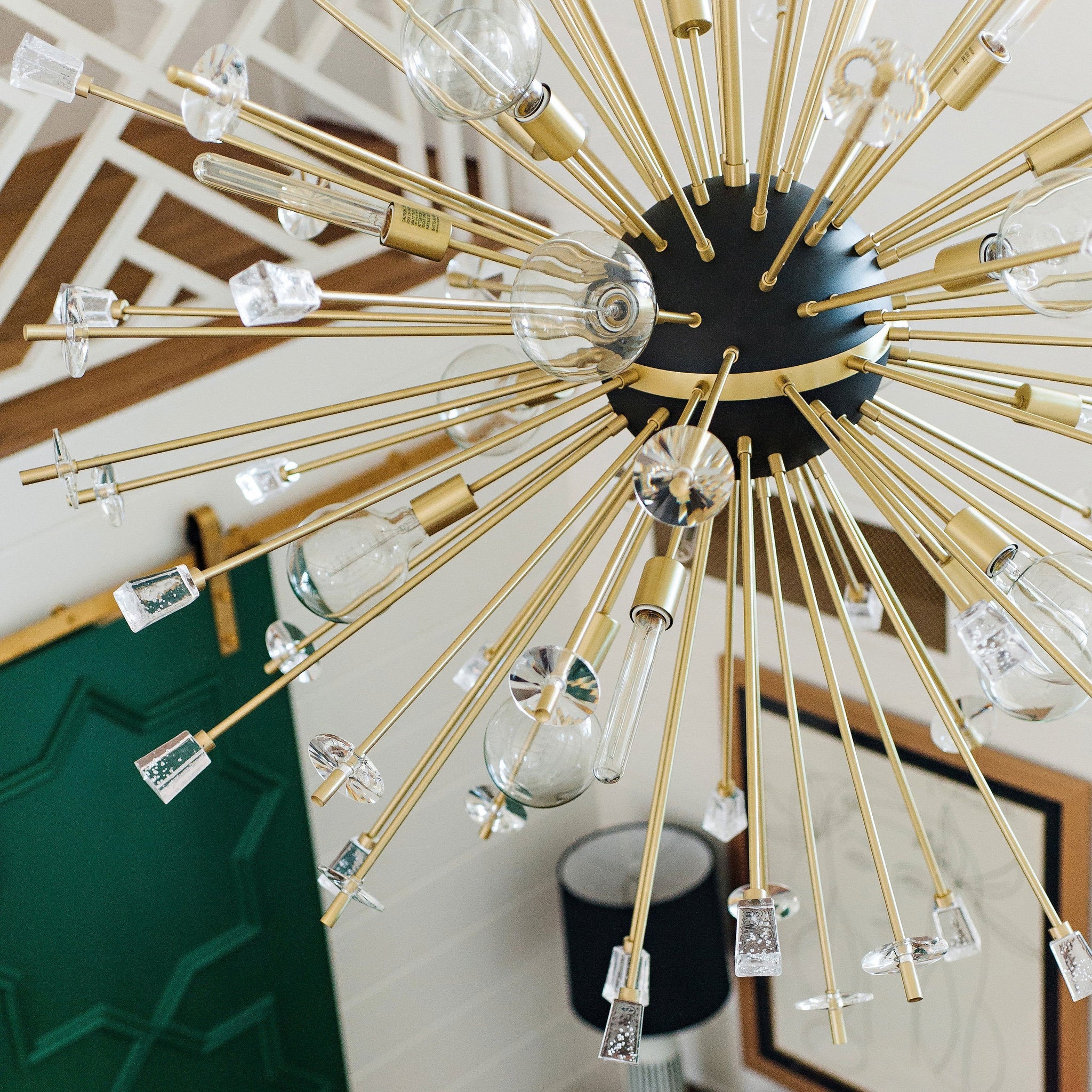 Liberty Chandelier starts with a core of matte-black metal, banded round its middle with a flashing contrast from the piece’s finish of choice—brass or nickel. Retro coil bulbs in ballooning clear glass create the primary light source; in larger models, tubular exposed-filament bulbs alternate. Cut-crystal discs and icy handcrafted glass adorn protruding rods, refracting the dazzling light in a thousand directions.