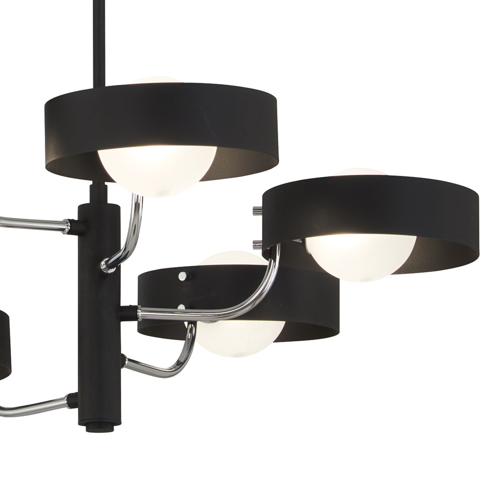 Expressive Art Deco and industrial aesthetics mix to deliver a deliberately bold ambiance in lighting. The Lift Off Chandelier from George Kovacs employs sharp finish contrast with coal and polished nickel metals, as circular rings hosting charming globe shades are arranged to create intriguing lighting impacts.