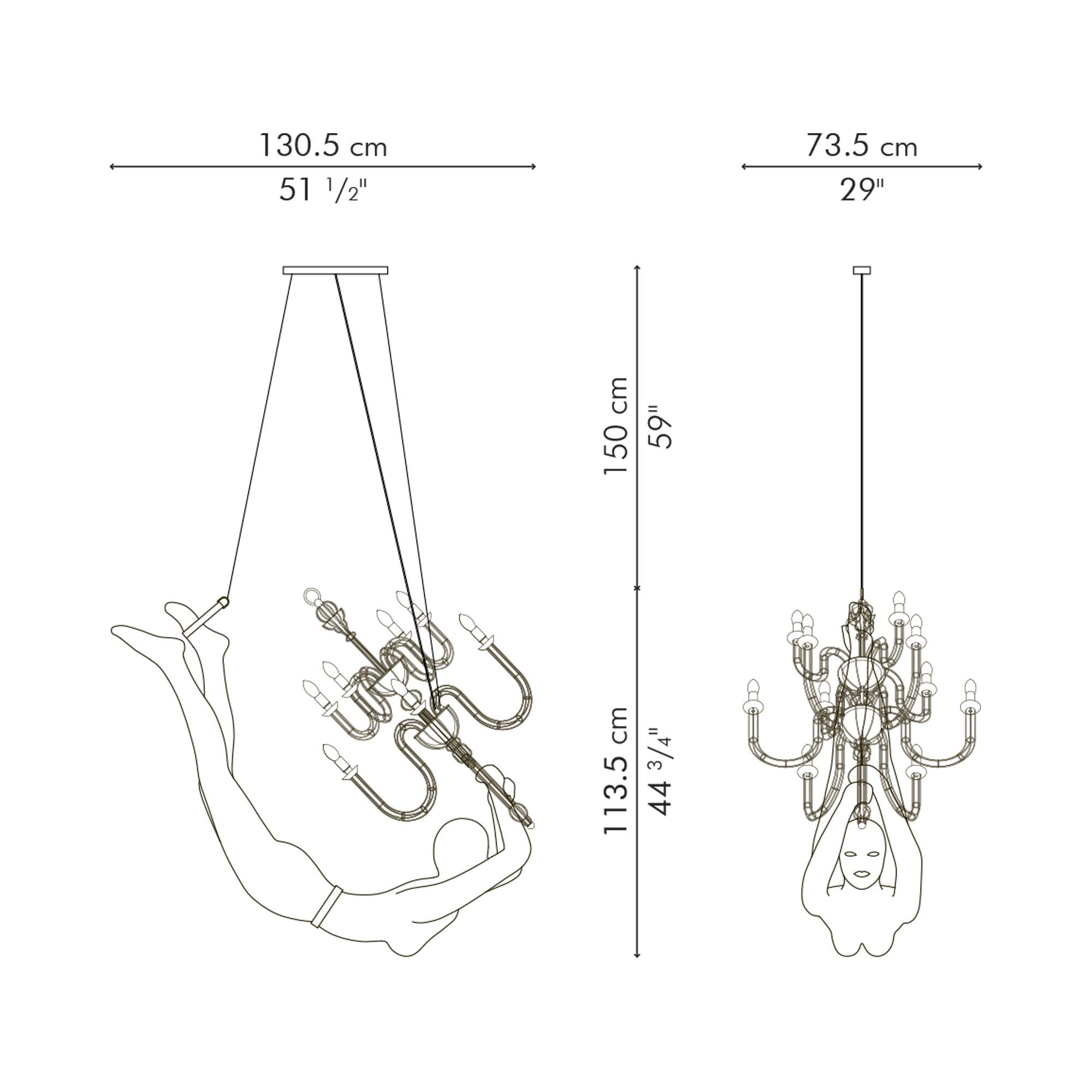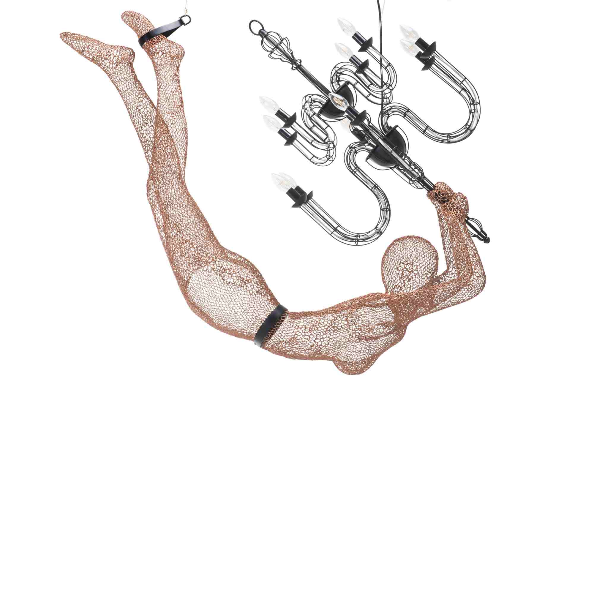 An unexpected introduction of anatomy offers an inspired and quirky sense of artistry in a light fixture with far more than fashion. The Limbo Chandelier from Kenneth Cobonpue creates a surprising gallery vibe with its raw human form fashioned of translucent copper brass. Its trapeze-like iteration appears to grasp an edgy version of conventional and traditional chandelier lighting, setting up a striking contrast.