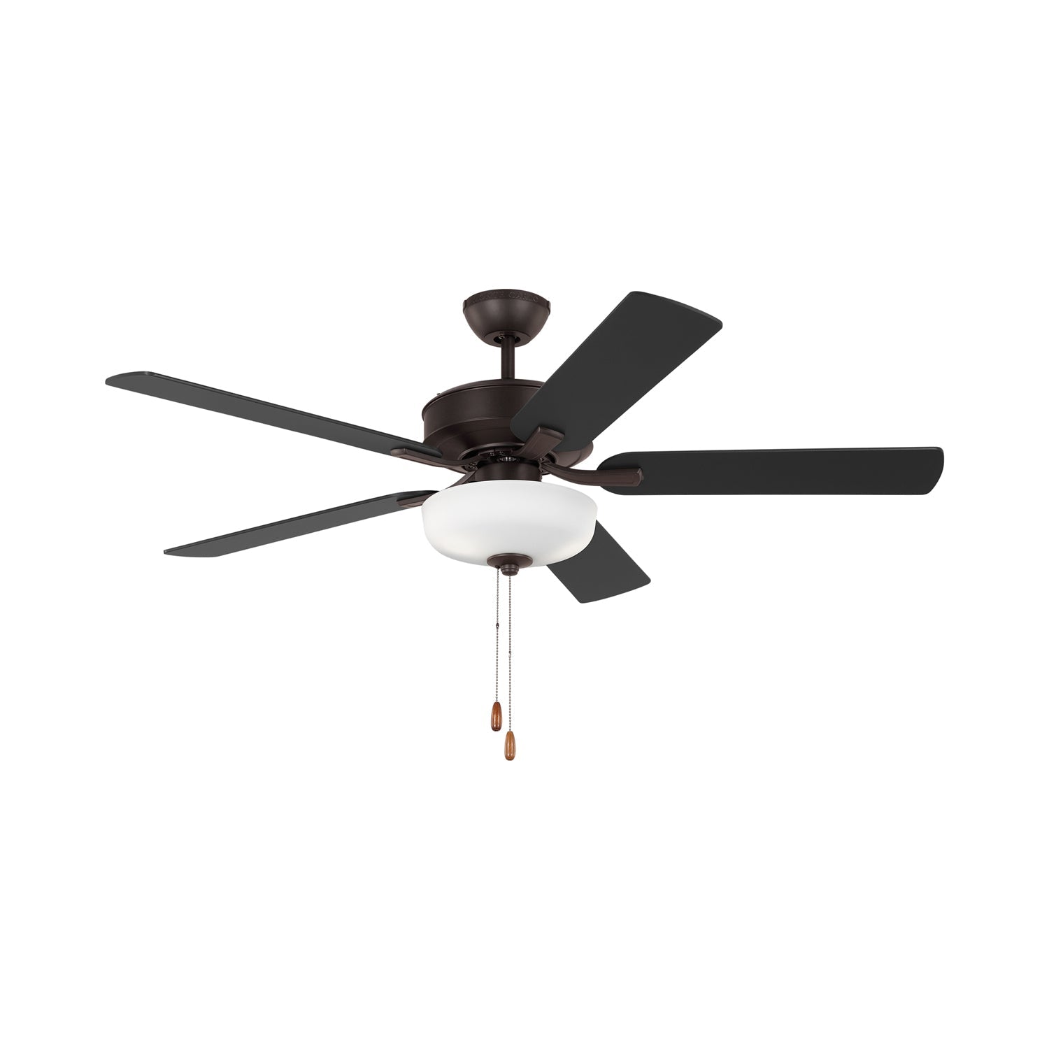 The Linden LED DC Ceiling Fan from Generation Lighting perfectly captures a transitional motif, versatile and charming. Five blades and an ornate metal duo of housing and dome canopy offer pleasing air circulation as they update the depth and style of a living space or bedroom. Energy-efficient lighting flows through a stylish glass shade.