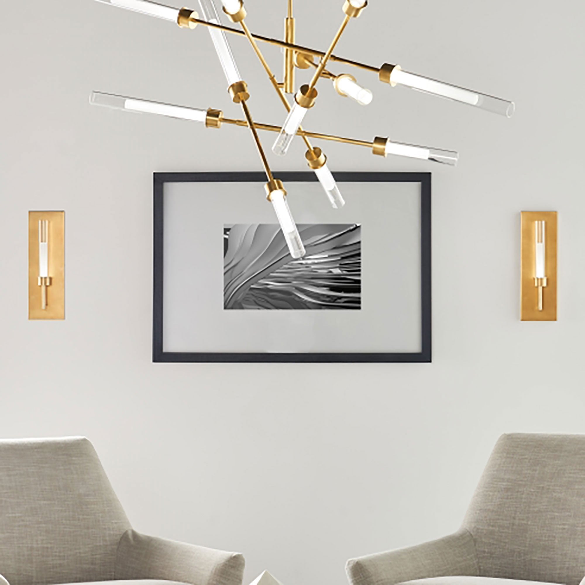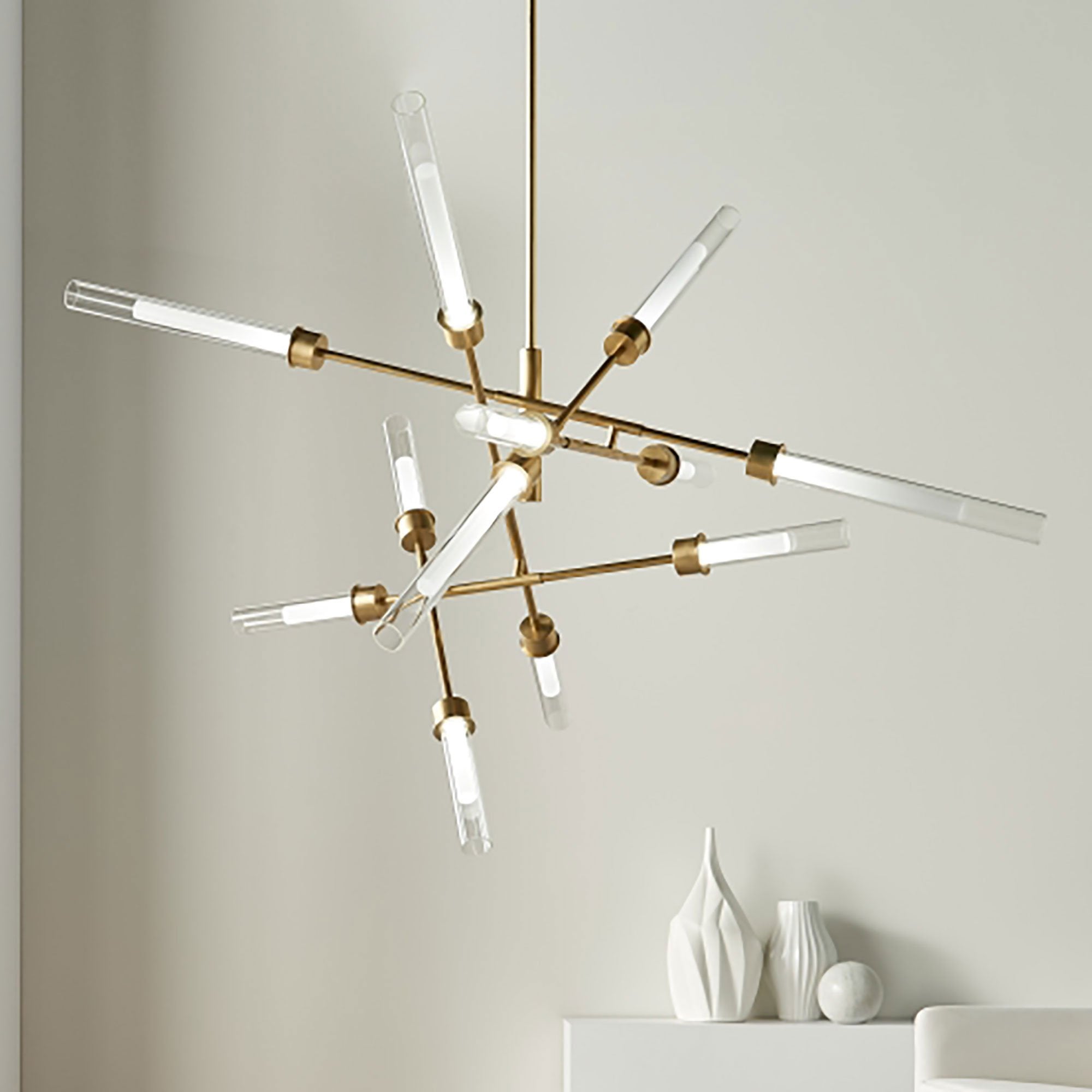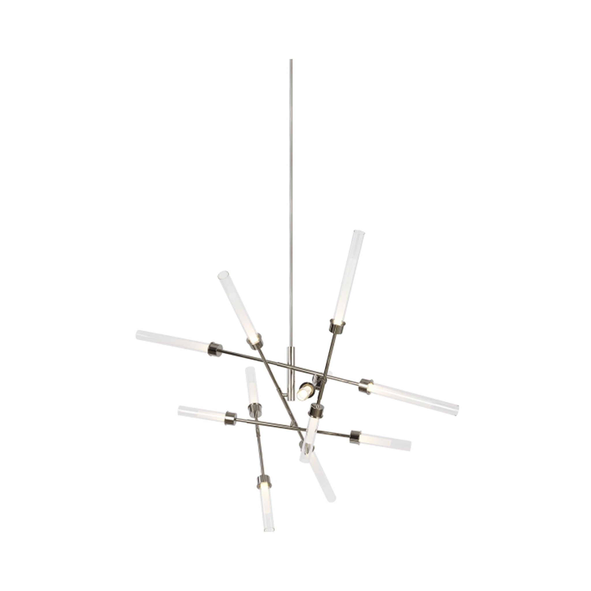 The Linger LED Abstract Chandelier by Sean Lavin for Visual Comfort Modern is designed with 12 LED lights tapered by glass and acrylic cylinders and illuminate in multiple directions. Available in Polished Nickel and Natural Brass that will slowly patina for a timeless look. Linger creates a beautiful statement piece for your dining room, living room and foyer. Complete your look with the Linger Chandeliers, Linear Suspension, Pendant and Wall Sconces. Lamping options are compatible with most dimmers. Refer to the Dimming Chart for more information.