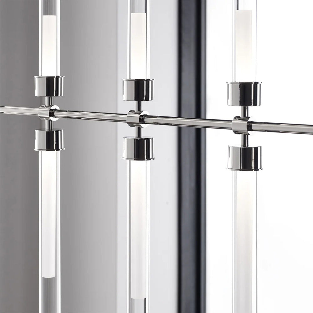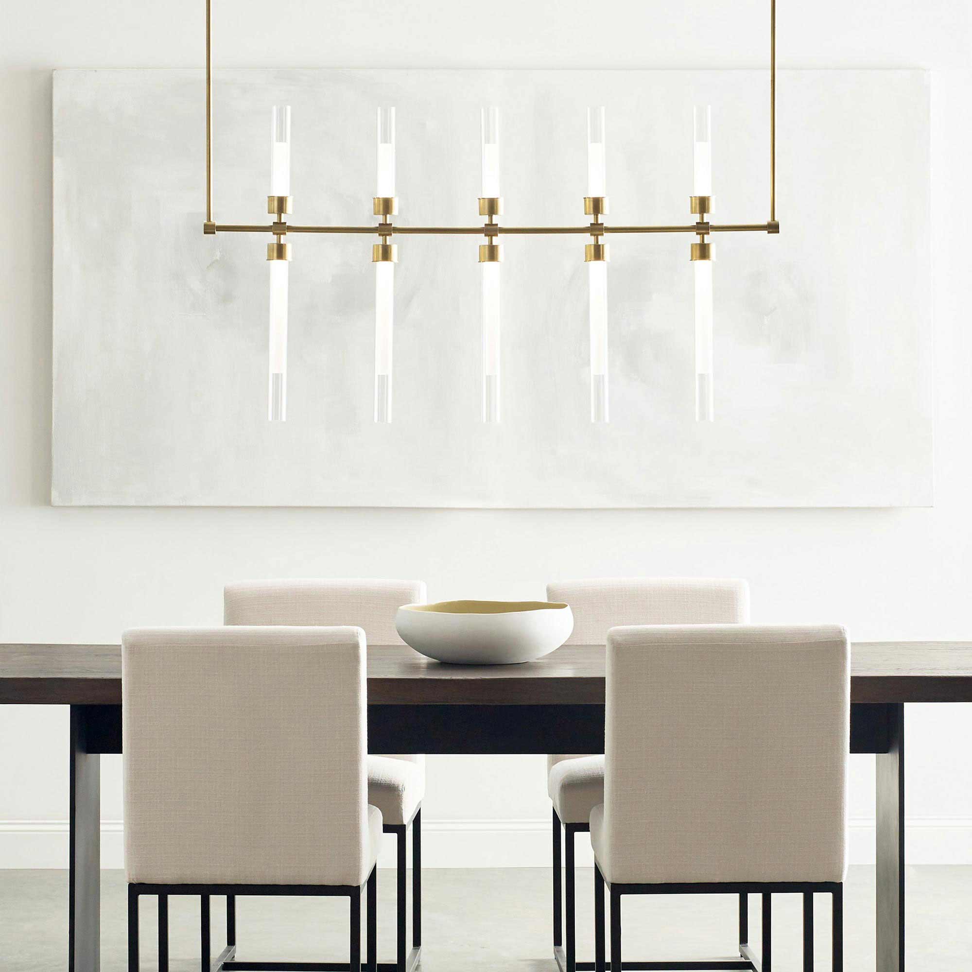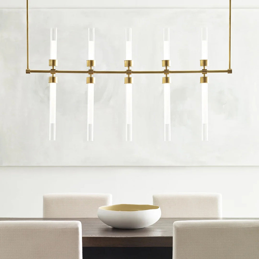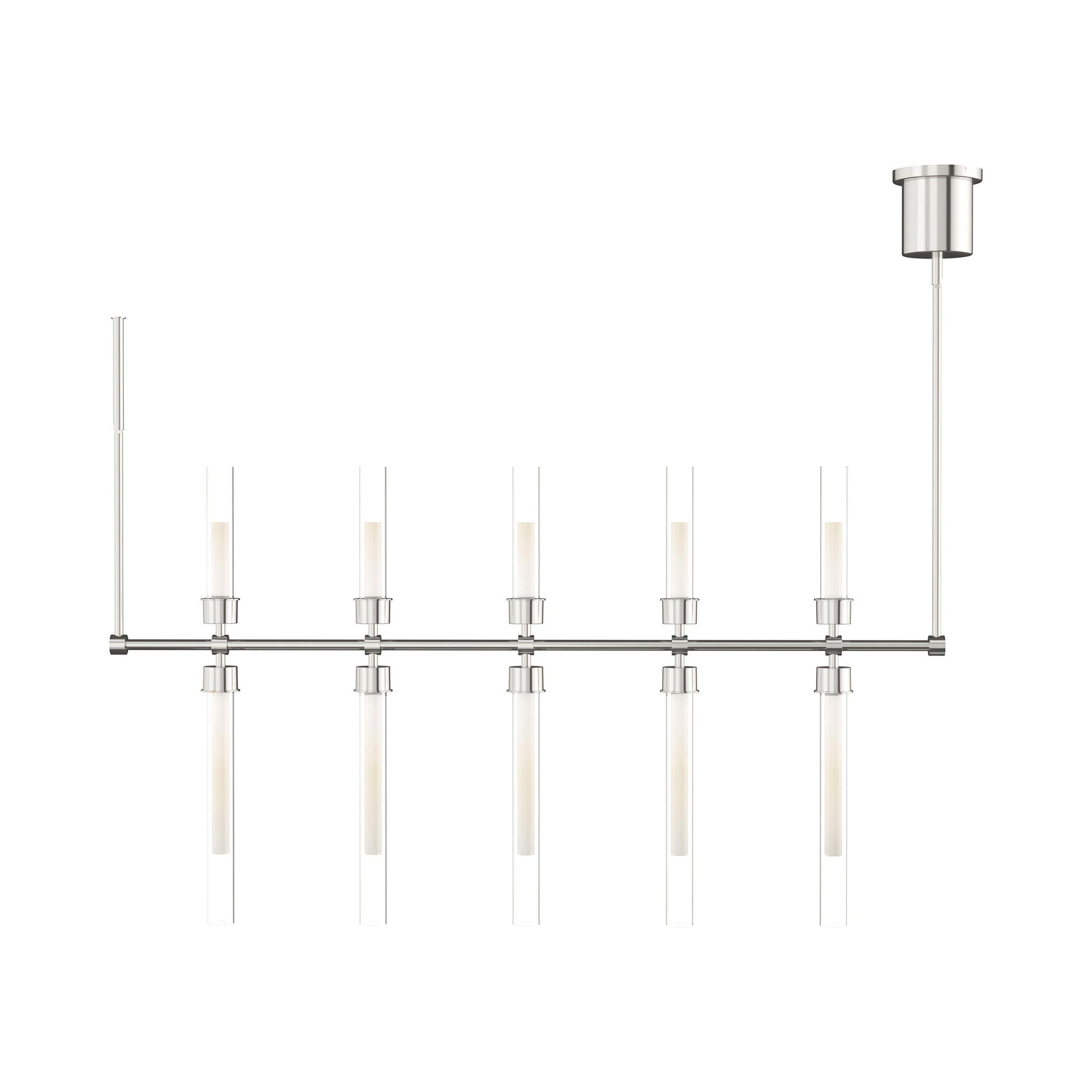 The Linger LED Linear Suspension Light by Sean Lavin for Visual Comfort Modern is designed with symmetrically placed LED lights shaped by ten glass and acrylic cylinders providing generous illumination in any space. This linear suspension spans 49" wide and provides up and down light perfect for commercial spaces, restaurants, kitchens and entryways. Available in Polished Nickel and Natural Brass that will slowly patina for a timeless look. Complete your look with the Linger Chandeliers, Pendant and Wall Sconces. Lamping options are compatible with most dimmers.
