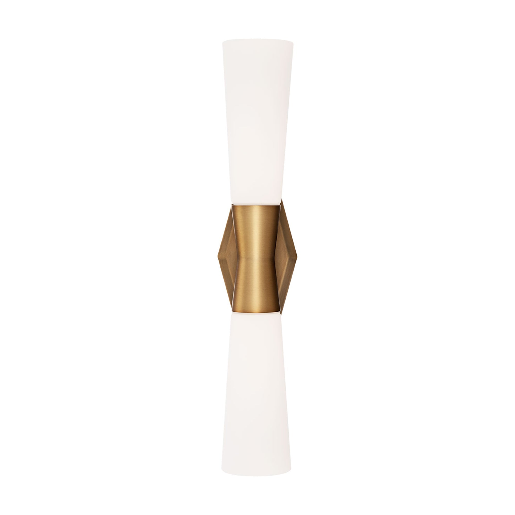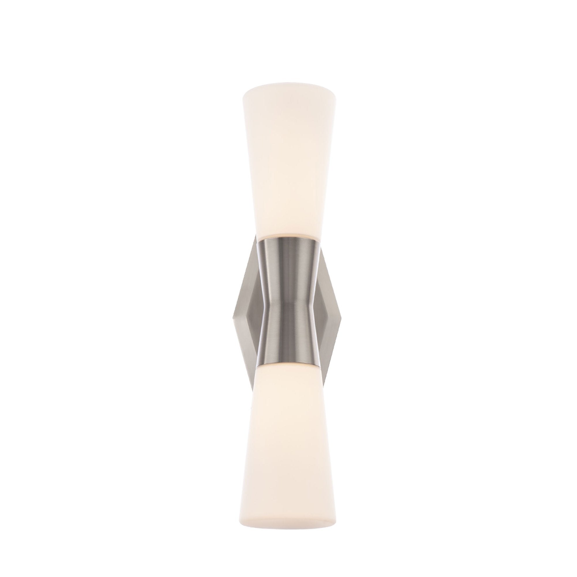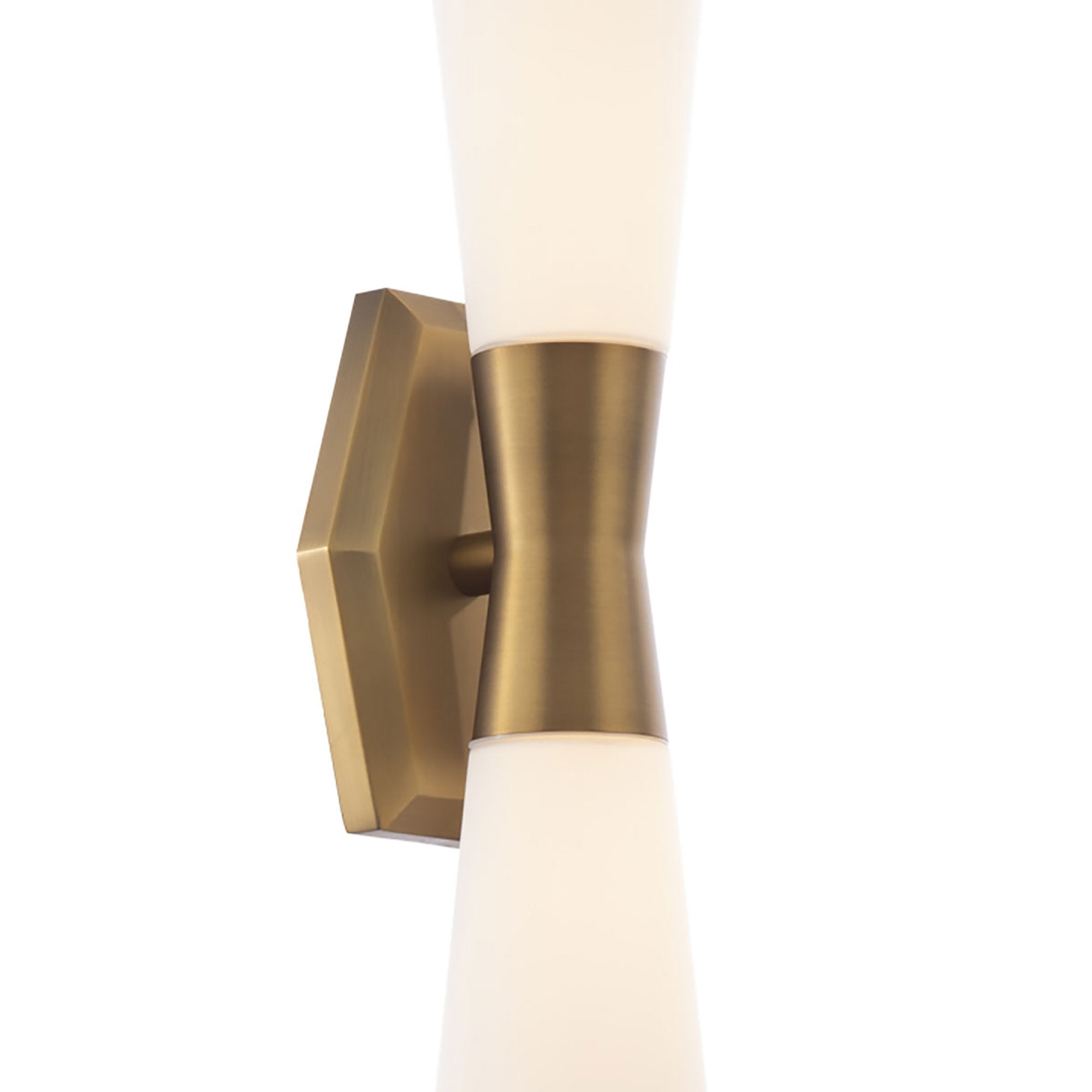Embellishing a custom modern space, the Locke LED Bath Wall Light from dweLED meshes architecture and art with a hint of retro inspiration, blending aluminum and opal glass to shape a sleek silhouette perfect for accent lighting.