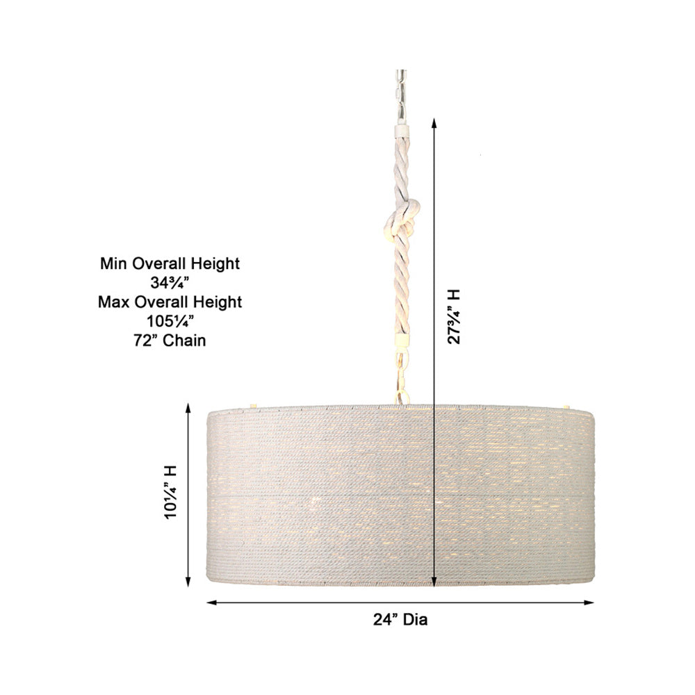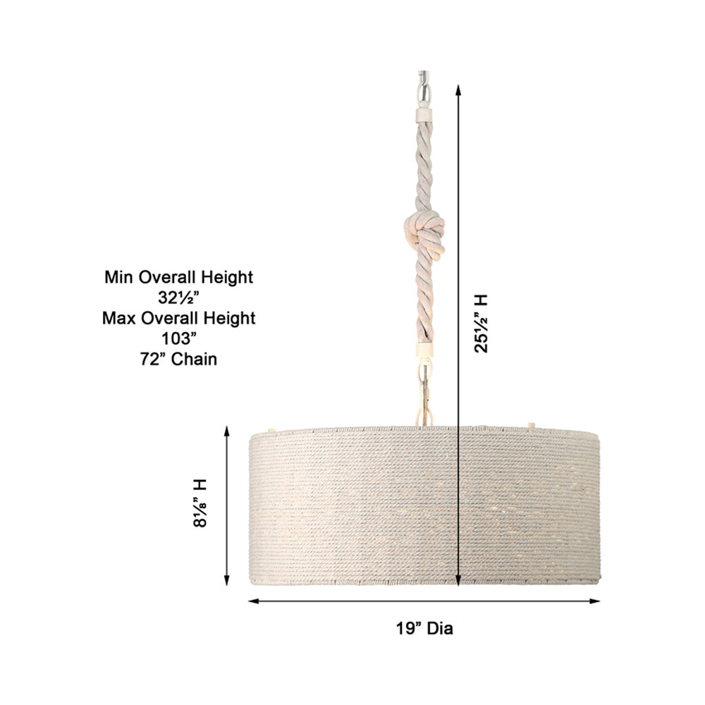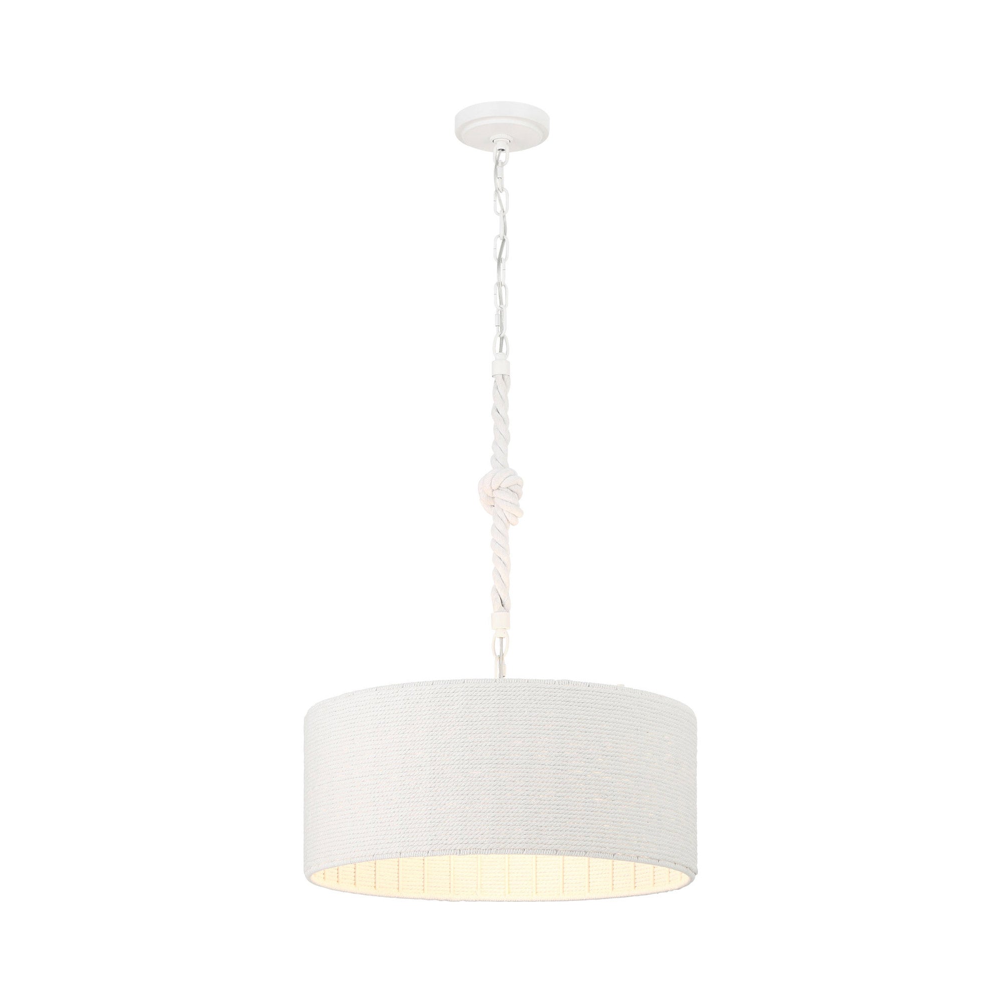 The Lodelle Pendant Light from Minka Lavery embellishes a casual coastal-inspired setting, delivering minimalism with a touch of elegance. Smooth construction blends a tasteful white drum shade suspending from rope, adding an organic feel.