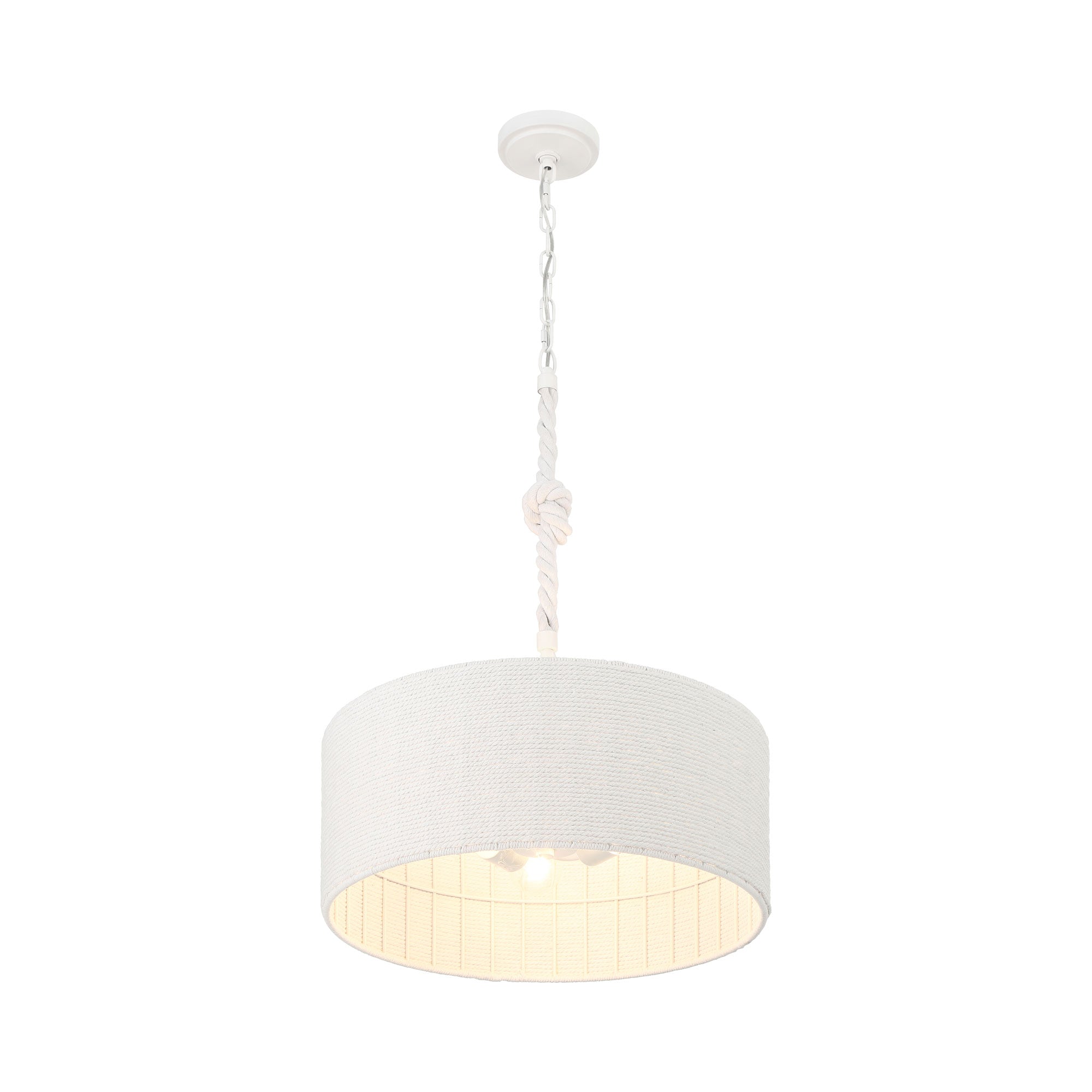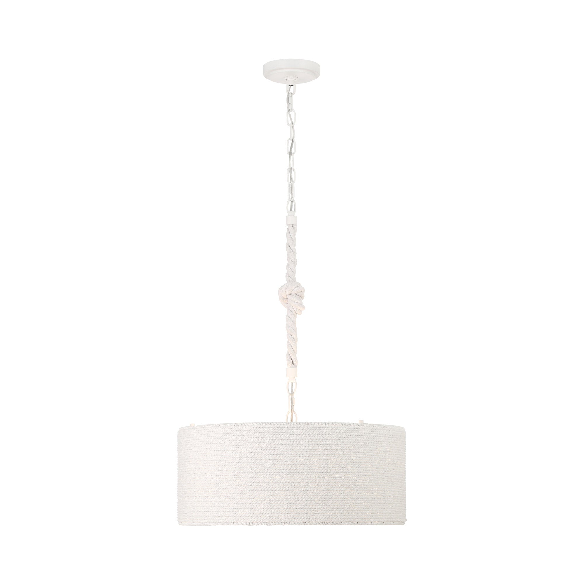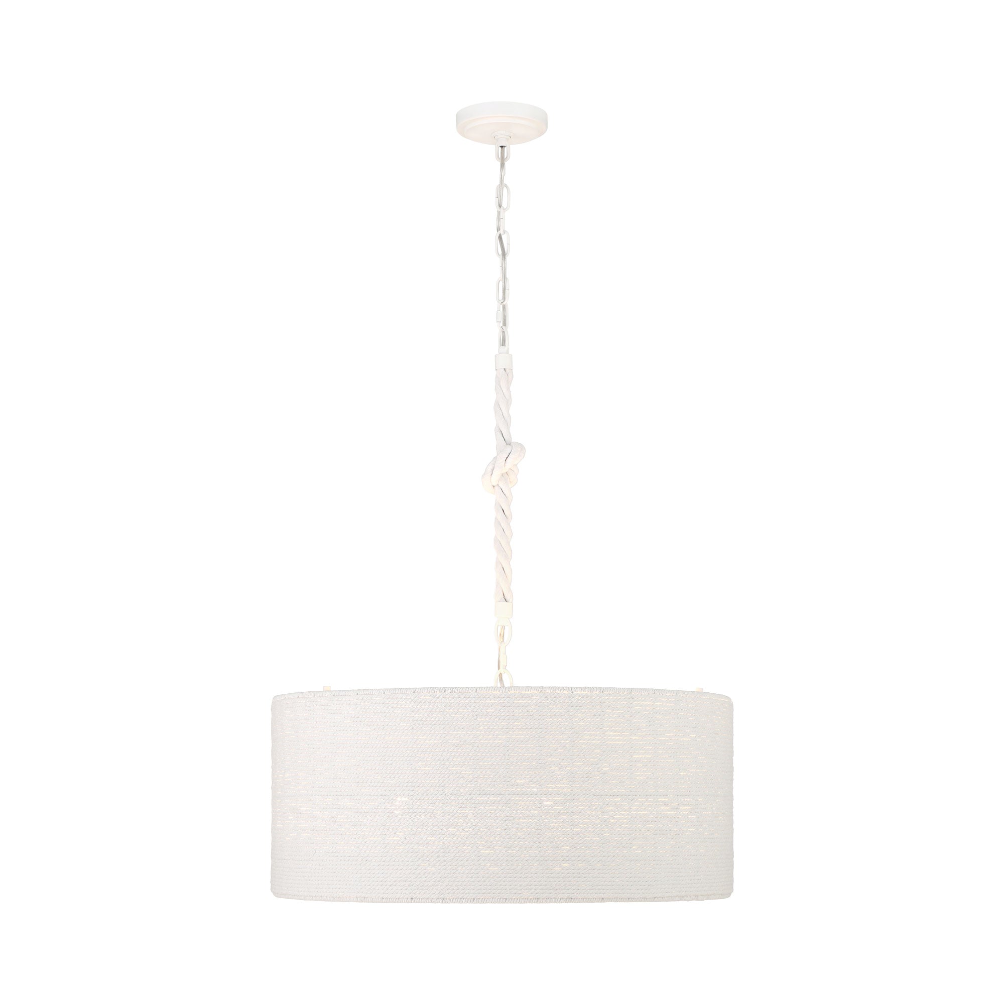 The Lodelle Pendant Light from Minka Lavery embellishes a casual coastal-inspired setting, delivering minimalism with a touch of elegance. Smooth construction blends a tasteful white drum shade suspending from rope, adding an organic feel.