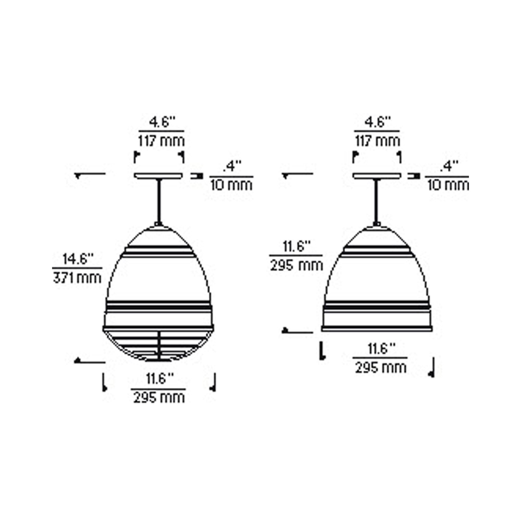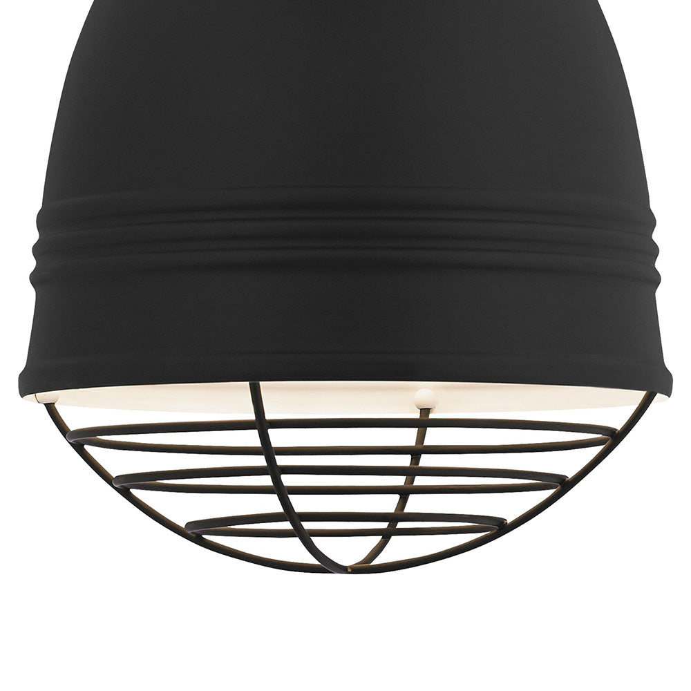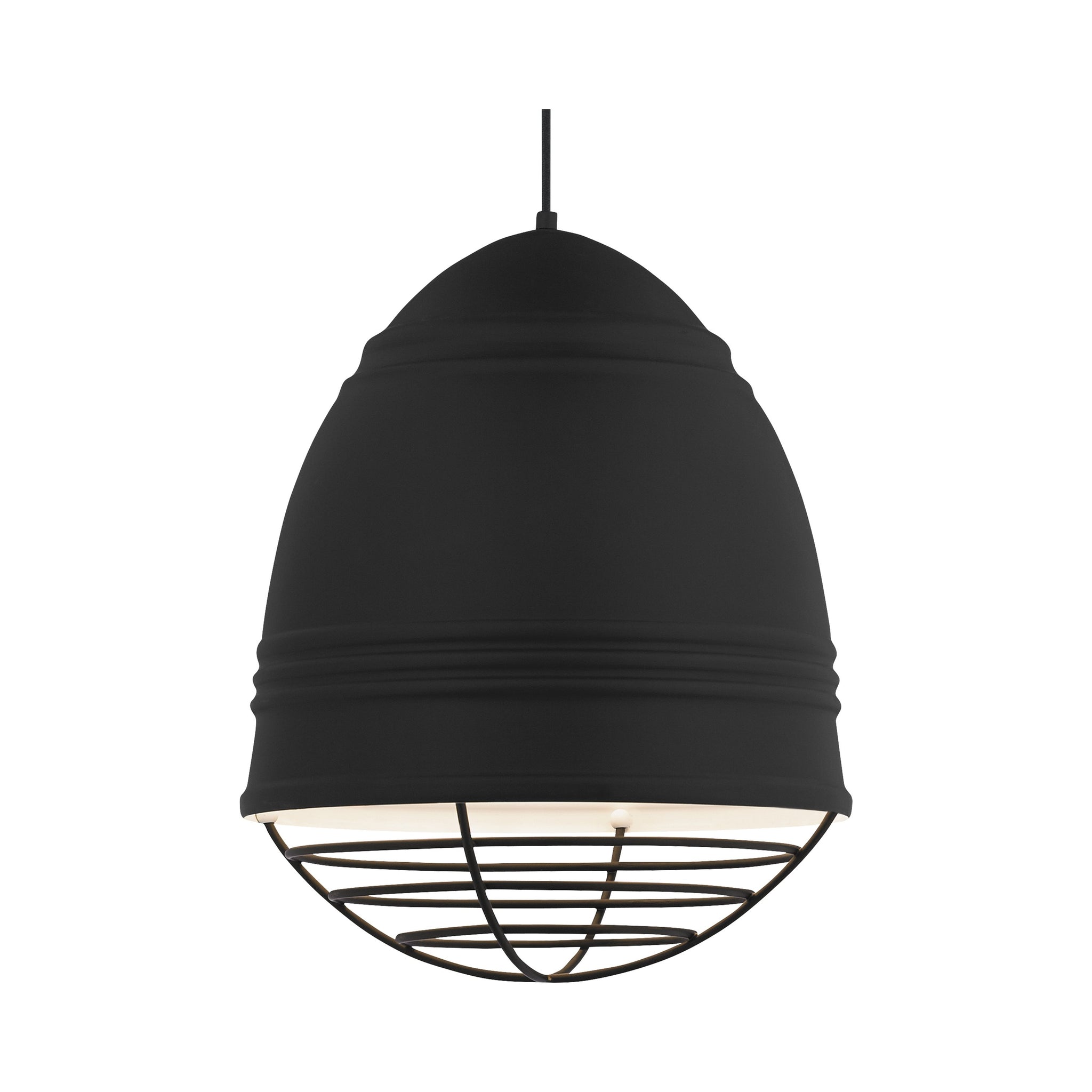 This stylized and elevated interpretation of industrial high bay lighting features rubberized paint on the ribbed spun-metal shade to provide a smooth, matte finish while a choice of metallic plated cage adds a custom look. Offered in two industrial finishes, rubberized black and brushed aluminum and the choice of 2 cage-finishes, black and copper or no-age at all. The Loft Grande Pendant applies an updated look to any industrial setting. This grand scale pendant has a diameter of 17.3" with a smaller option, Loft scaling at 11.6" diameter.