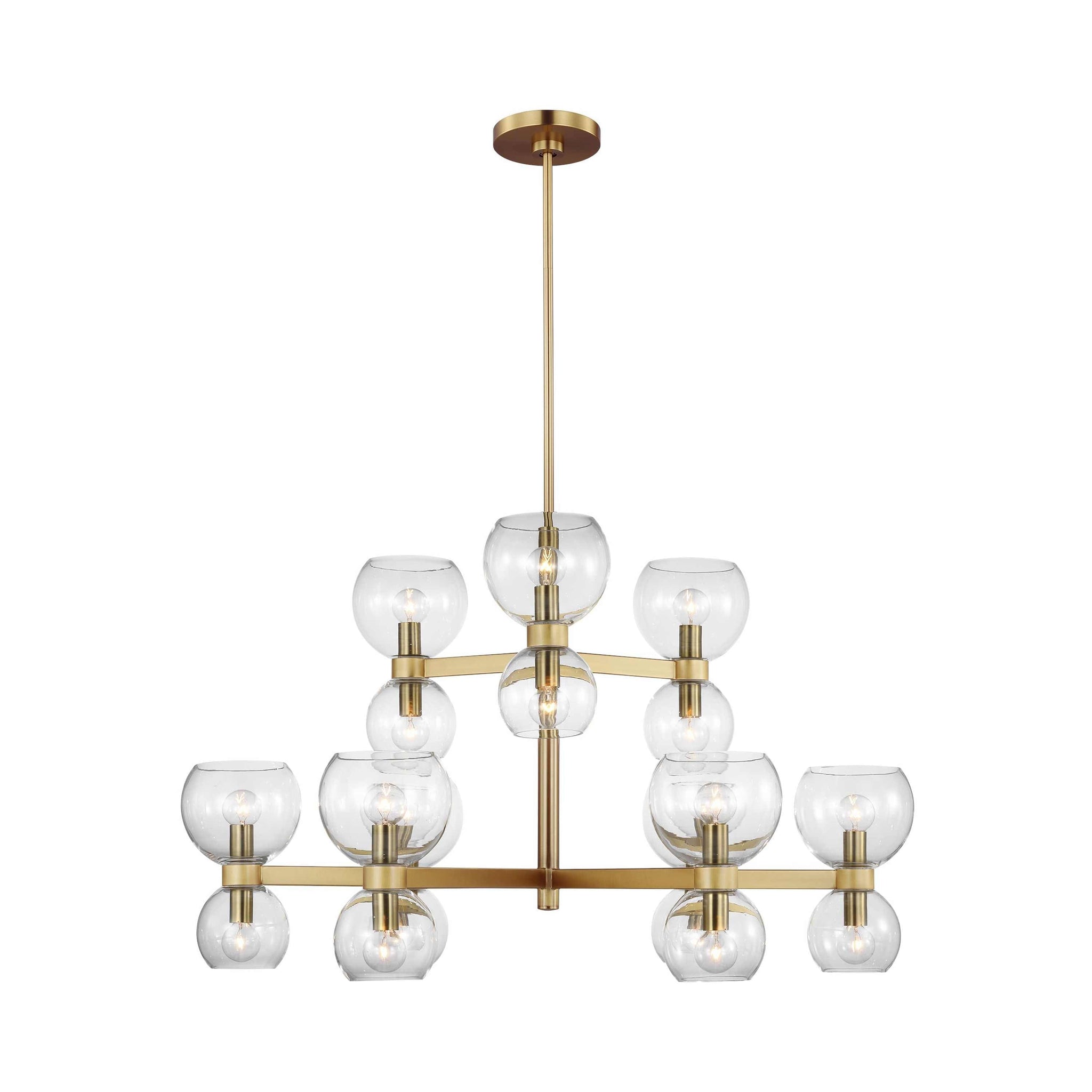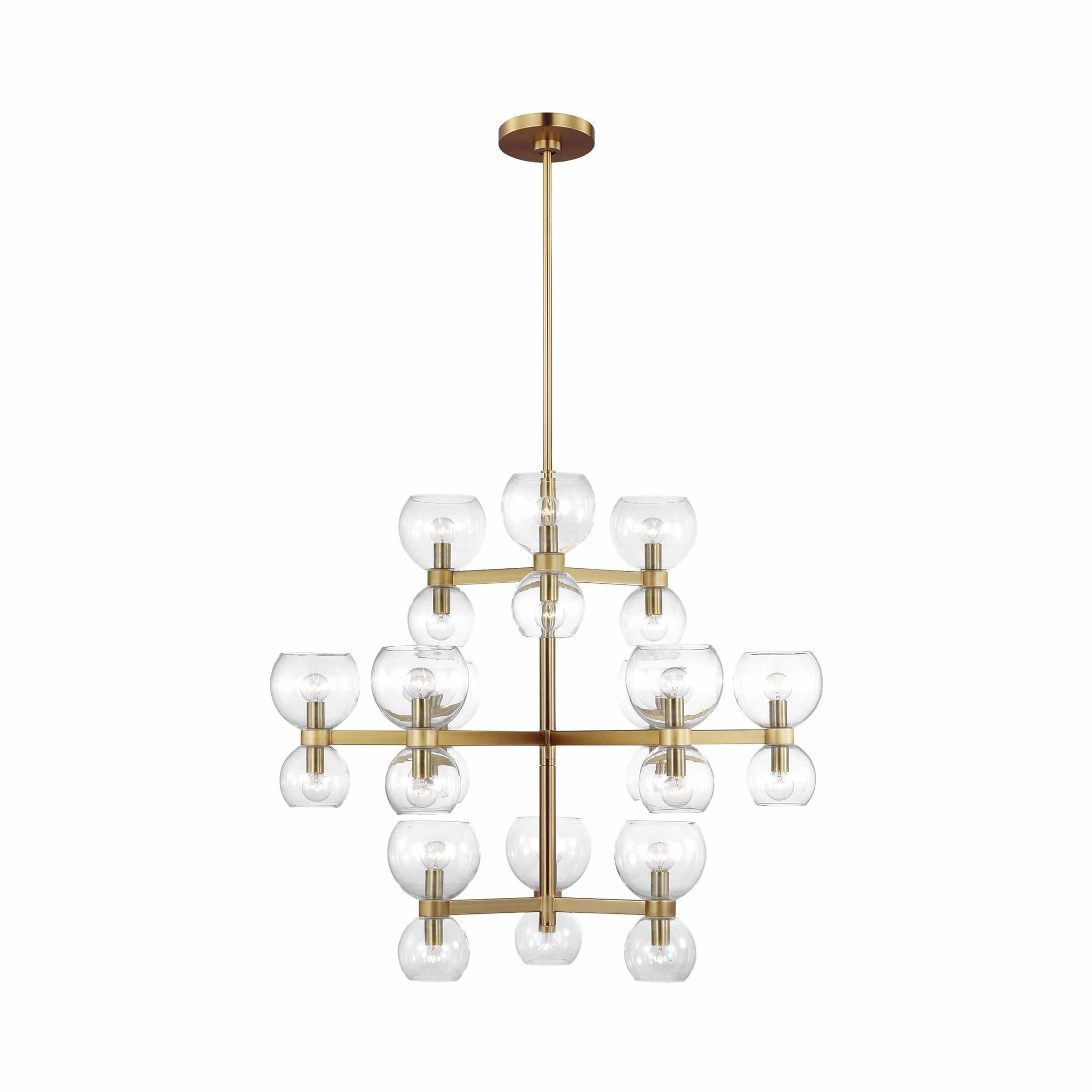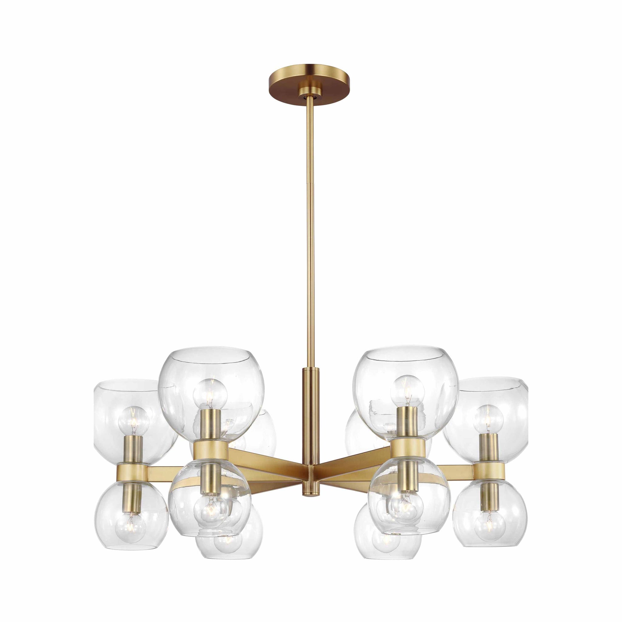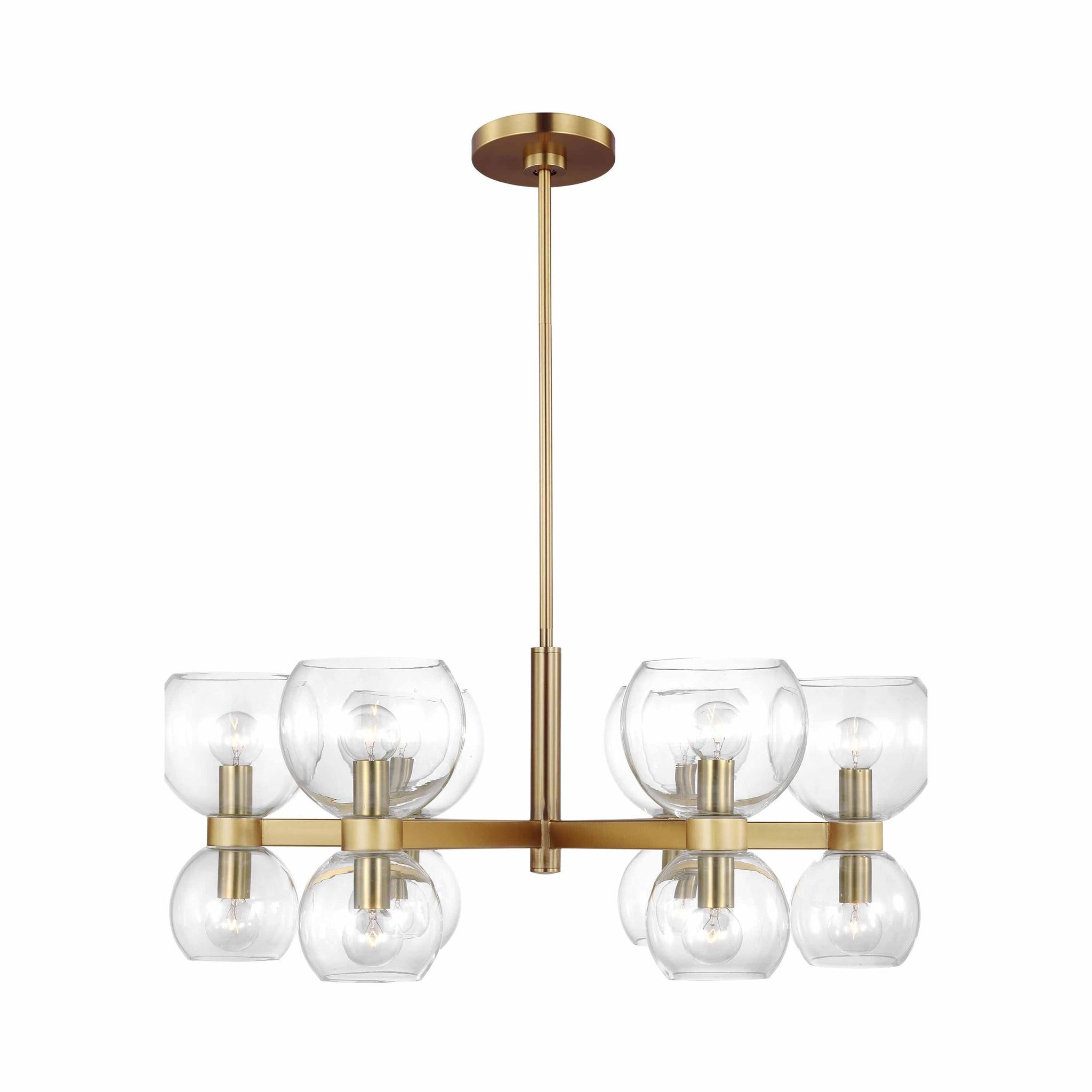 Londyn is inspired by geometric playful midcentury fixtures in metal and glass with exciting profiles and scale play. Rectangle stock metal rods and a playful layout of blown glass globes in two sizes with elegant metal cuffs create visual interest. This chandelier would be great above a dining table or casual island/nook.