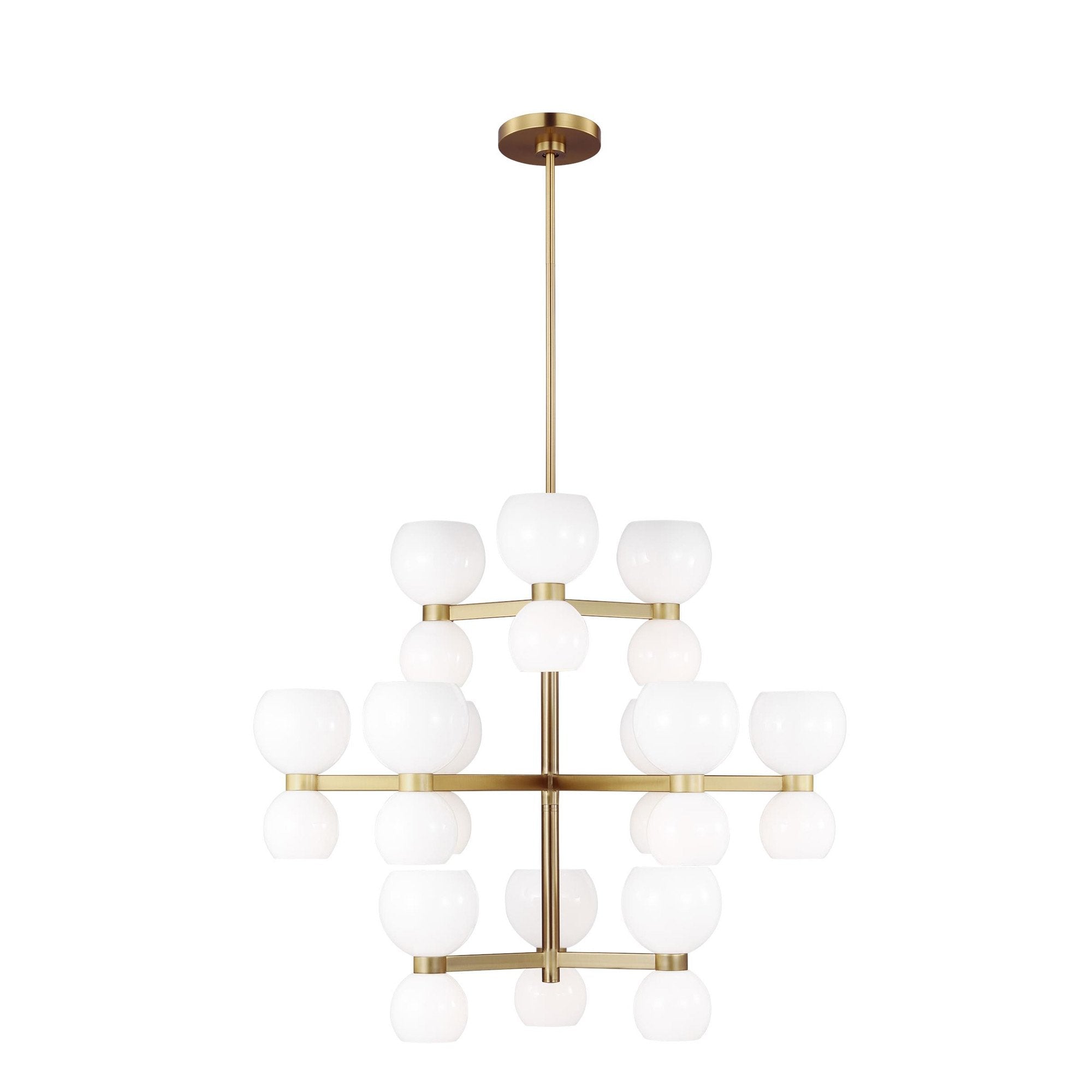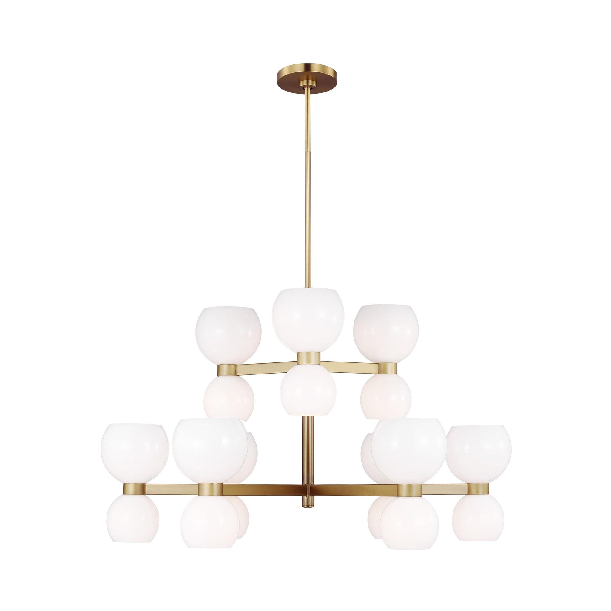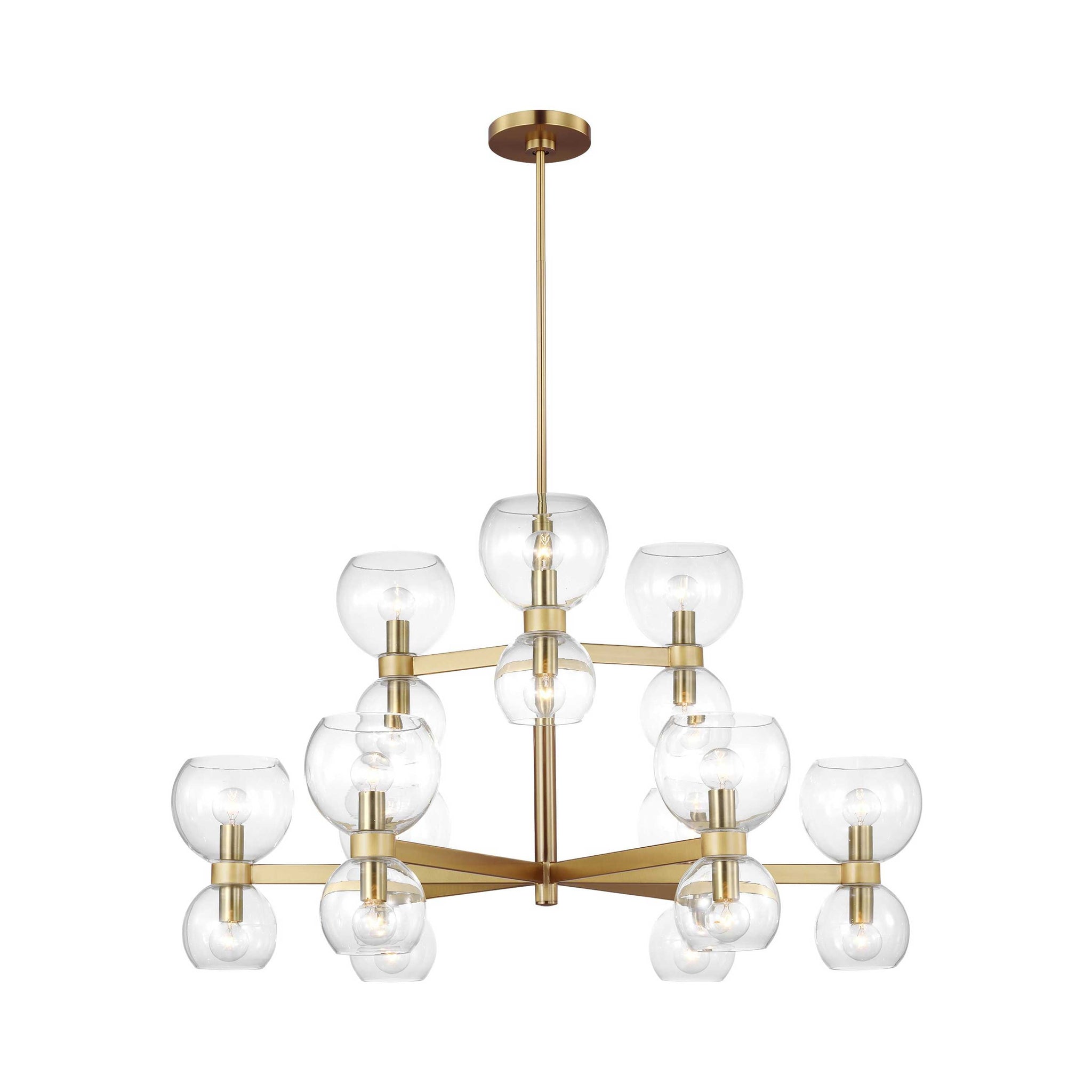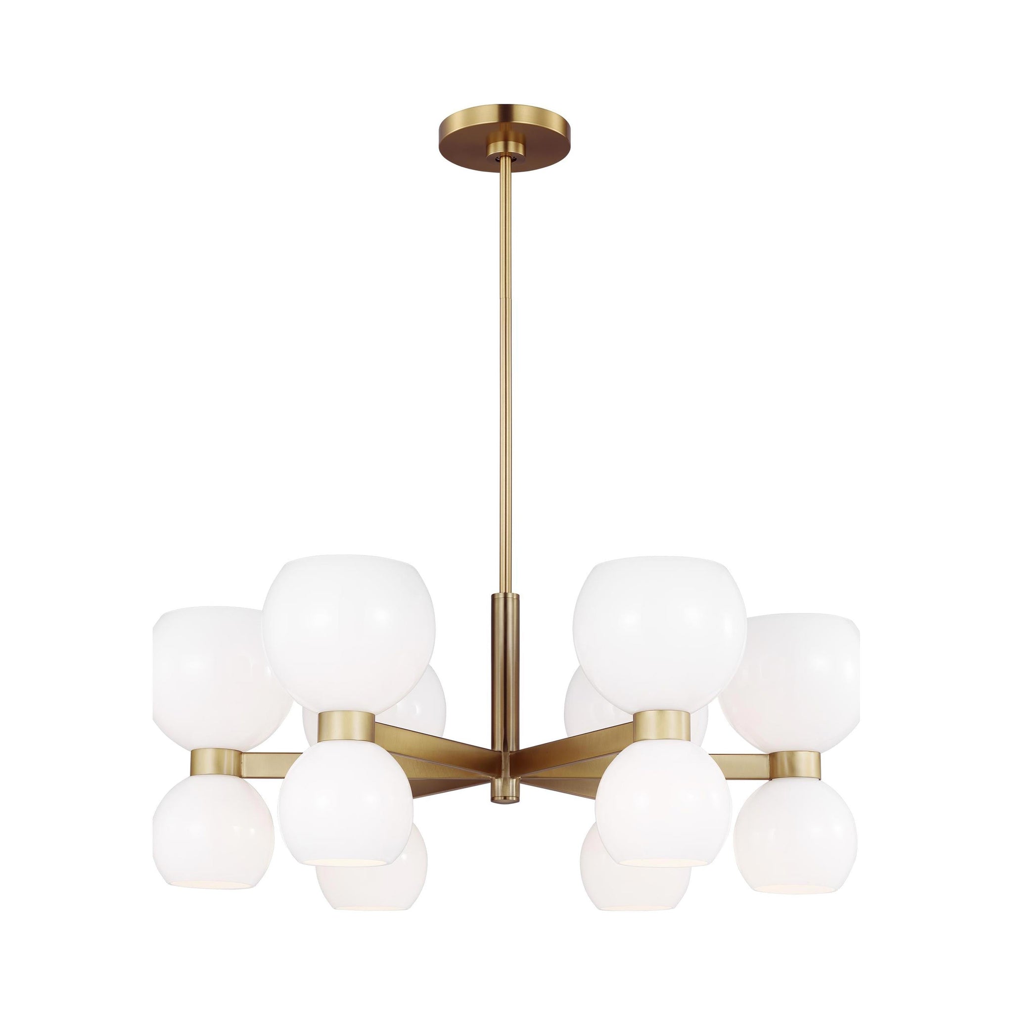 Londyn is inspired by geometric playful midcentury fixtures in metal and glass with exciting profiles and scale play. Rectangle stock metal rods and a playful layout of blown glass globes in two sizes with elegant metal cuffs create visual interest. This chandelier would be great above a dining table or casual island/nook.