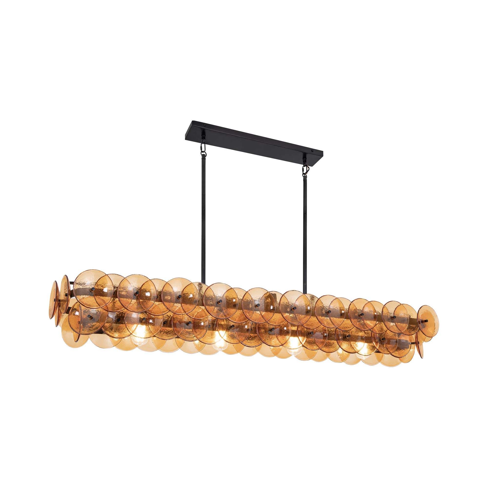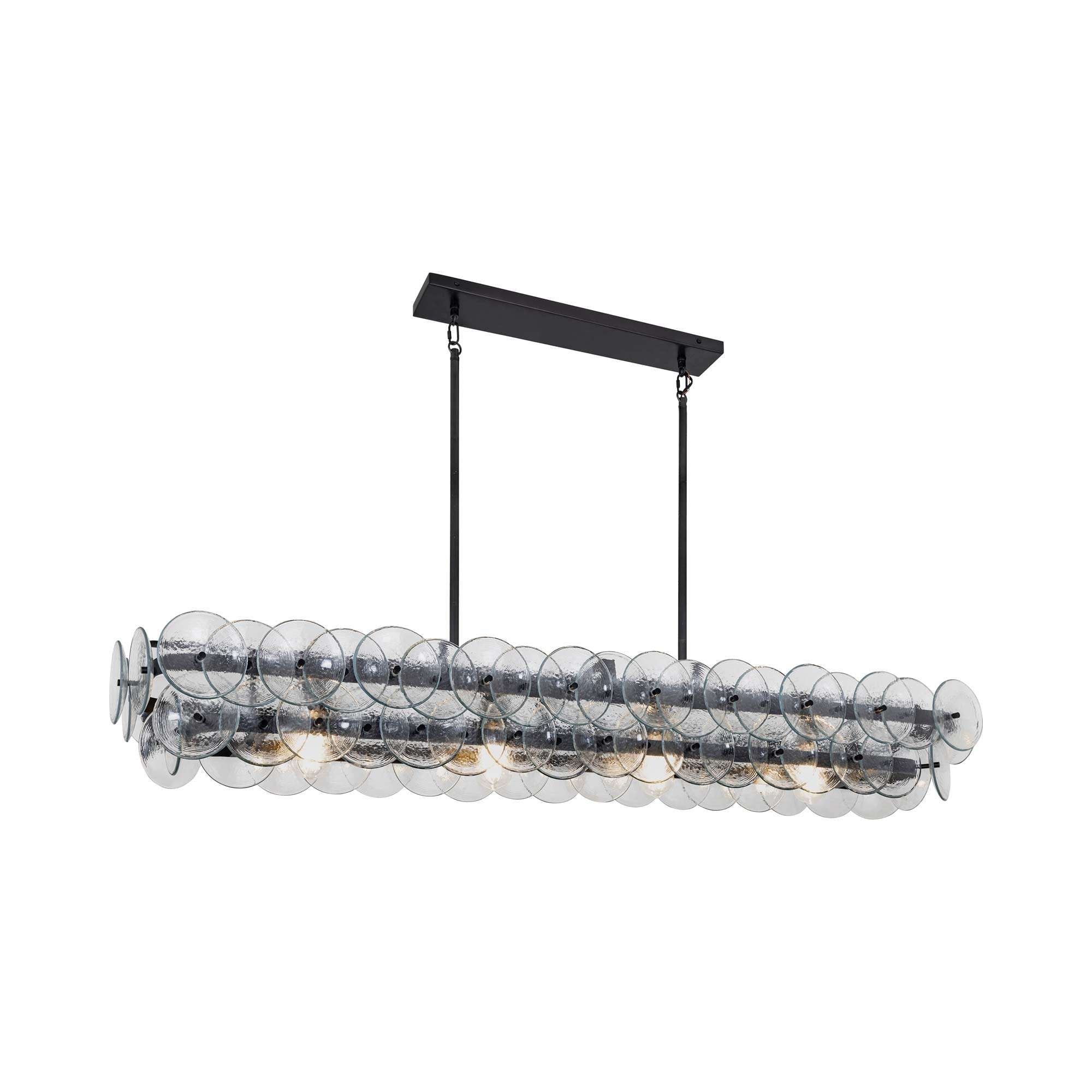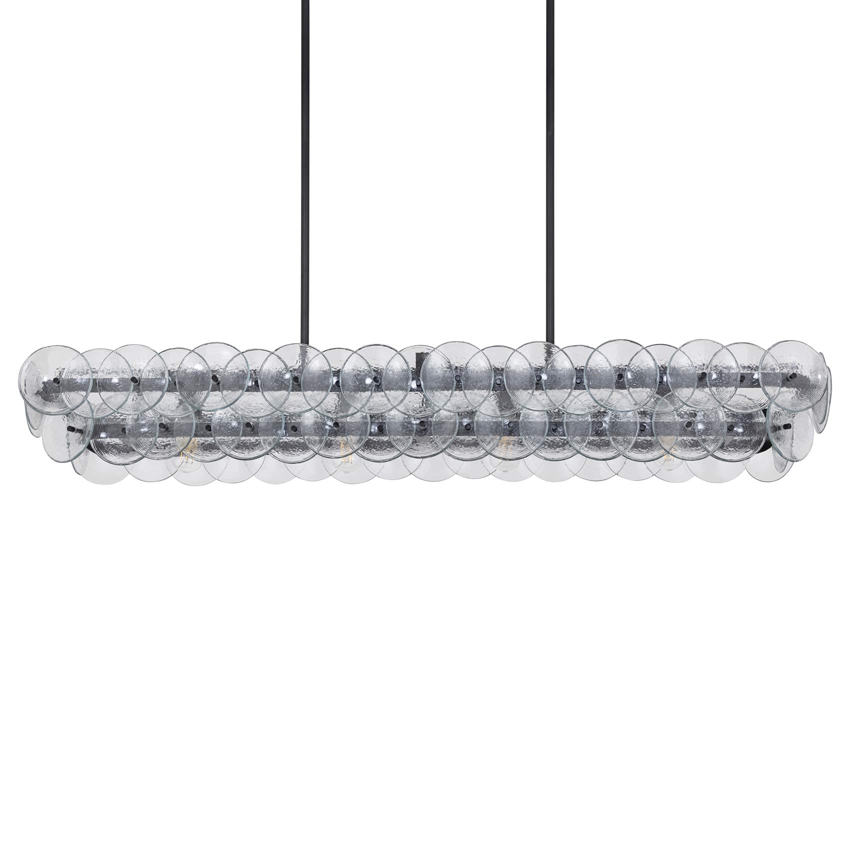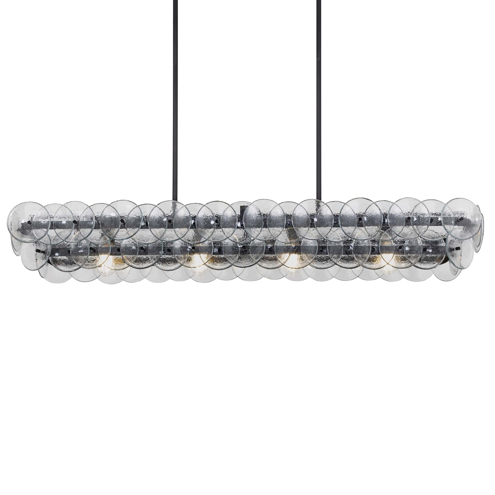 Hyped up with an eclectic design, the Loren Linear Chandelier from Maxim Lighting produces an insightful foray into transitional style. This chic light is perfect for placement over a kitchen island or bar space as its oval frame and matching metal canopy deliver critical spatial interruption. Festive textured glass wafers align to act as light diffusers as well as decorative elements.