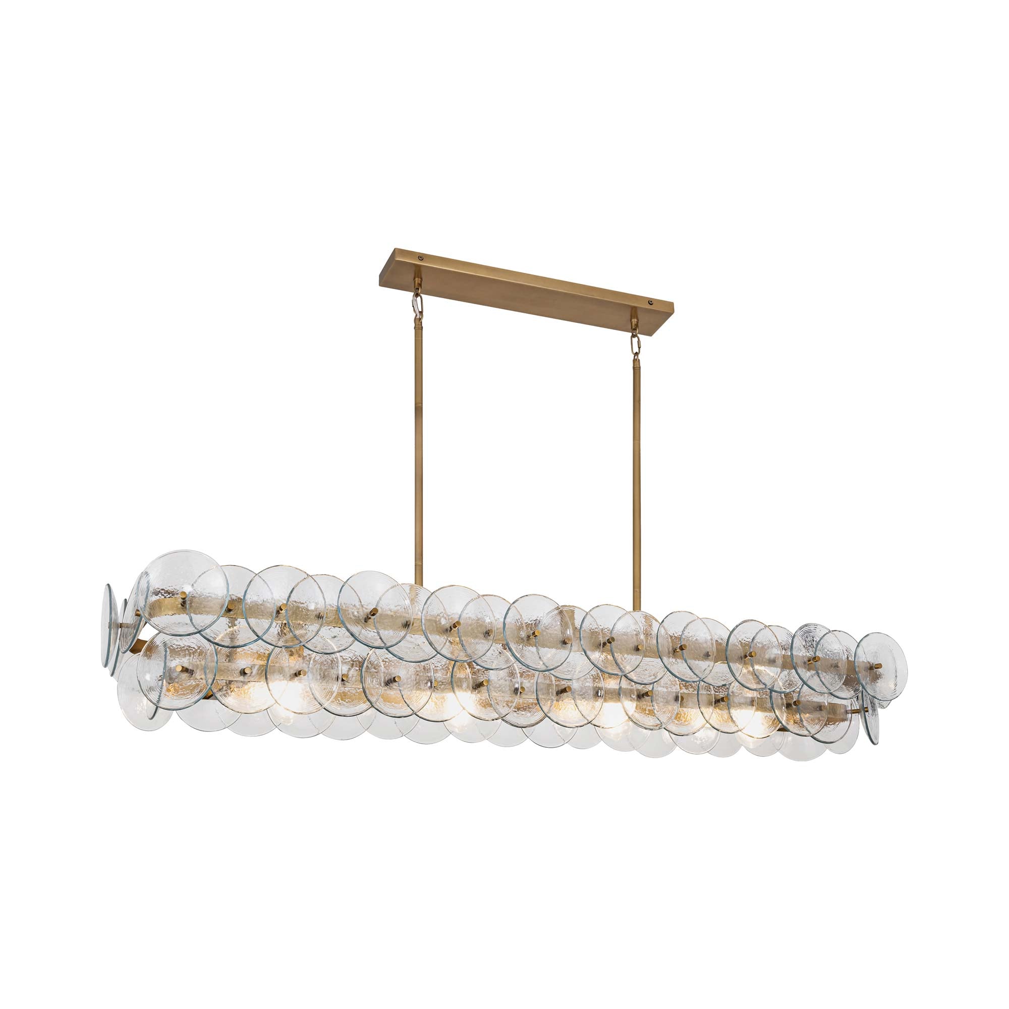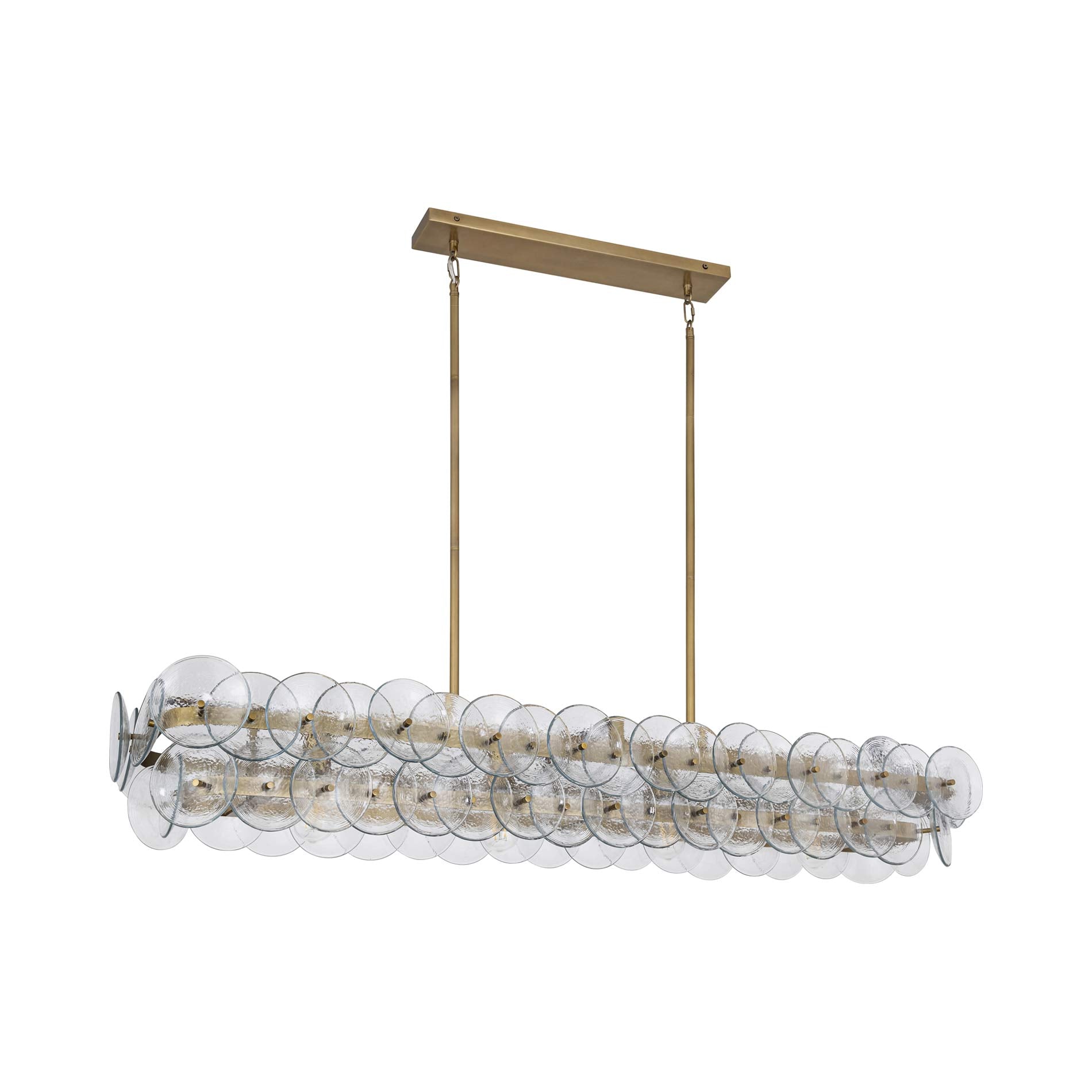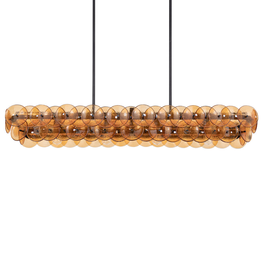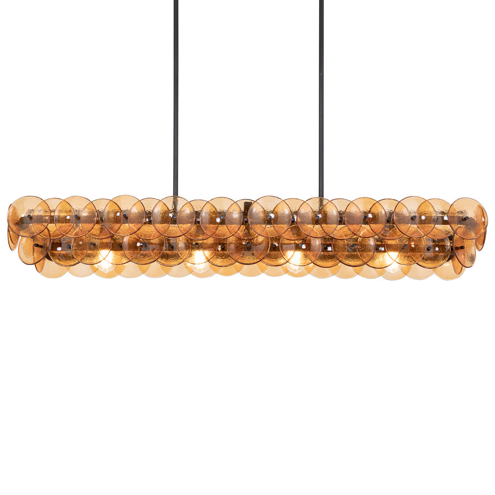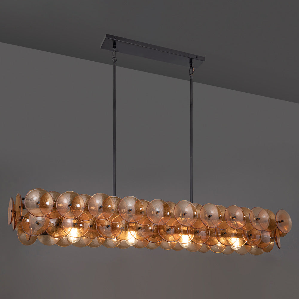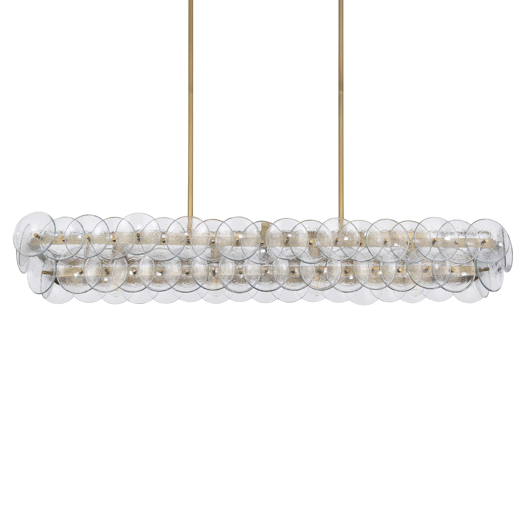 Hyped up with an eclectic design, the Loren Linear Chandelier from Maxim Lighting produces an insightful foray into transitional style. This chic light is perfect for placement over a kitchen island or bar space as its oval frame and matching metal canopy deliver critical spatial interruption. Festive textured glass wafers align to act as light diffusers as well as decorative elements.