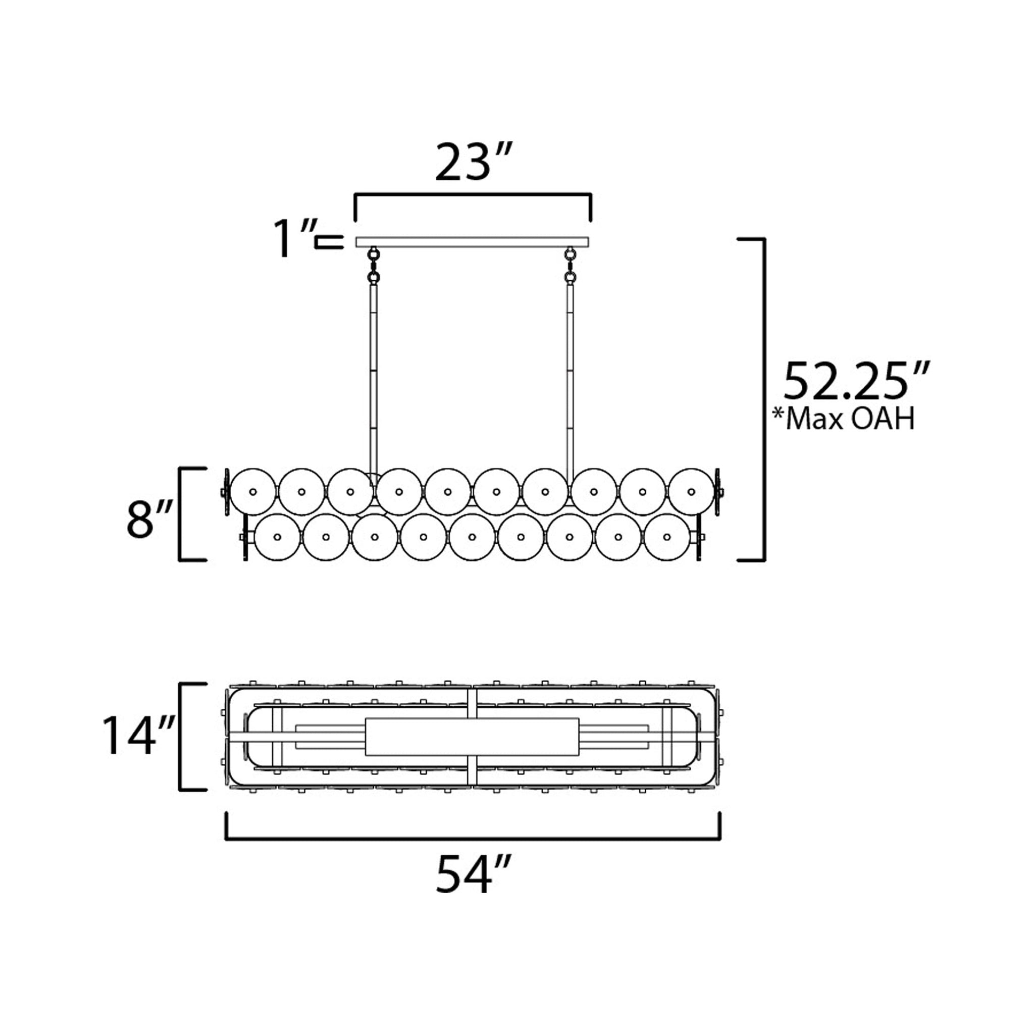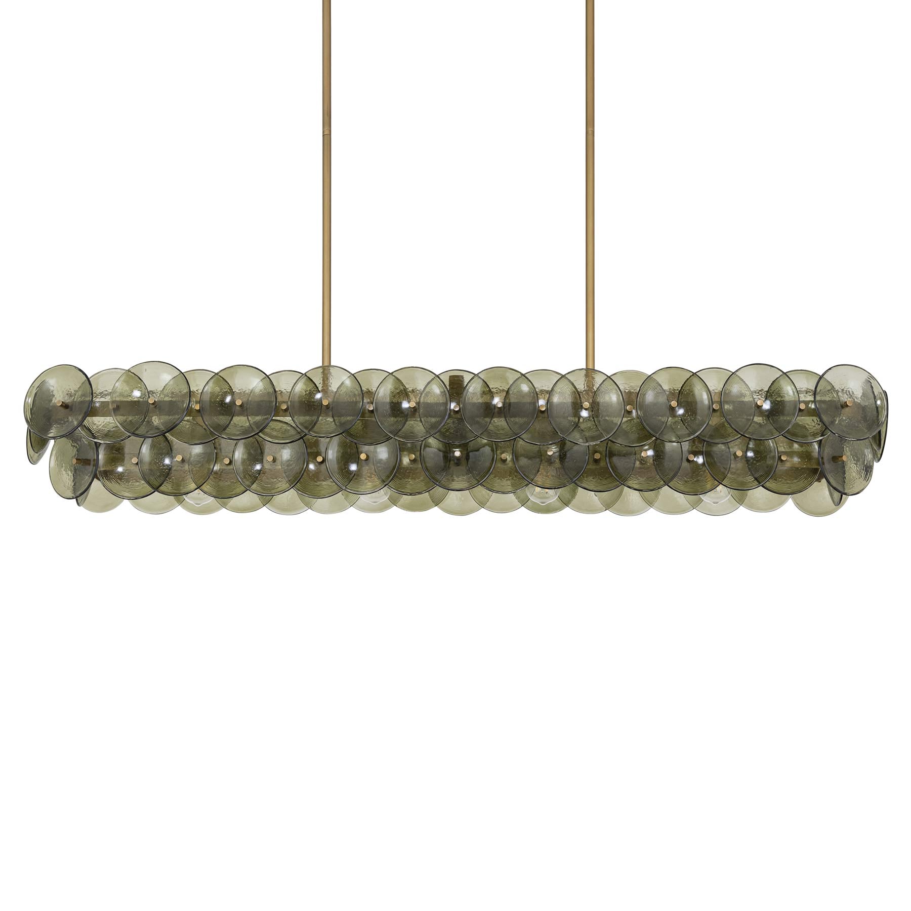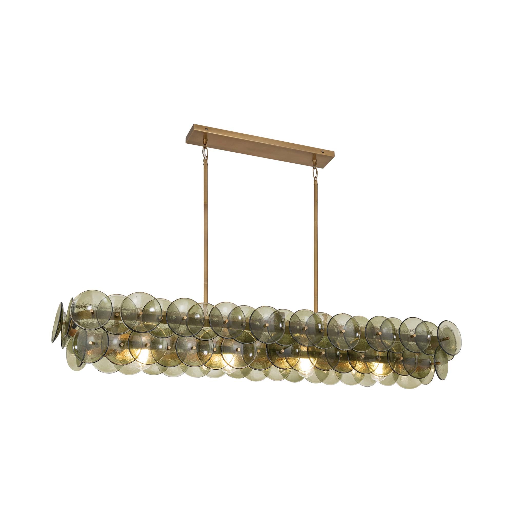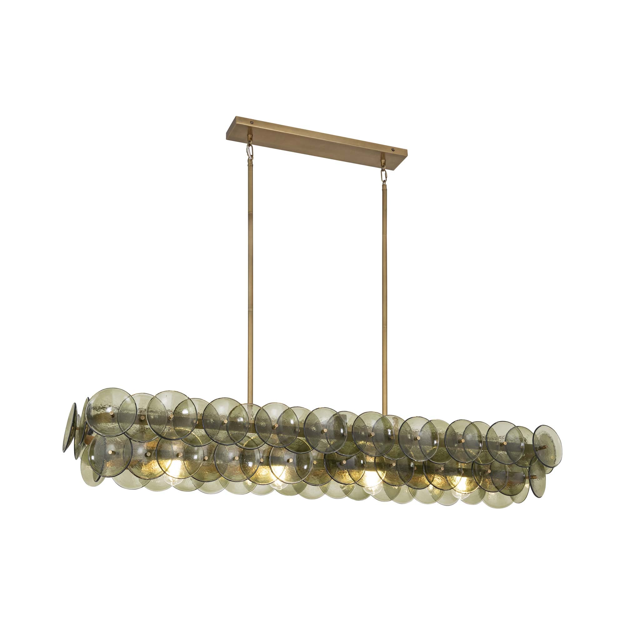 Hyped up with an eclectic design, the Loren Linear Chandelier from Maxim Lighting produces an insightful foray into transitional style. This chic light is perfect for placement over a kitchen island or bar space as its oval frame and matching metal canopy deliver critical spatial interruption. Festive textured glass wafers align to act as light diffusers as well as decorative elements.