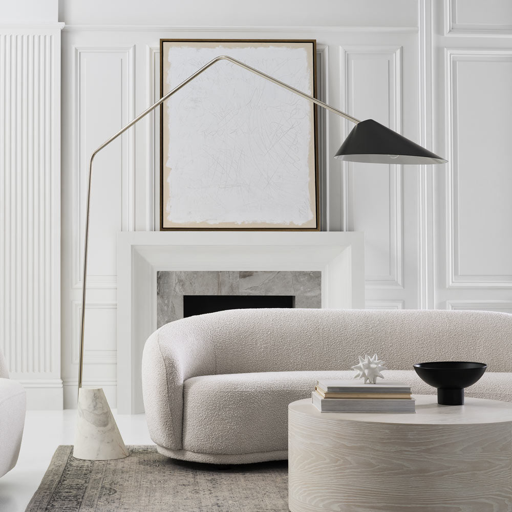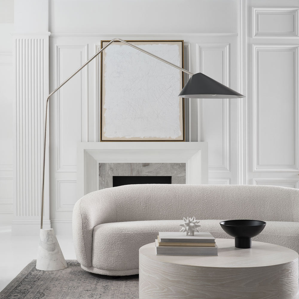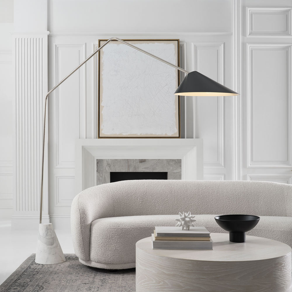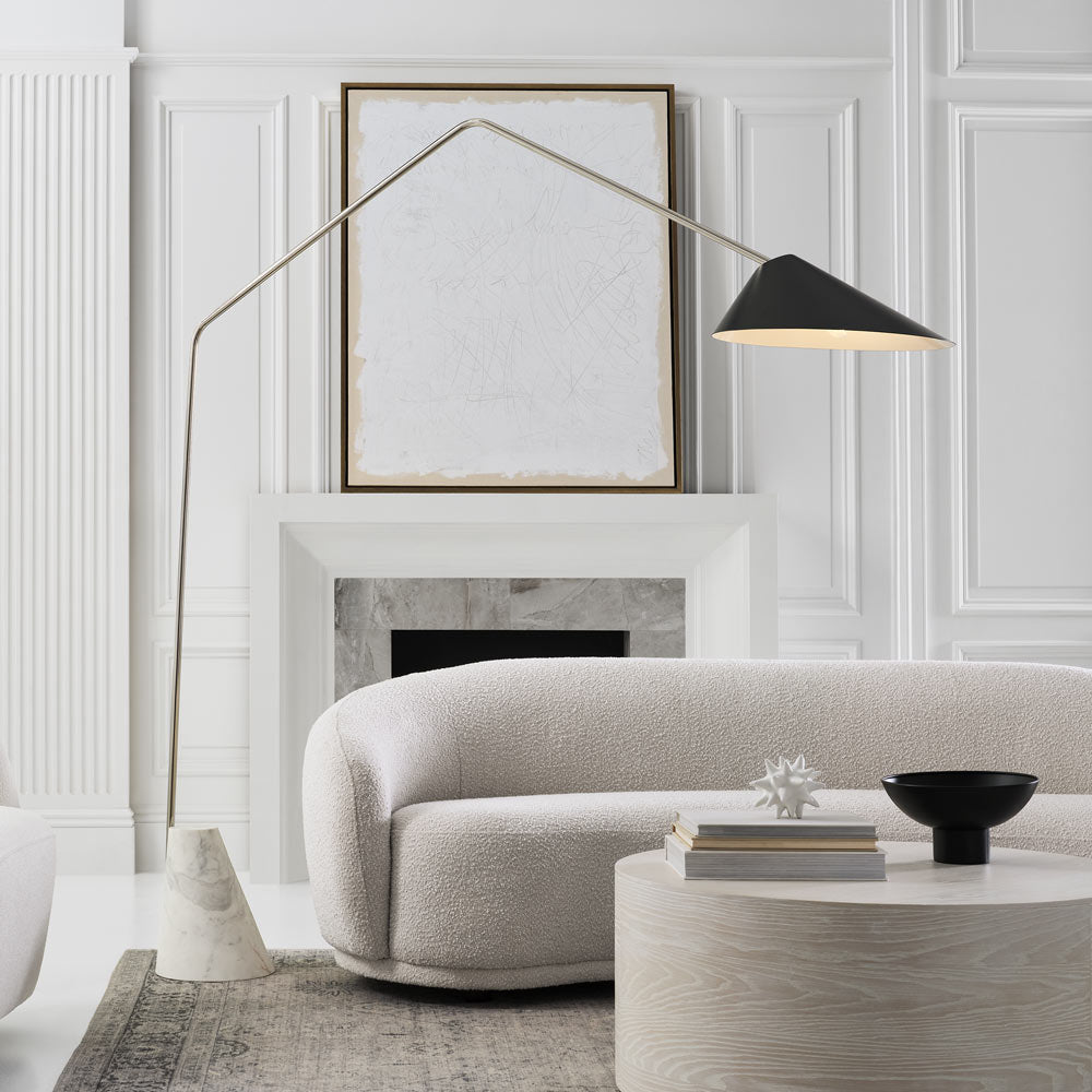 Compelling with a minimalist modern vibe, the Lorna Arc Floor Lamp from Visual Comfort Studio delivers ambient lighting in living spaces or bedrooms, with an extra-large profile becoming a standout décor element. Angled silhouetting starts at one end with a chic angled metal shade and ends in a glam-inspired angled base. A built-in dimming socket offers the convenience and mood-enhancement of variable lighting levels.