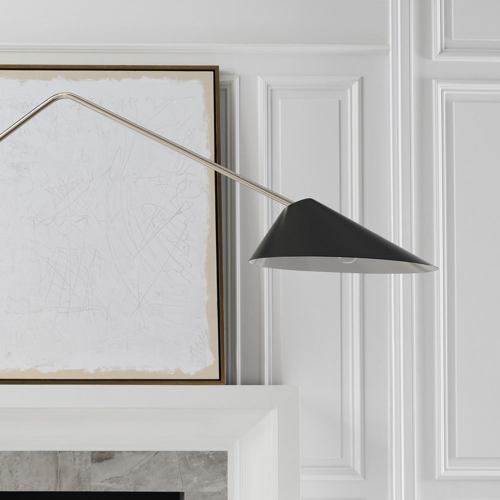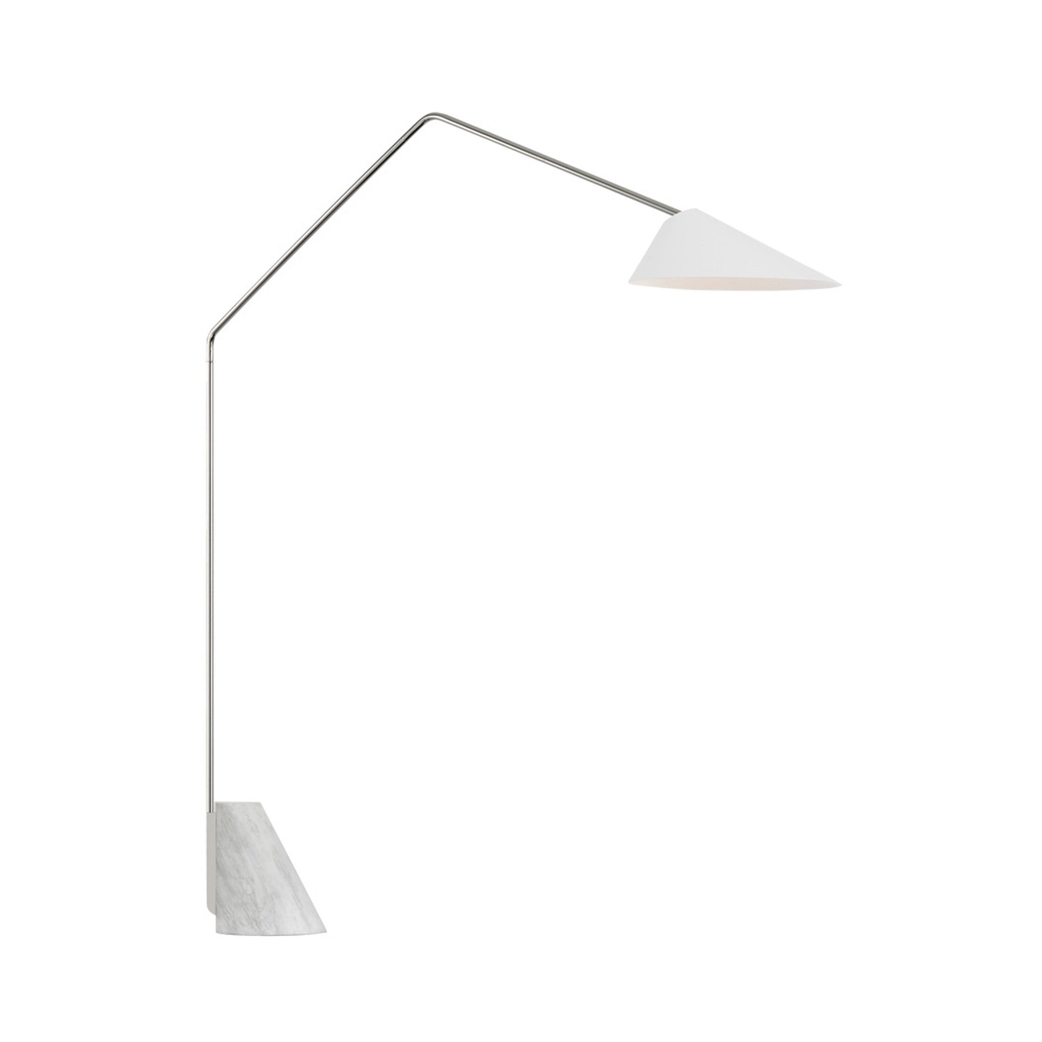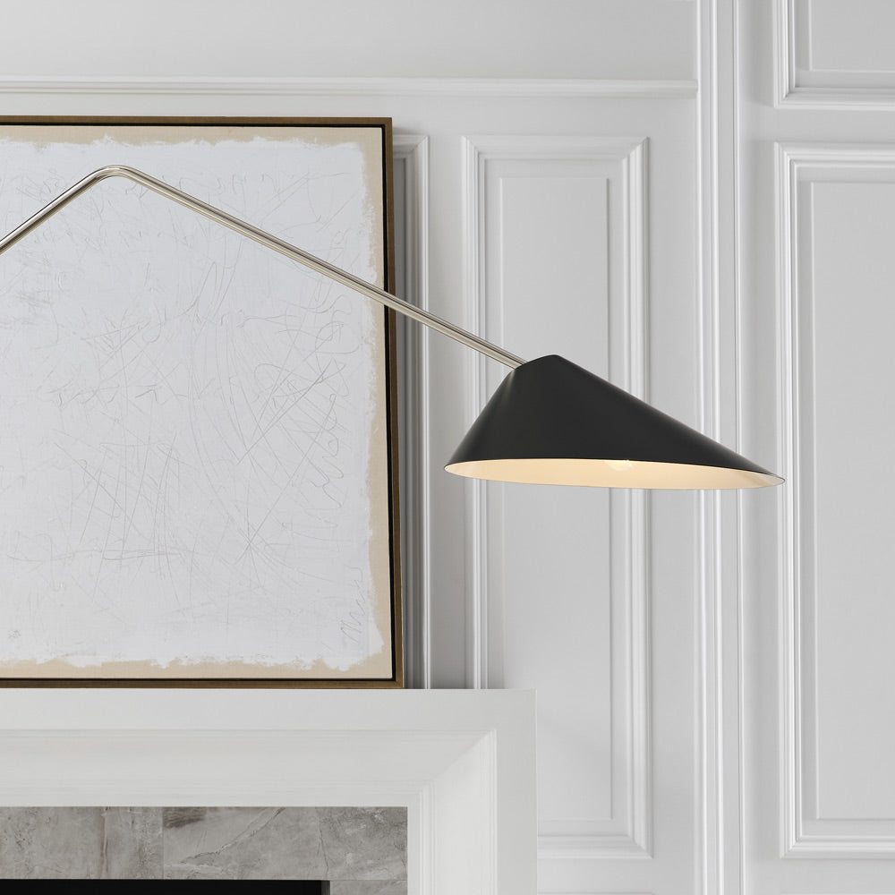 Compelling with a minimalist modern vibe, the Lorna Arc Floor Lamp from Visual Comfort Studio delivers ambient lighting in living spaces or bedrooms, with an extra-large profile becoming a standout décor element. Angled silhouetting starts at one end with a chic angled metal shade and ends in a glam-inspired angled base. A built-in dimming socket offers the convenience and mood-enhancement of variable lighting levels.