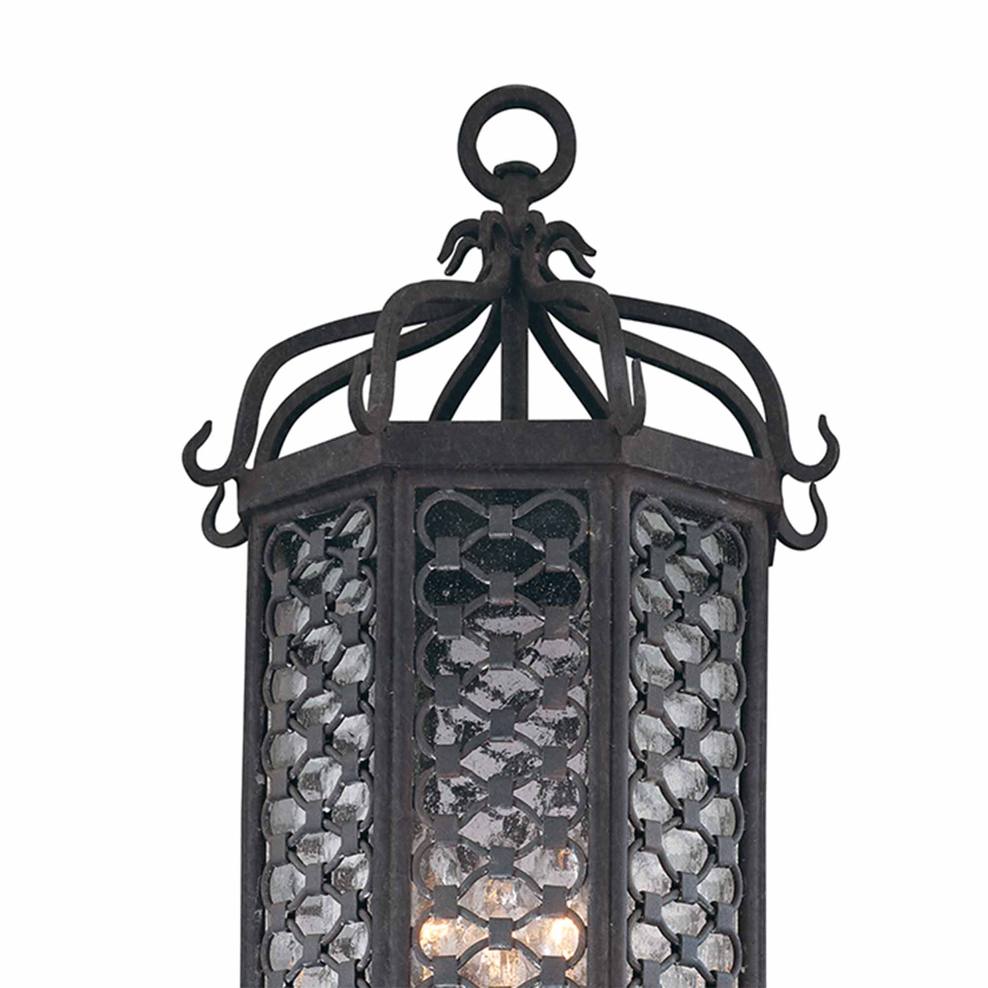 Ornate loop details create a moody, mysterious ambiance for the Los Olivos Outdoor Post Light from Troy Lighting. In a deep textured iron finish, it's capped with a spidery embellishment and features striking glass panes overlaid with looping accents that filter illumination for excellent ambiance on a porch, patio or walkway.