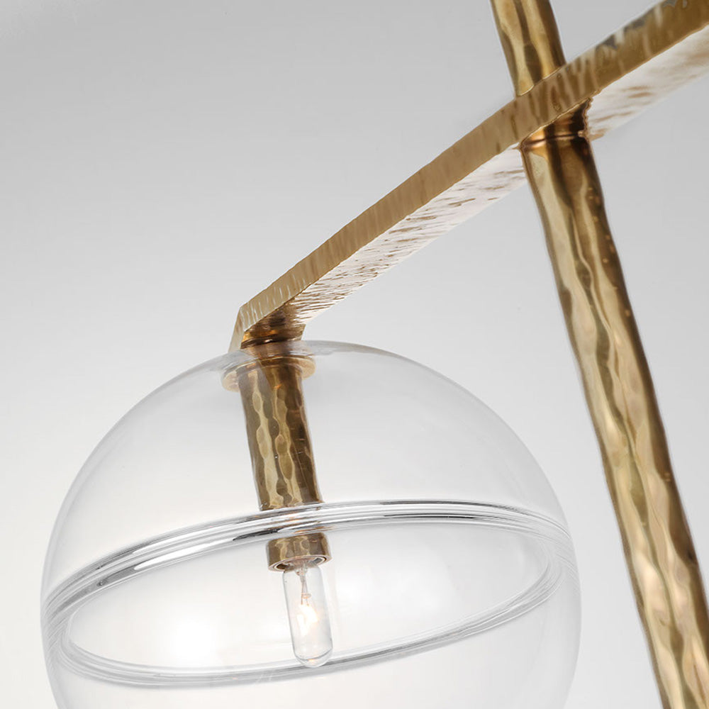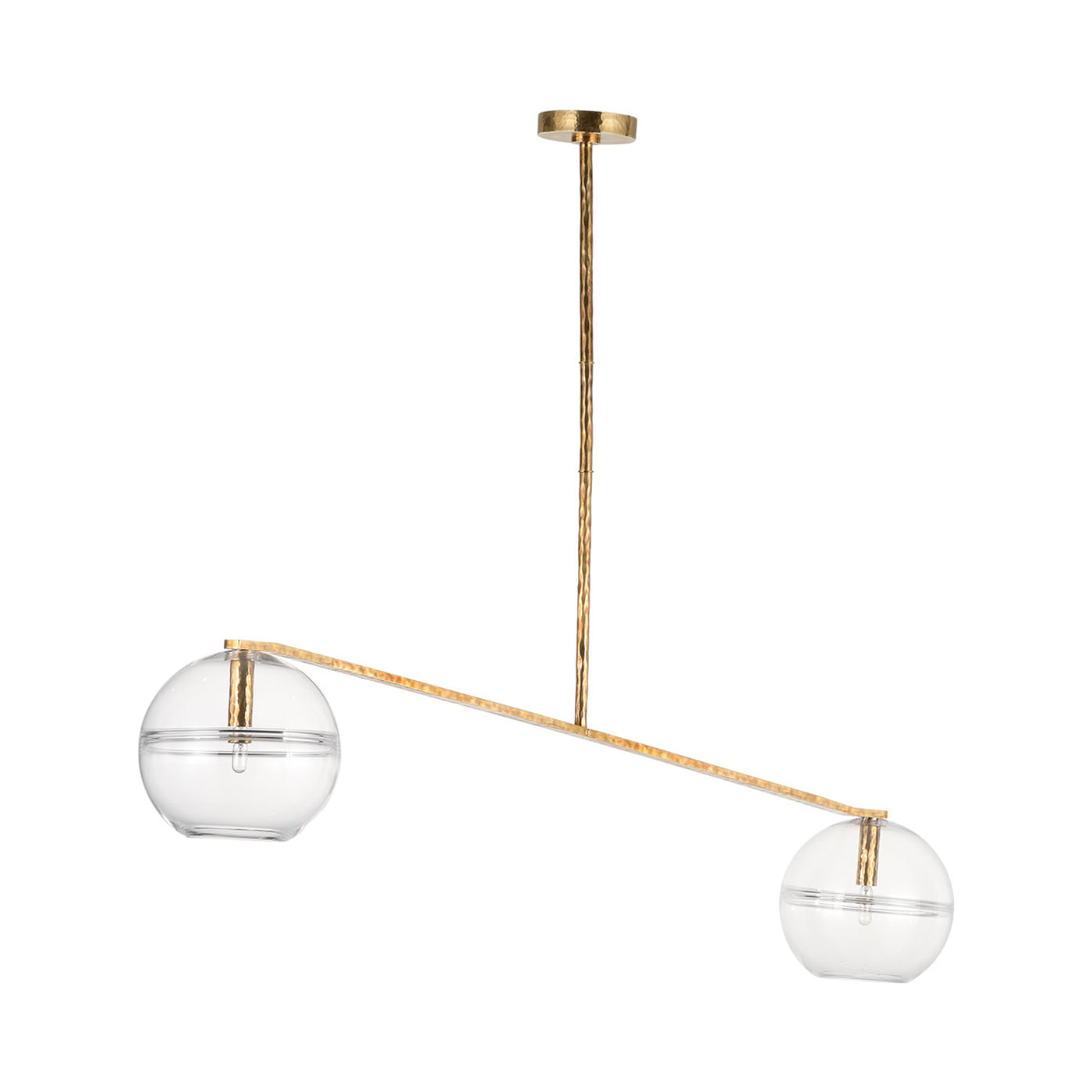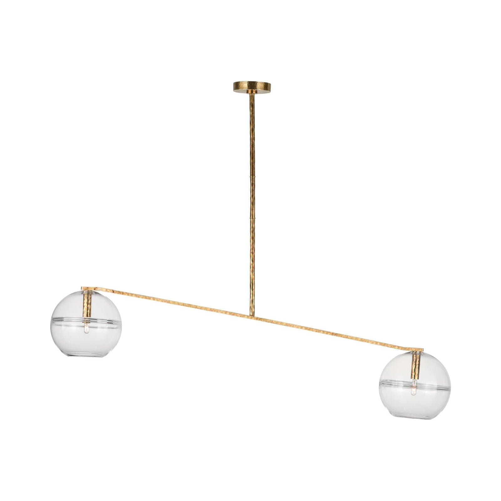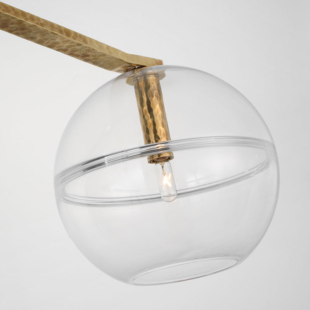 Balance centers the key aesthetic of a light fixture with both glam and simplicity playing parts. The Lowing Chandelier from Visual Comfort Modern offers intriguing optical impact with its angled linear silhouette. Antique brass finish metal framing and accents are upgraded with sparkling globes tipping the scales and creating a notable look.
