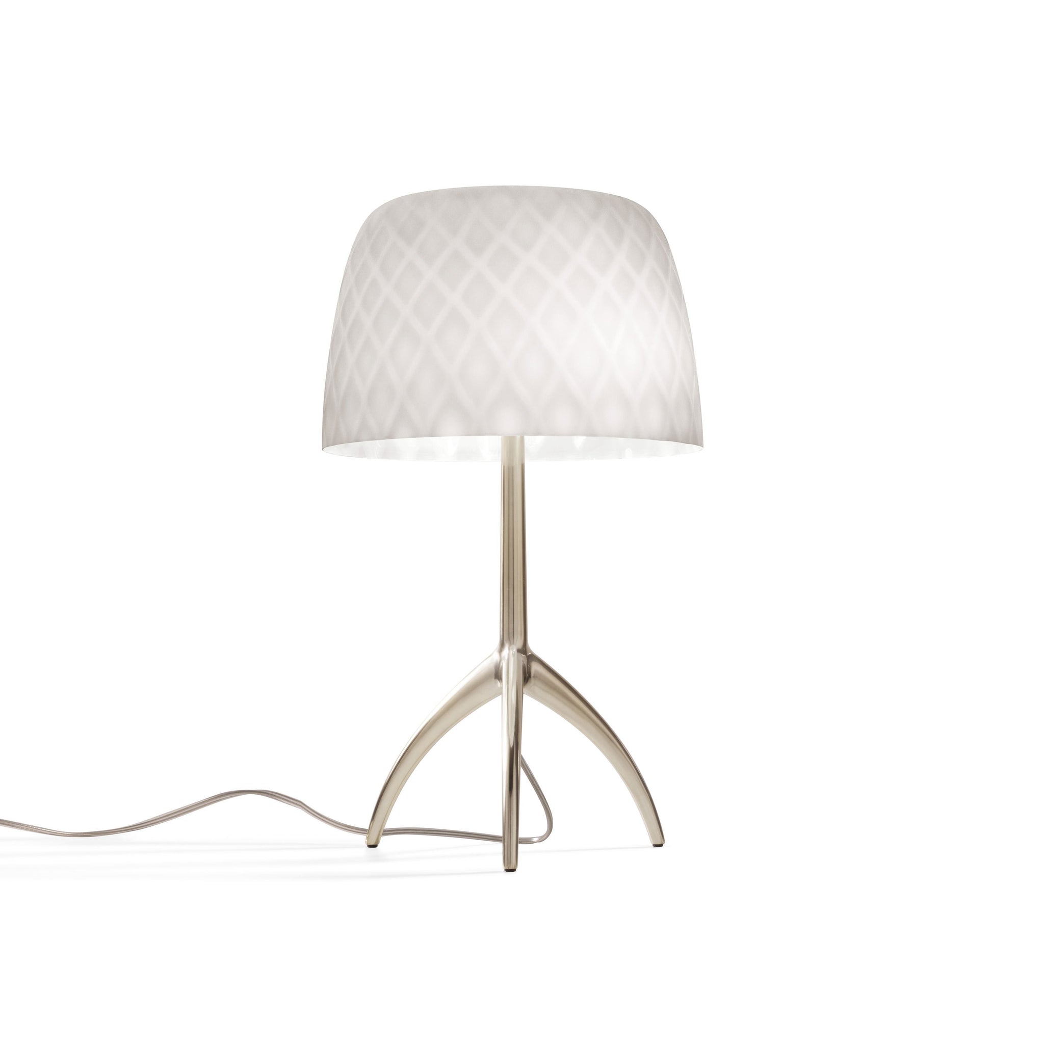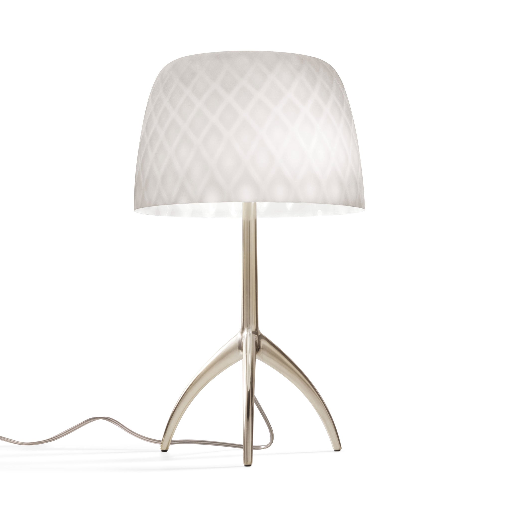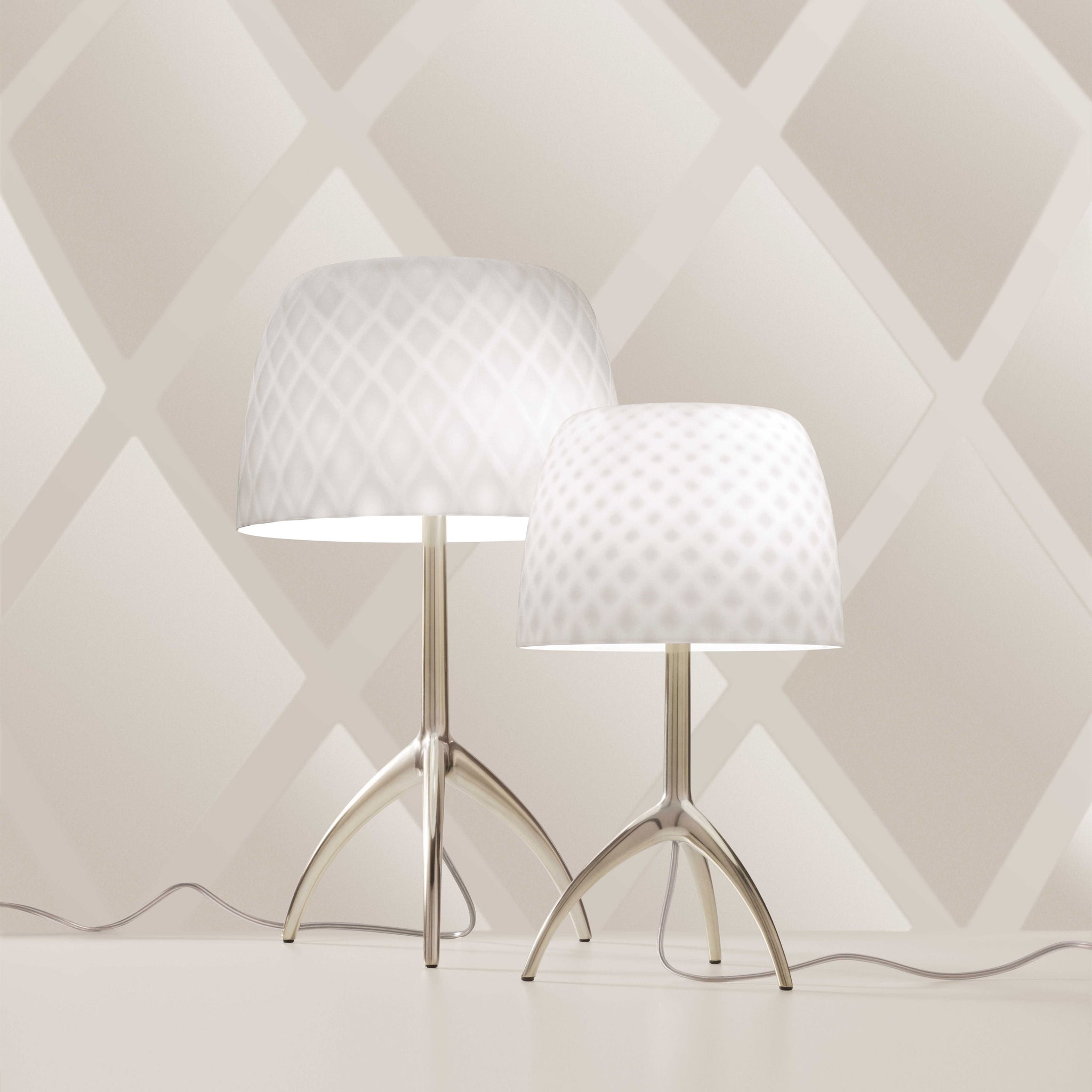 Multiple eras blend as one with this Lumiere 30th Table Lamp from Foscarini. The white lampshade with a geometric pattern and tripod makes an eye-catching impression in any living space or master suite.