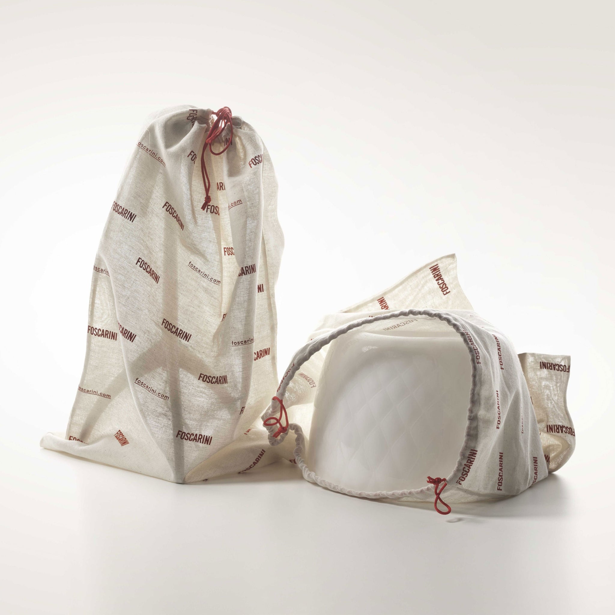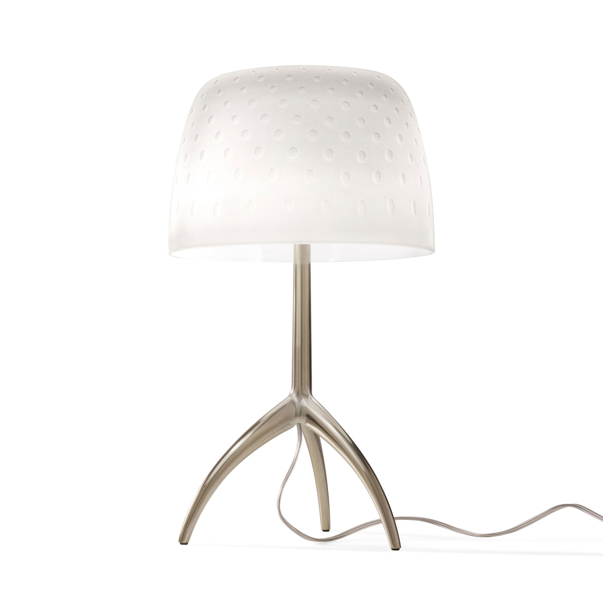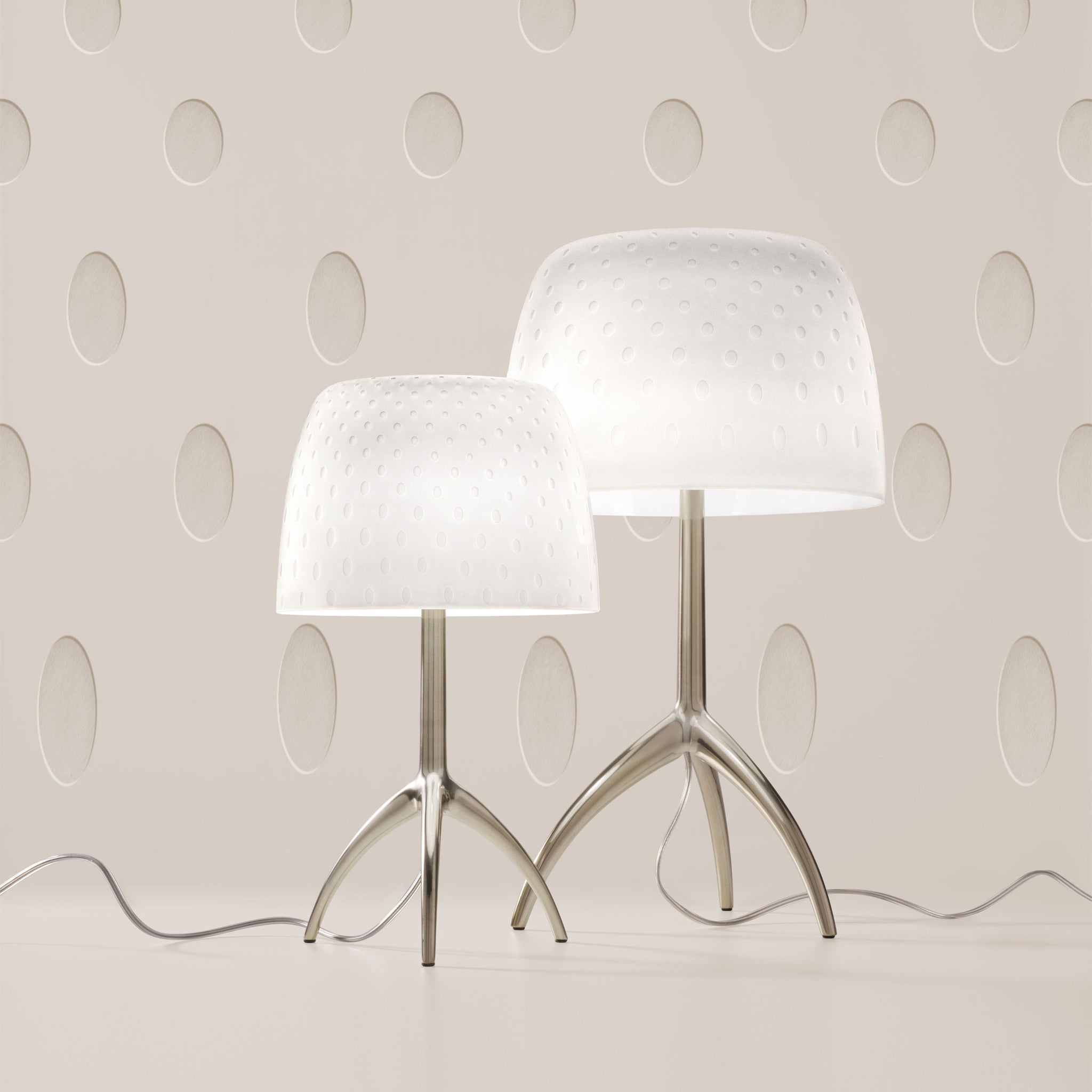 Multiple eras blend as one with this Lumiere 30th Table Lamp from Foscarini. The white lampshade with a geometric pattern and tripod makes an eye-catching impression in any living space or master suite.