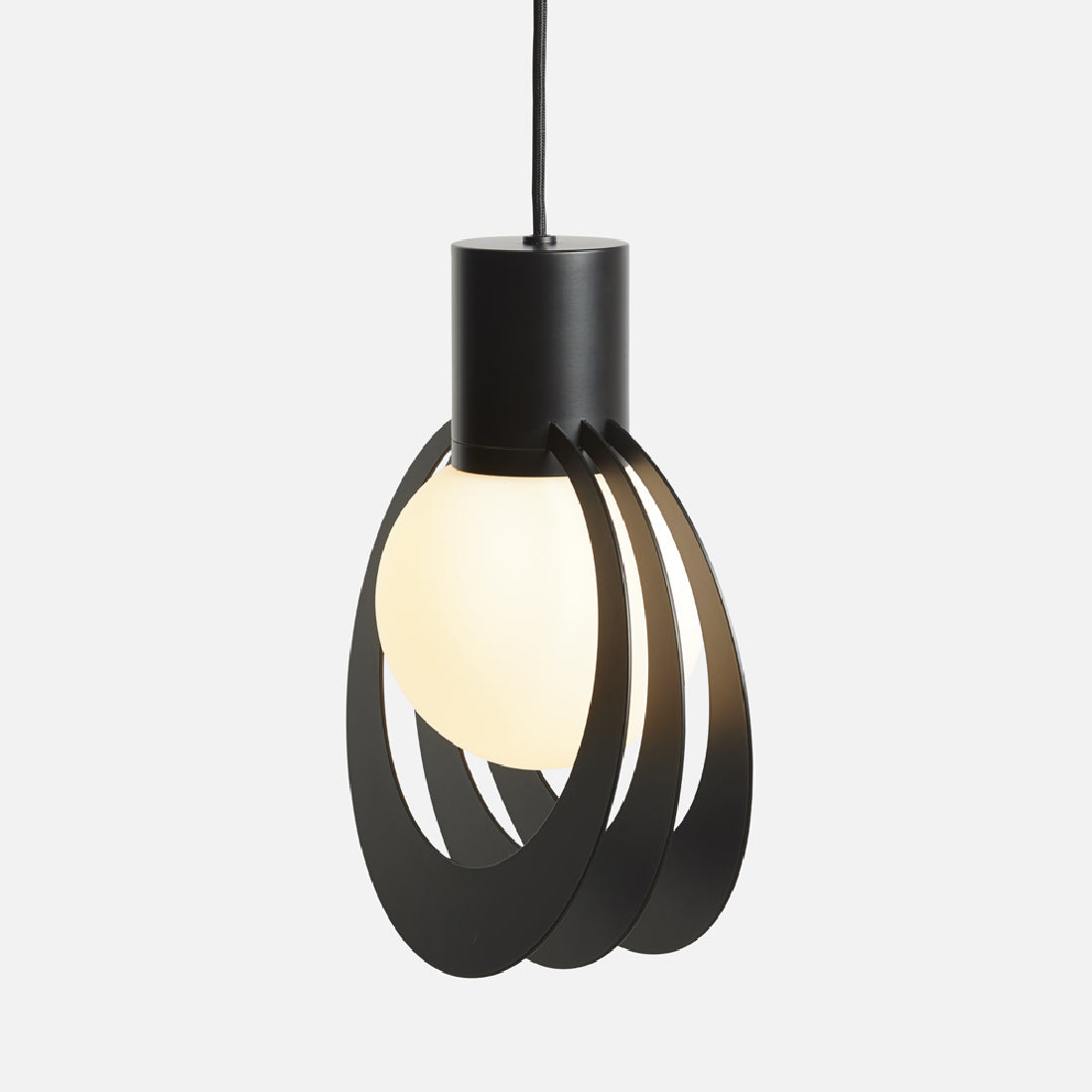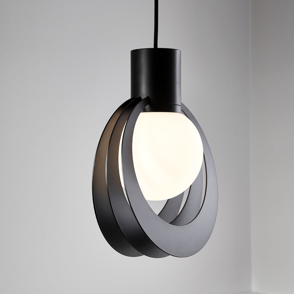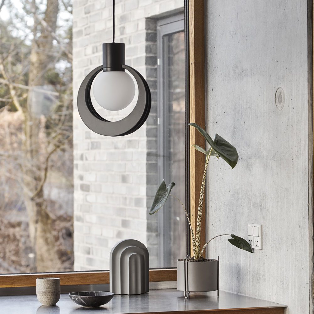 Bring the mystique of moon-inspired design to a classic custom space with lighting that blends solar style with architectural precision. Black metal framing in a trio of layers is bold and energy-inducing in the Lunar Pendant Light from WOUD, with a cheeky opal glass round globe light offering distinctive renditions of lunar phases interpreted at different angles.