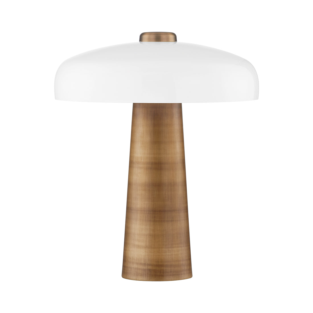 A study in contrast brings a nouveau twist to the Lush Table Lamp from Troy Lighting, an elegant and yet rustic source of lighting ideal for bedrooms, foyers, and living rooms. Admire the mushroom silhouette offering a hint of botanical artisan style, as an opal glossy shade tops a conical body showcasing patina brass finish metal.