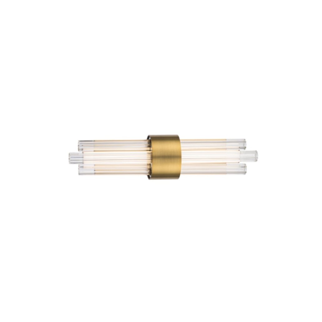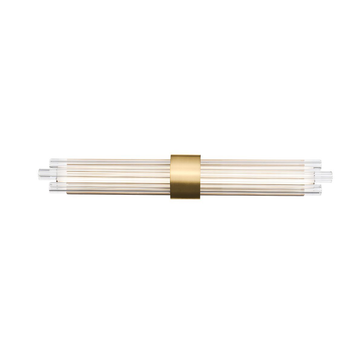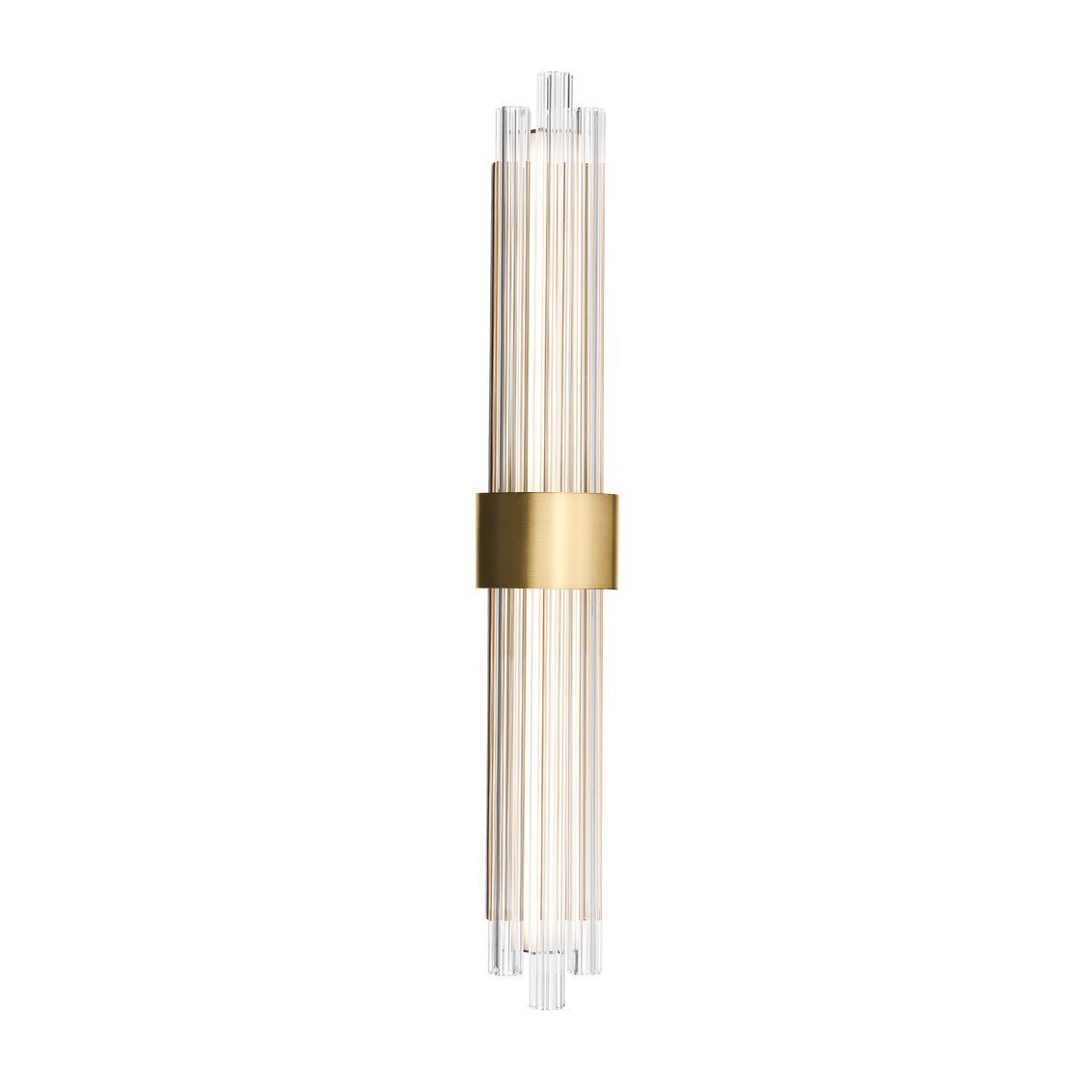 Fluted glass cylinders are nested together creating a striking prismatic effect. Substantial aged brass hardware complement the delicate crystalline elements elegantly. The textural juxtapositions raise the bar for lighting design. Advanced ACLED technology helps achieve a clean architectural look.