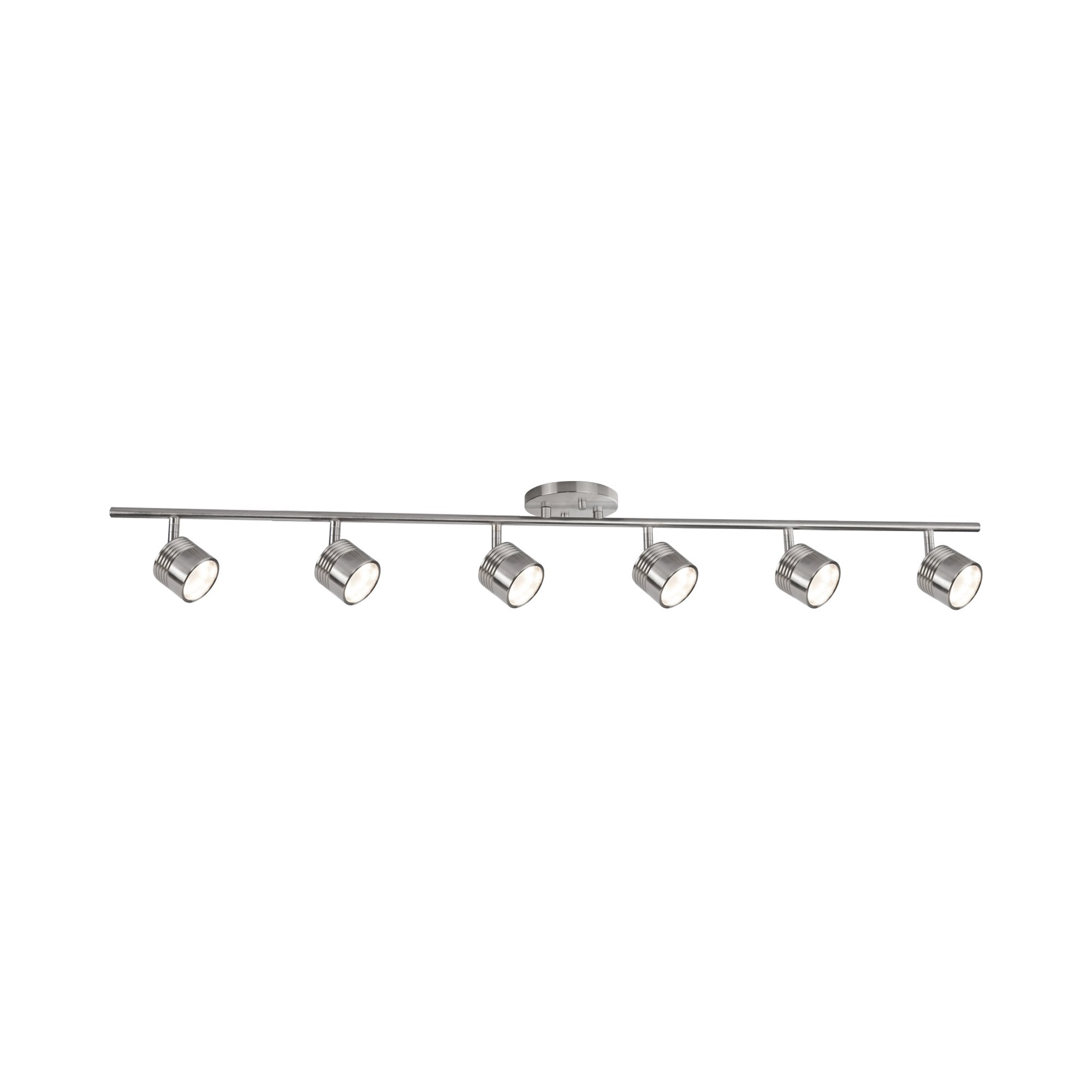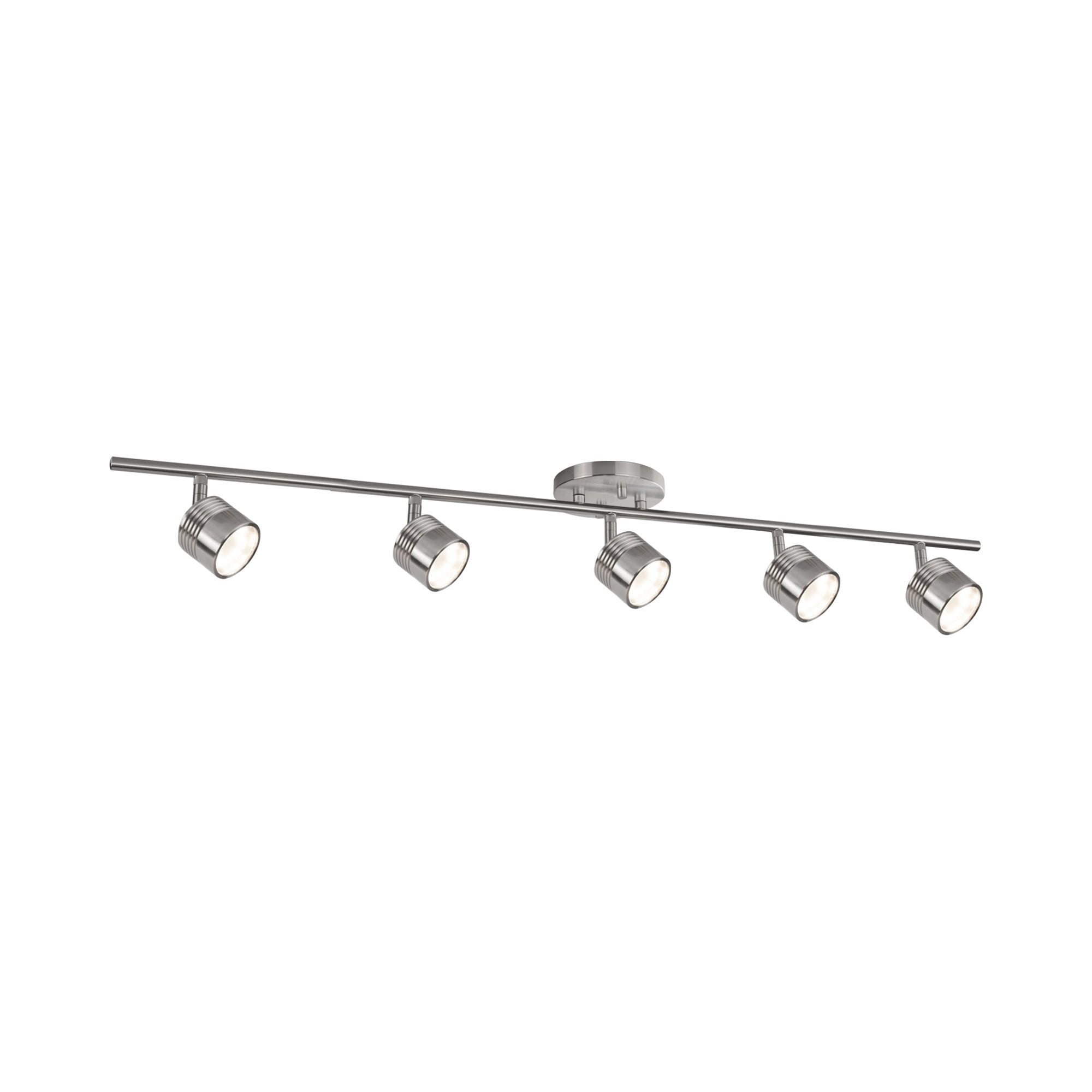 Modern LED fixed track fixture with five die cast aluminum heads and frosted glass diffusers. Each head rotates horizontally 360 degrees and pivots vertically 90 degrees allowing the lights to be directed to any desired angle. Metal finishes available in fine brushed nickel or enriched deep bronze and is equipped with our powerful 120V AC LED technology, 10W, fully ELV, TRIAC. Available in single, three and four head fixtures see series for full details.