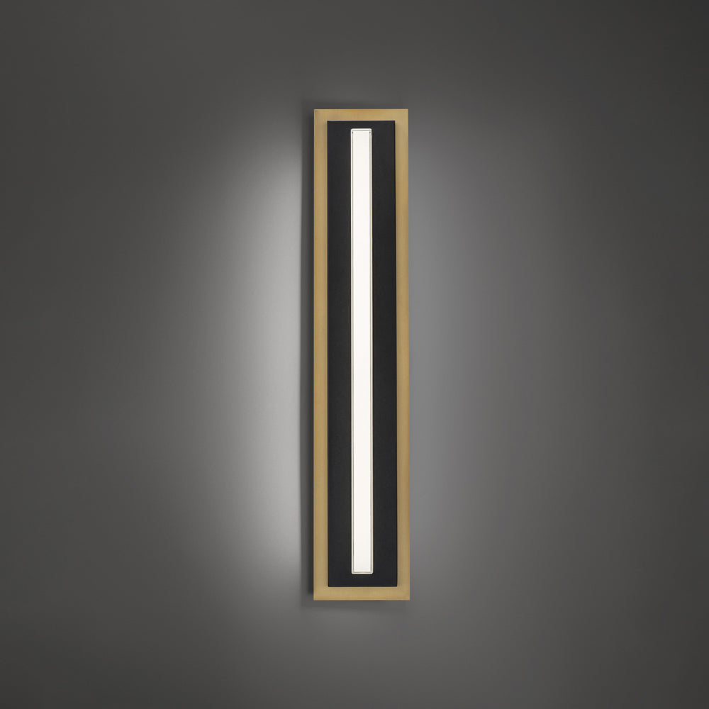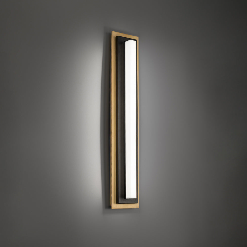 Layered bars of metal and glass create a crisp, straight-lined silhouette for the impeccable Lyrikal LED Wall Light from Modern Forms. A base in aged brass is paired with black and topped with a long, linear glass diffuser with LED lights tucked within for glowing, energy efficient illumination that lends superb elegance and ambiance to your living or dining room.