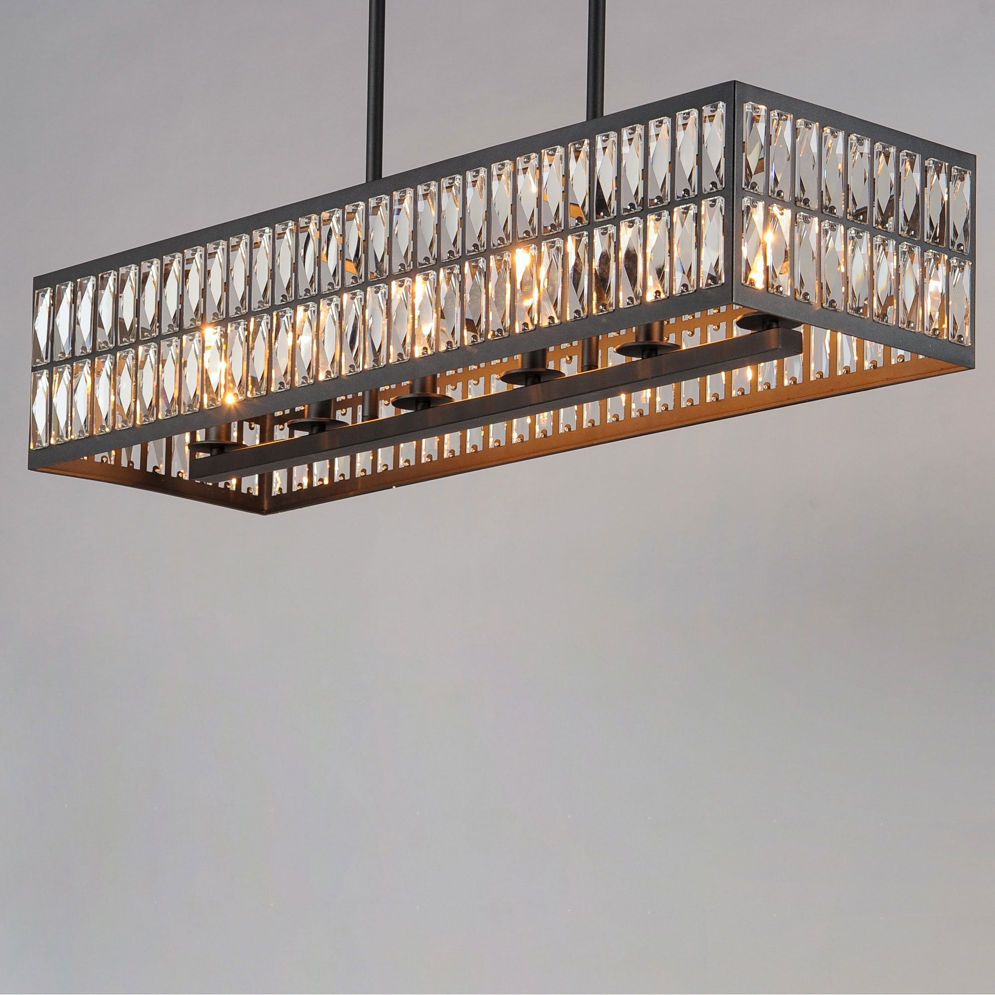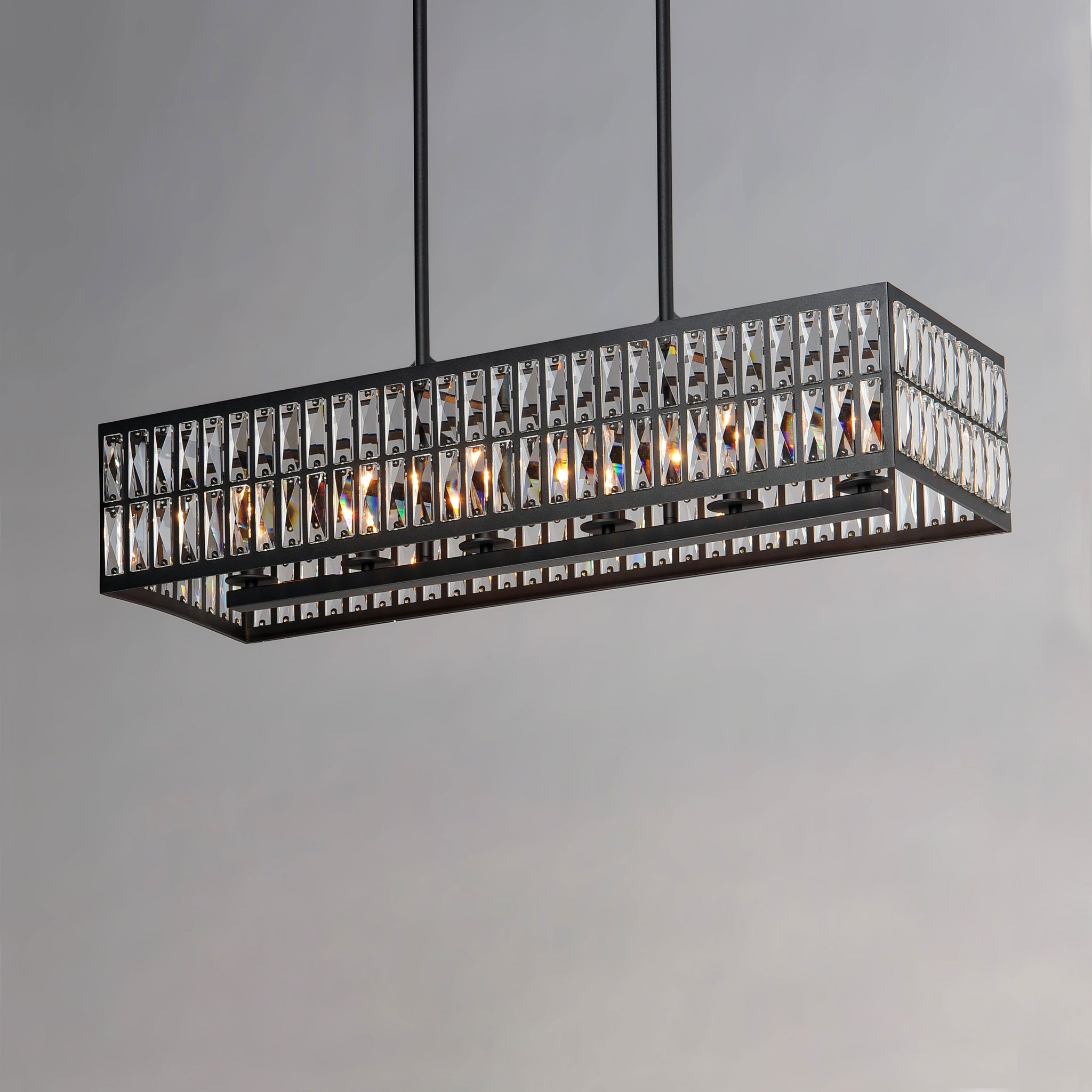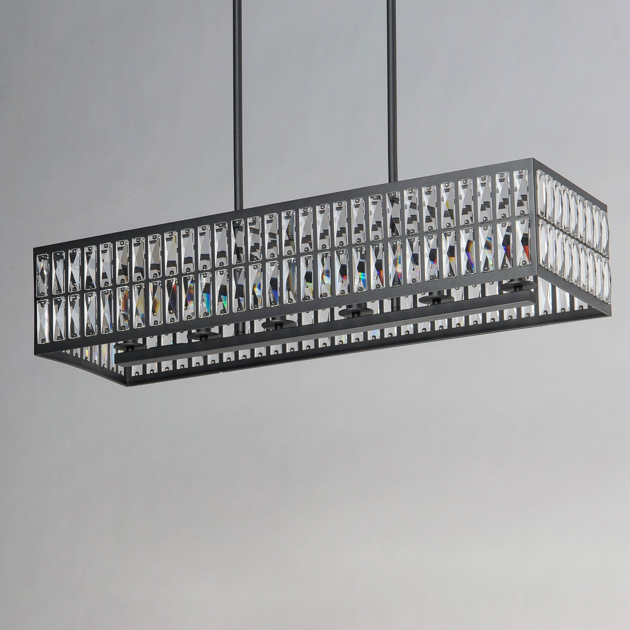 Glamorous and refined, the Madeline Linear Suspension Light from Maxim Lighting features a rectangular-shaped frame bejeweled with dazzling and light-refracting crystals that elevate a dining table or high-top kitchen bar.