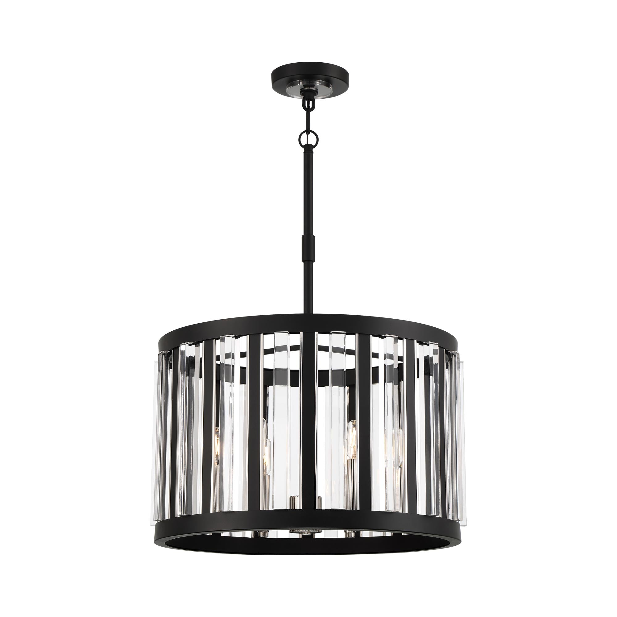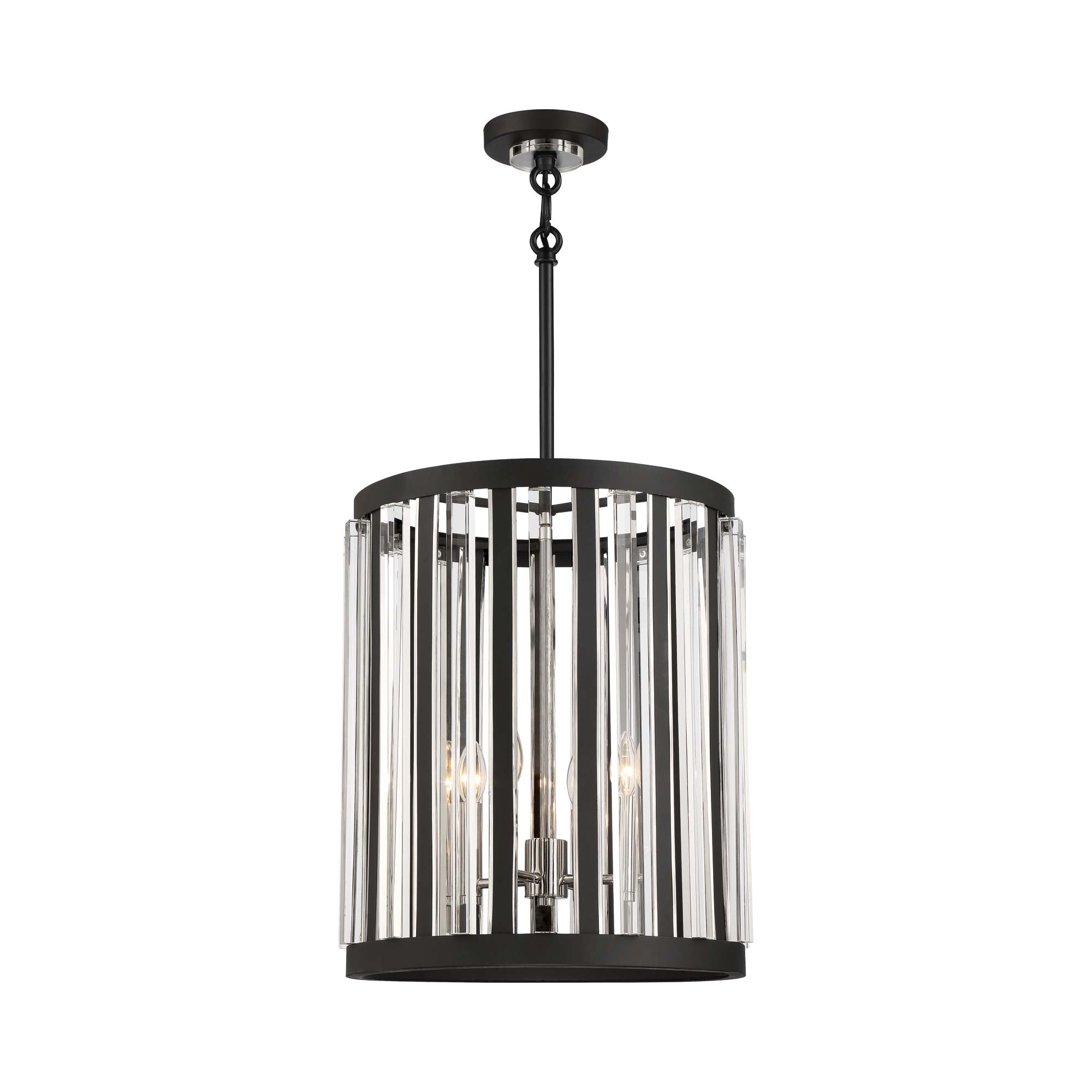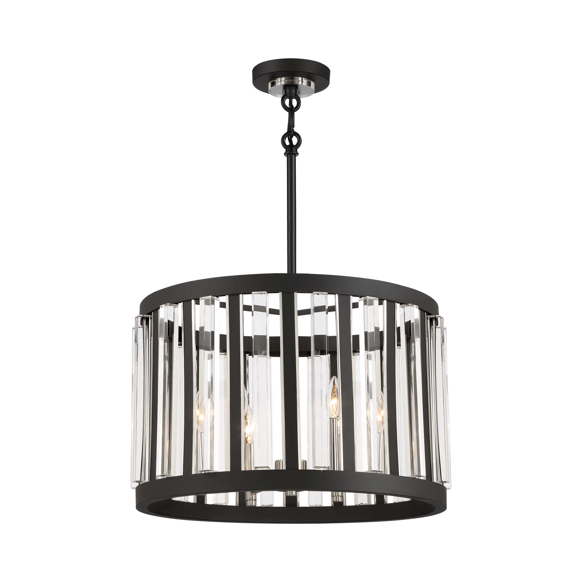 Contemporary lines and a classic cage-like frame make up the Majestic Splendor Drum Pendant Light from Minka Lavery. A drum shaped cage in a sand coal finish features a series of narrow windows, accented by a slim clear acrylic panel that distorts the illuminated interior. A polished nickel candelabra inside offers a clean cool tone that contrasts against the black silhouette of the cage.