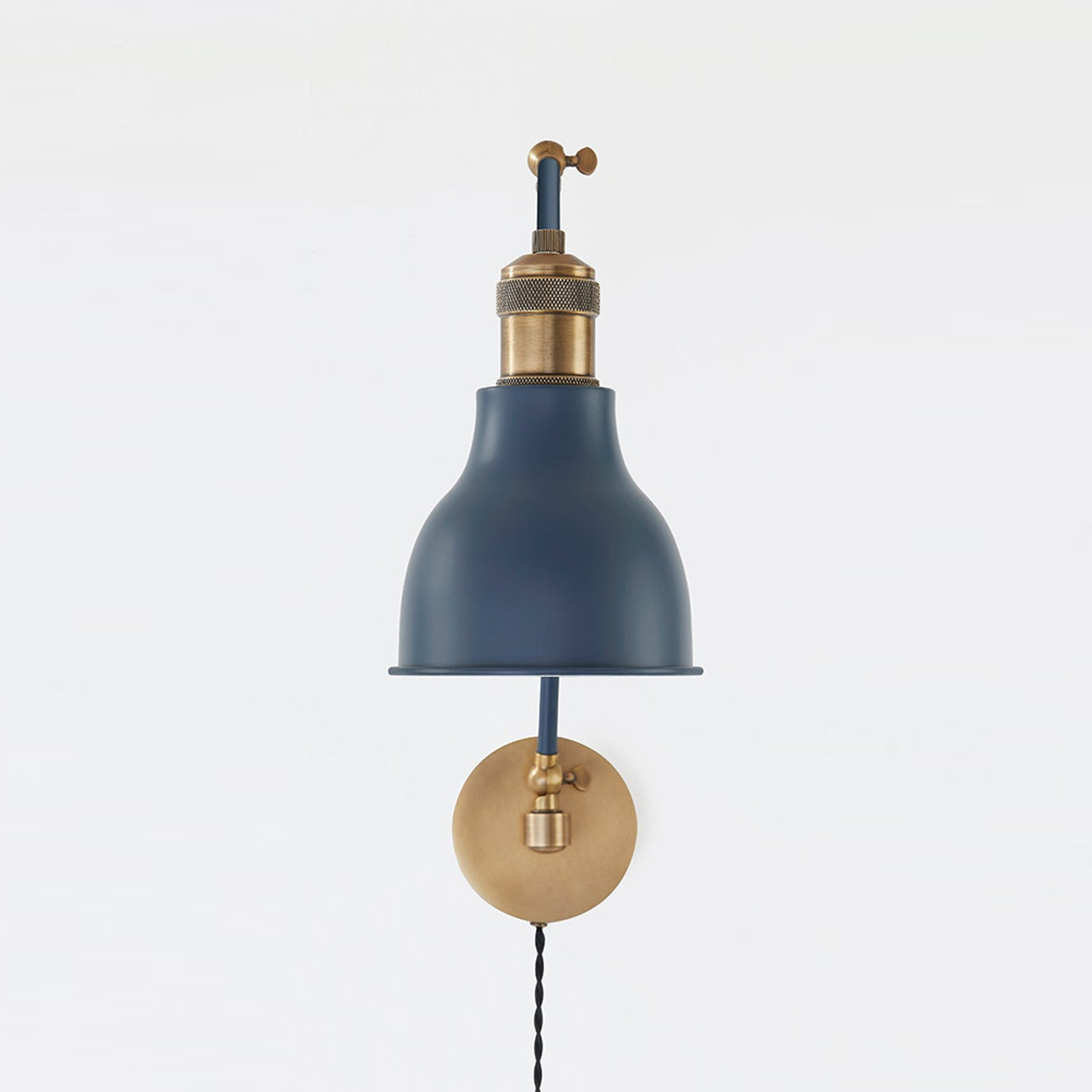 Timeless with a mix of farmhouse and industrial design motifs, the Makin Plug-in Wall Light from Troy Lighting takes illumination on the go and simplifies the concept of mobility. Embrace color with a subtle slate blue steel shade and white interior adding a twist, with rich, inspired patina brass creating a mount and knurled accents. Spotlight as needed to complete tasks or highlight decor.