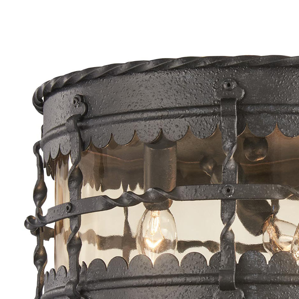 The Mallorca Outdoor Flush Mount Ceiling Light from The Great Outdoors puts conventional lighting designs on notice with its artisanal Renaissance motif. This stylish fixture features a drum silhouette framed in Spanish Iron textured black powder coat finish with no shortage of charming accents. Champagne hammered glass creates a romance-inspired shade giving a view of vintage influence with candelabra lights.
