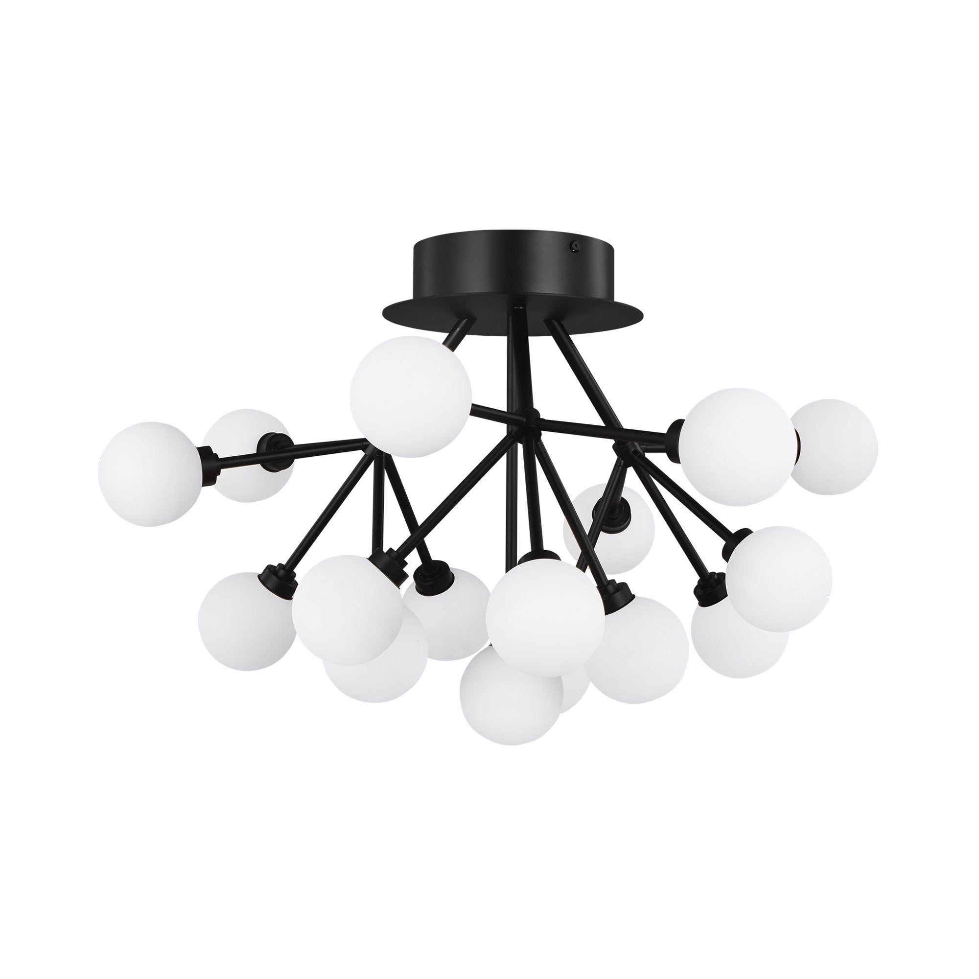The Mara LED Semi Flush Mount Ceiling Light by Sean Lavin for Visual Comfort Modern is a scaled down version of the chandelier with three arms extending clusters of frosted glass globes illuminated by a smoothly diffused LED light source. Offered with energy efficient integrated LED in three distinct finishes, the Mara Ceiling is a modern solution to your dining room, living room, bedroom and hallway. Complete the look with the Mara wall sconce, pendant and chandelier for full room coordination. Lamping options are compatible with most dimmers. Refer to Dimming Chart for more information.