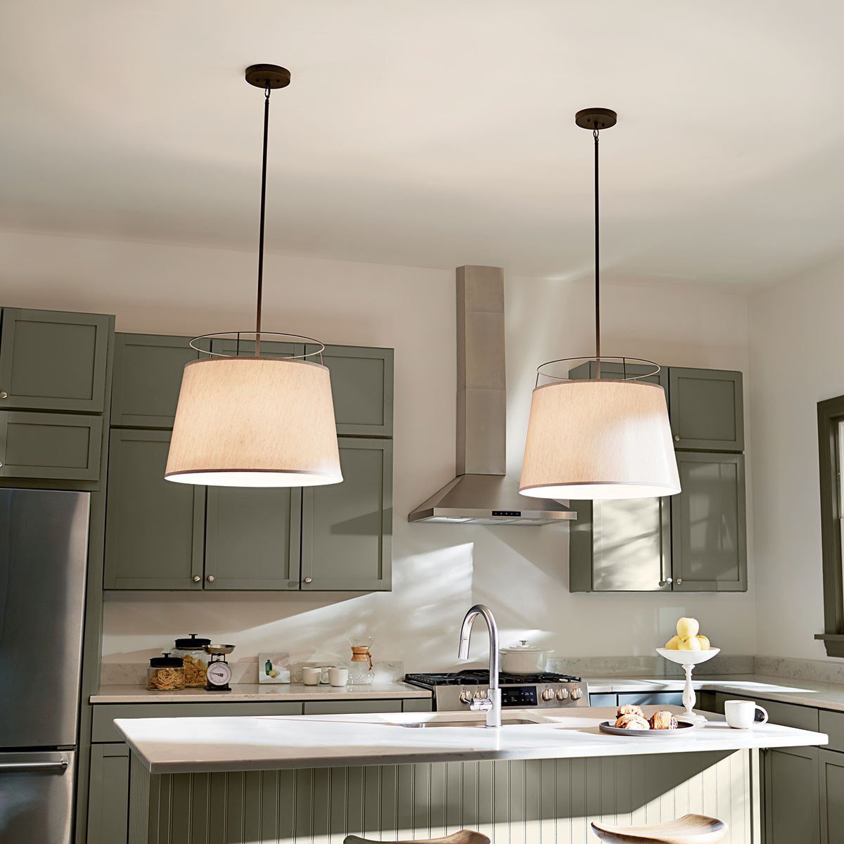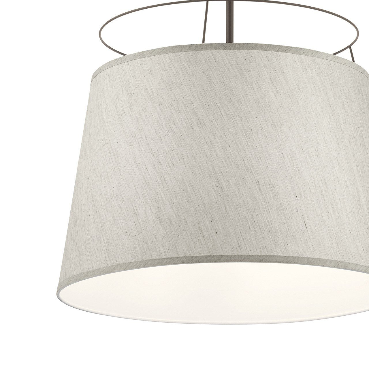 The Marika™ 20" 3 light pendant with grey linen shades in Olde Bronze finish. A perfect addition in several aesthetic environments, including traditional and transitional.