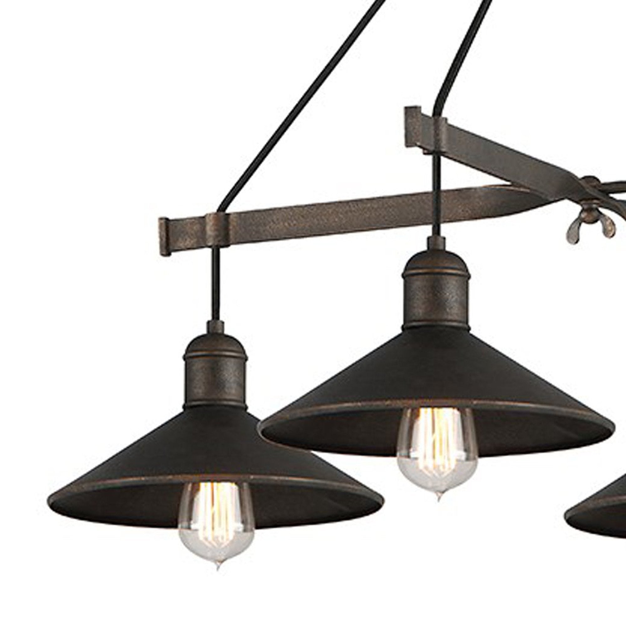 A floating effect embellishes the McCoy Chandelier four-light chandelier, a tasteful fixture offering four hat shades made of vintage bronze finish metal and a charming tied A floating effect embellishes the McCoy Four-Light Chandelier from Troy Lighting, a tasteful fixture offering hat shades made of vintage bronze finish metal and a charming tied rod design.
