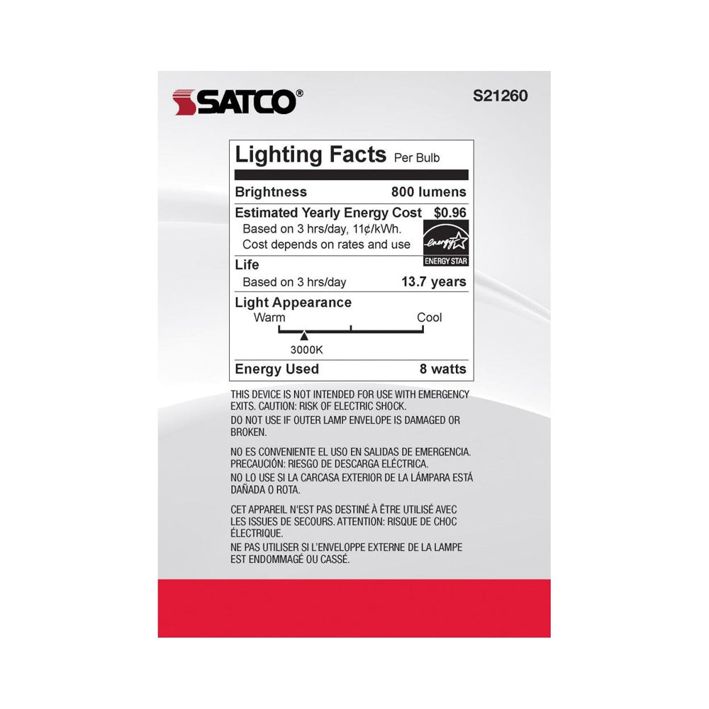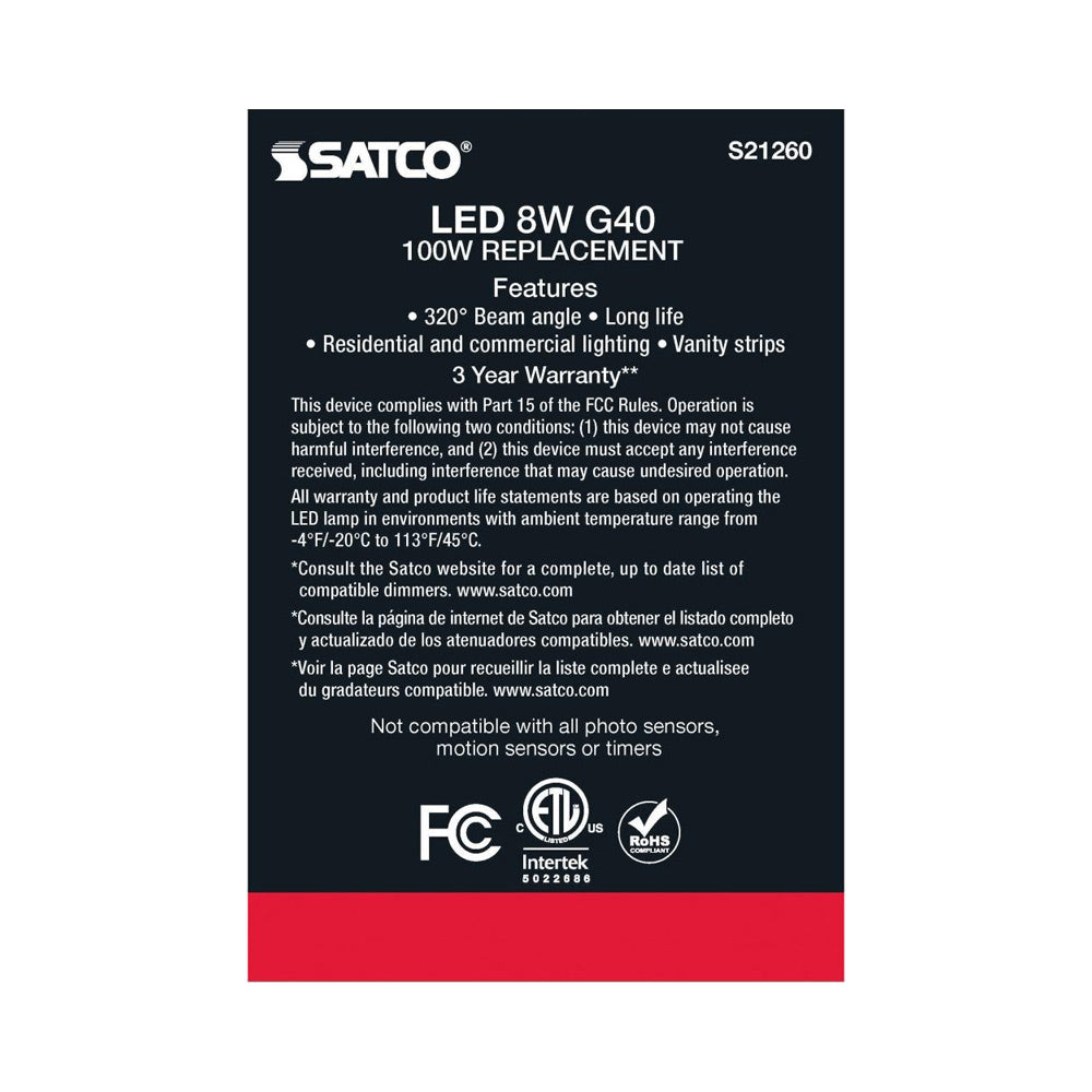 - 1 X 8W 120V E26(medium base) G40 LED lamp; 800 lumens, 90 CRI, 3000K