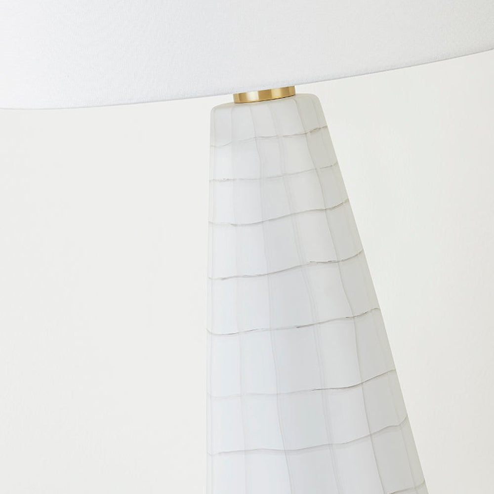 A hint of whimsy infuses the hand-painted Melinda Table Lamp from Mitzi. Its irregular grid pattern brings fresh, modern flair, while a soft satin white finish and classic conical silhouette pair to perfection. A drum shade and warm aged brass finish hardware details complete the look with refined energy and elegance.