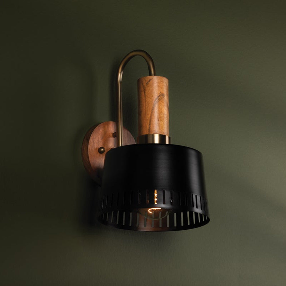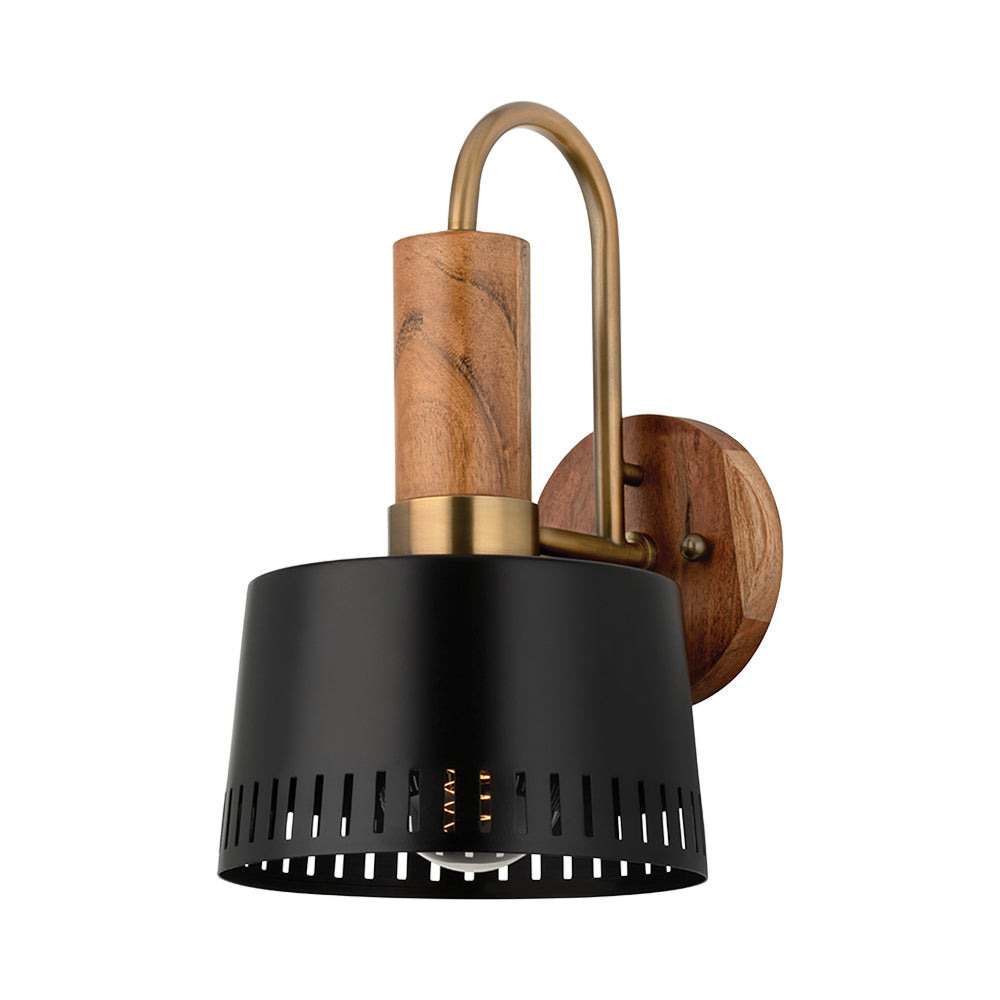 The Memphis Wall Light from Troy Lighting focuses on attention to detail, resulting in a bold and inspired personality ideal for any setting. Iconic finishes of black and patina brass fashion a stately look with a perforated metal shade. The powerful punch reflects in a cylindrical element made of earthy acacia wood, adding texture and dimension to embellish a classic light.