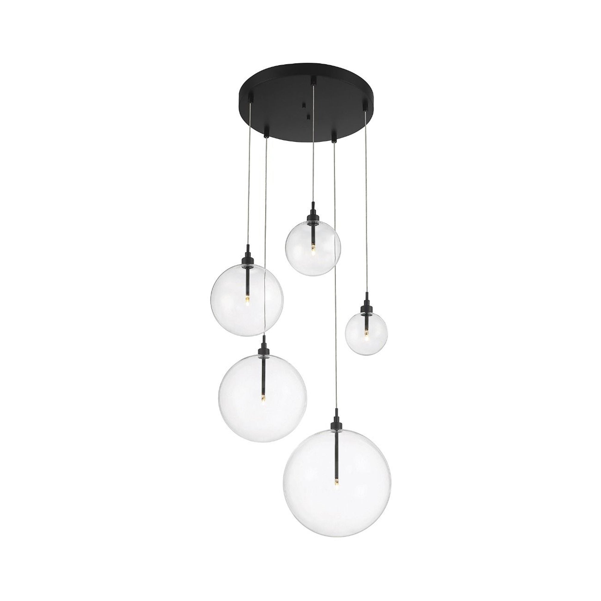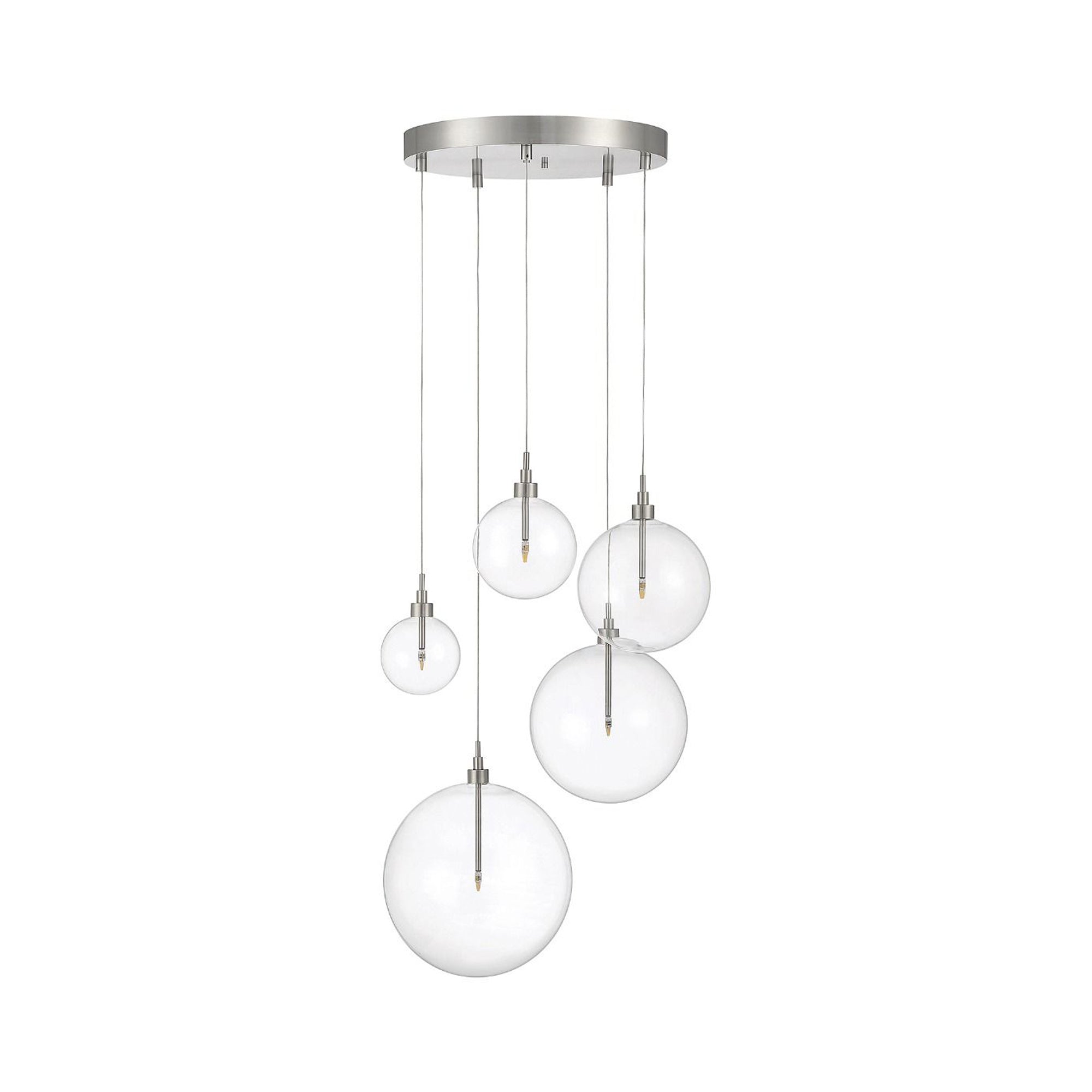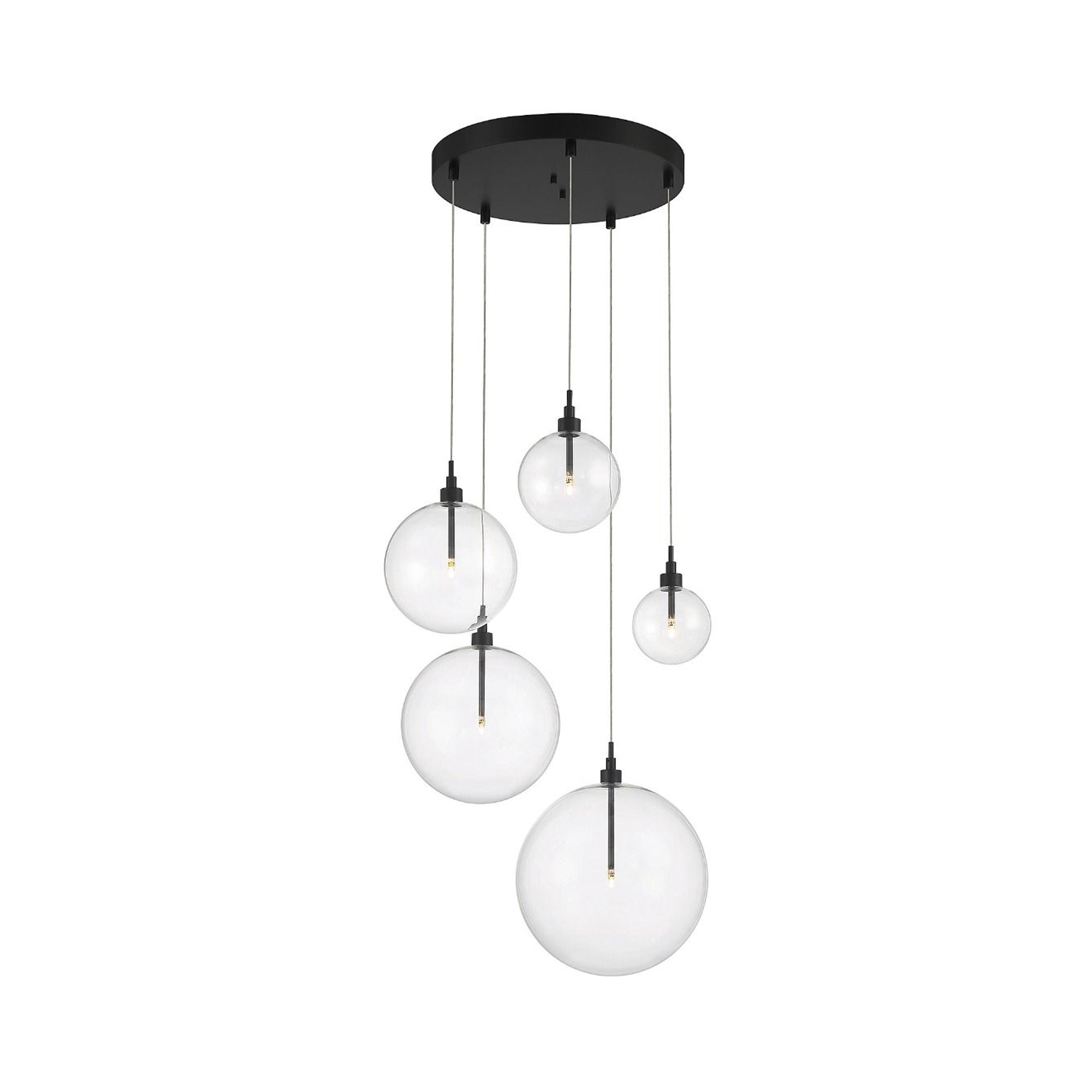 Enchanting design elements offer up a delicate elegance in the Meridian M10099 Multi Light Pendant Light from Savoy House, delivering artisanal glam and sleek sophistication. Gleaming light infuses through multiple sizes of clear blown glass orbs that suspend at graduated heights from a basic canopy, understated to maintain focus on bubble-like shades. Adjust cable heights to achieve a customized configuration.